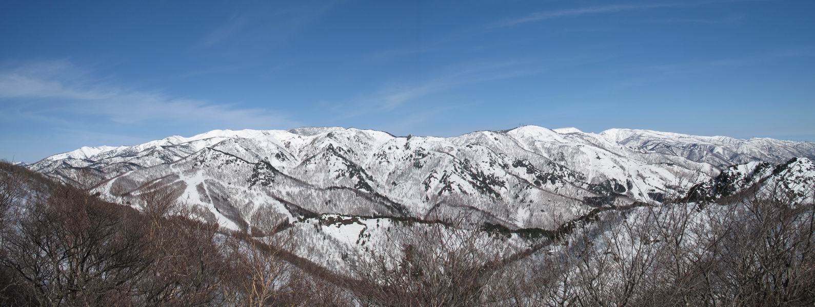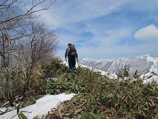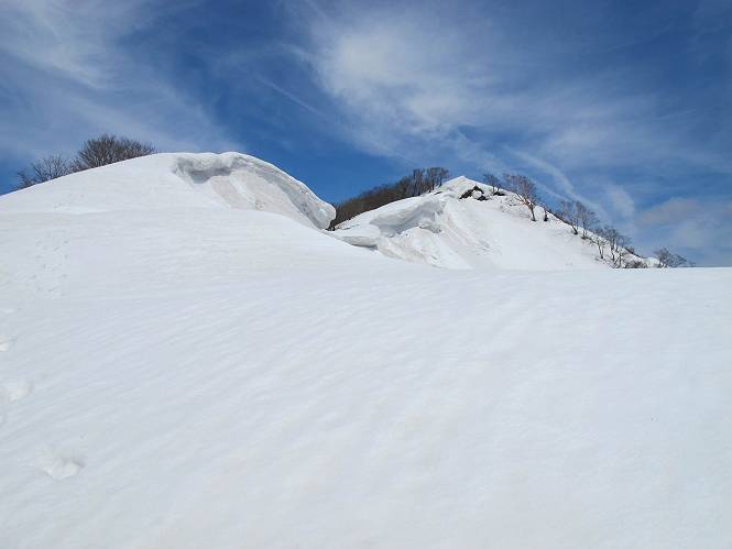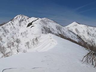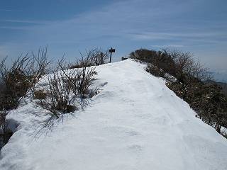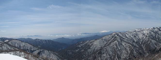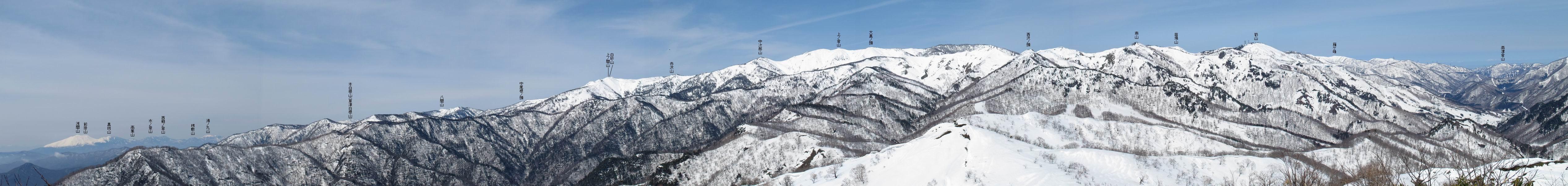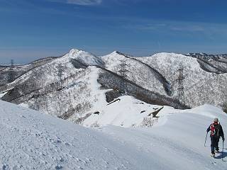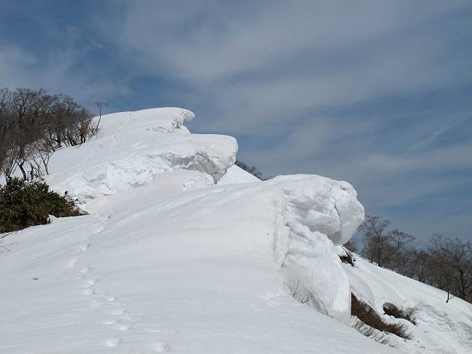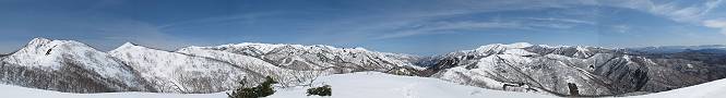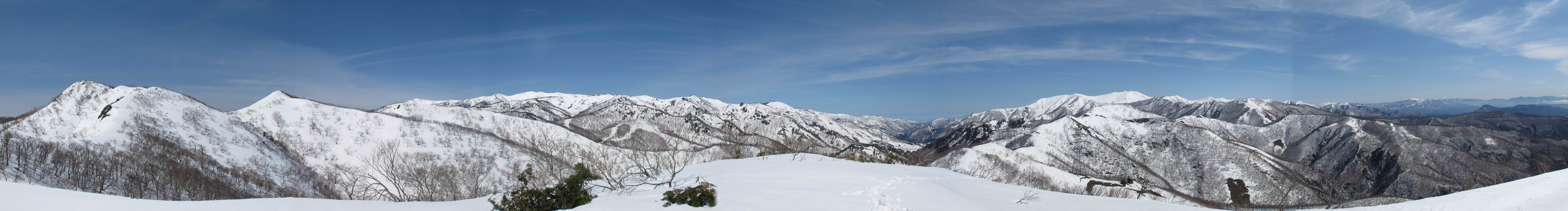 | 後編 前編へ戻る キワノ平ノ頭からしばらく雪庇の道をアップダウンを繰り返し進み、送電線の鉄塔目指して下る。送電線はほぼ鞍部にあり、三国峠から3番目と4番目の鉄塔である。1/25000地形図で山歩きする場合、送電線の位置が目印となり便利である(電子国土には記載されてない)、が反面、特にこの2系統の送電線と鉄塔は景観を阻害している。写真を避けてみたが、まともに入ったものもあった、コベックラ沢分岐(3番目の鉄塔)8:56通過、No.180鉄塔分岐(4番目鉄塔)9:06通過。P1461を下った所で先頭の交代、といっても私が先を歩きたかっただけ。気温が上がり雪が緩んできたせいか、最後の登りで、ズボズボはまってしまった、10:26稲包山山頂着。 キワノ平ノ頭から進む斜面には大きな雪庇ができていた、 雪庇と榛名山 雪庇と赤城山 大きな雪面には風紋が残っていた、 雪面の模様@ 雪面の模様A ![]() 見渡す西側の峰々、白砂山、筍山、苗場山 画像クリック拡大 ![]() 北〜東の峰々、平標山〜赤城山、と歩いてきた尾根筋、 画像クリック拡大 ![]() 南東方向の峰を遠望、錫ケ岳〜子持山 画像クリック拡大 緩やかに上る雪庇、稲包山と西稲包山の間に浅間山が顔を出す 稲包山と西稲包山の間に浅間山、3番目の鉄塔近し 雪庇から落ちた雪だるま、雪庇崩落のメカニズムか 榛名山遠望、左から二ツ岳、相馬山、少しあいて榛名富士、鬢櫛山、掃部ケ岳 雪庇が大きく発達していた 恐る恐る先まで行ってきた 雪庇と赤城山遠望 下り 大きな崩落がこれから? 登り返す また下る、手前が3番目、奥が4番目の鉄塔 北側斜面は樹林帯 巡視路分岐、 3番目の鉄塔通過 少しおいて4番目の鉄塔通過 4番目の鉄塔から武尊山、日光白根山、錫ケ岳、左下は3の系統 ![]() 鉄塔を過ぎて鞍部付近から稲包山〜袈裟丸山 画像クリック拡大 ![]() 同、平標山〜袈裟丸山 画像クリック拡大 小稲包山(稲包山手前のピーク)登りに入り先頭タッチ 後方からtomoさん 稲包山山頂直下 あと一息で山頂 稲包山山頂到着 山頂からの眺望@ 浅間山〜苗場山 画像クリック拡大 以下5枚は関連 浅間山周辺 浅間山、黒斑山 白砂山周辺 忠次郎山、上ノ倉山周辺 苗場山、筍山周辺 山頂からの眺望A 平標山〜日光白根山 画像クリック拡大 ![]() 山頂からの眺望B 平標山〜袈裟丸山 画像クリック拡大 以下4枚は関連 平標山、仙ノ倉山周辺 大源太山、エビス大黒ノ頭、万太郎山周辺 谷川岳、至仏山周辺 武尊山、日光白根山 ![]() 山頂からの眺望C 榛名山〜浅間山周辺 画像クリック拡大 以下4枚は関連 榛名山周辺 四万湖周辺 浅間隠山周辺 浅間山周辺 好天下、二人だけの稲包山、大気が大分ガスって視界が落ちてきた、帰路の道も長いので、11:11山頂を後にする。12:09コベックラ沢分岐、キワノ平ノ頭12:48-12:57、ここを出てクッキリした靴跡を発見、後から来た方が折り返したようだ。長倉山13:54-14:03、三国峠14:33小休止、どこからか人声がする、見上げると三国山の2名、峠の周りには歩き回った複数の跡、三国トンネルの群馬側から上ってきたトレースもあった。ジグザグしたルートをショートカットを繰り返し、三国トンネル(新潟側)駐車点14:59着。総所要時間は、10時間3分だった。 【帰り道】 山頂を後に細い尾根を下るのだが、 靴がズボズボ入っちゃって 平標山、仙ノ倉山、エビス大黒ノ頭、万太郎山、一ノ倉岳、谷川岳 武尊山、日光白根山、錫ケ岳 至仏山、笠ケ岳 苗場山周辺 画像クリック拡大 絶景を眺めながらのアップ & 絶景を眺めながらのダウン 雪庇、往路で見たときより多少丸くなったかな、後ろは平標山、仙ノ倉山 雪庇 稲包山を振り返る 稲包山を振り返る 雪庇の道が続く 鉄塔も気にすれば気になるが・・・・・・ 三国峠から4番目の送電系統 三国峠から3番目の送電系統 雪庇 雪庇 雪庇、崩落近し? 稲包山を振り返る、キワノ平ノ頭付近から キワノ平ノ頭まで戻る、小休止 キワノ平ノ頭の南斜面、滑り落ちてボコボコしていた キワノ平ノ頭付近から三国山までを見通す、左から平標山、仙ノ倉山、大源太山、三国山 雪庇と平標山、仙ノ倉山、大源太山 雪庇と三国山 丸くなってしまった雪庇、間のクラックあったかな? このクラック、往路はなかったような気がする 三国山を一望する 画像クリック拡大 三国峠から2番目の送電系統まで戻る ヒッコラ上って、 長倉山 崩落の進んだ道が続く、ヤブに入ったり出たり ここも、ヤブに入らないと? 三国峠を真下に見る、後ろは三国山 三国峠から1番目の送電系統と三国峠 三国権現到着 シリセードの2名、楽しそう 三国峠からジグザグの登山道をショートカットして下る 旧三国街道沿いの道祖神に迎えられて無事ゴール 天候に恵まれ、朝のうちは少し風があったが、暖かく、快適な山行ができた。コースとしては距離とアップダウンの連続、雪庇を気にしながらの山歩きで、決してラクではなかったが、写真を撮るのに立ち止まっていた時間が長かったので、疲労感はあまり感じない。日に焼けた顔と目、が少々気になる。2007年11月3日に、こ