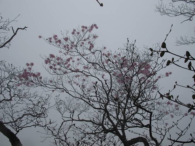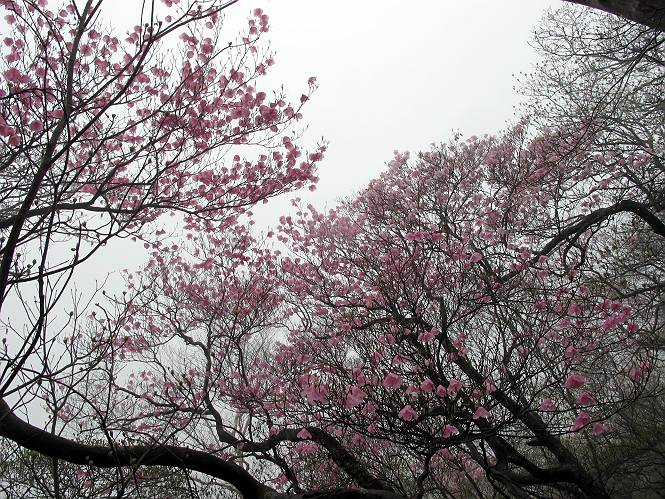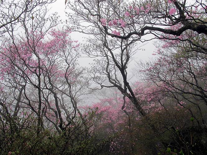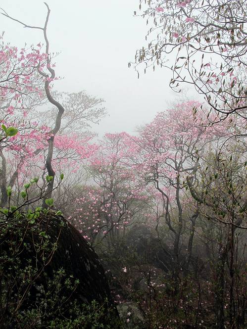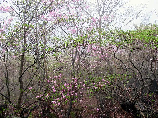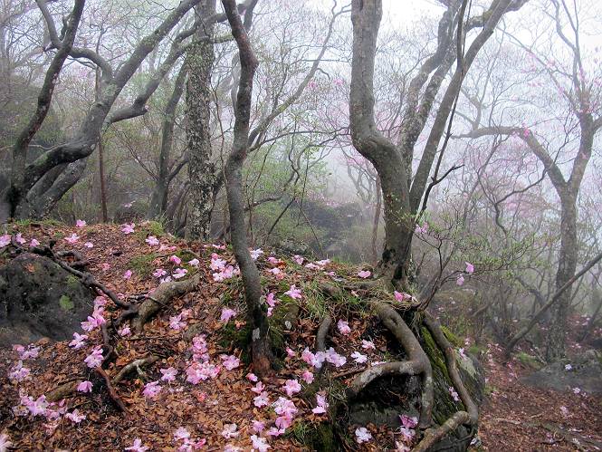 | 散策日 2011年5月24日 曇り 2名 濃い霧の中を鳥居峠北側の篭山に踏み入れた。4日前のあの華やかな光景は、大きく変っていた。使命を終えたピンクの大きな花が雨に打たれ叩きつけられた様、そっと脇を縫って通り抜けてきた。 青空と覚満淵を背景に、それも良いが霧に包まれた柔らか光景、また安らぎを覚える。これも 恵みの雨で一気に芽吹いた木々の葉、対照的な落ちたアカヤシオ花びら、また大地へ。 |