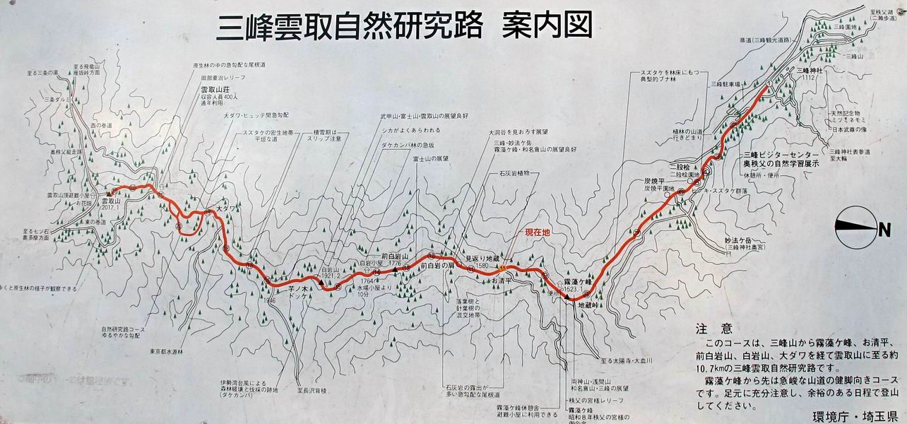 地蔵峠は三峰神社から3.5km、雲取山まで7.2kmの位置にある。ここから少し上ると霧藻ケ峰に出る、7:46三角点、7:53霧藻ケ峰休憩舎着。関東北部の山並が遠望できる所だが、今日は薄っすら雲のかかる両神山、榛名山、赤城山のみ、両神山の後に位置する浅間山も裾野の雪が見えるだけ。谷を隔てて近い和名倉山だけが光る。また大きな岩に秩父宮殿下のレリーフがあり、命名の由来など書かれている。同案内板でこのルートの植生を説明している、興味あるところ。
