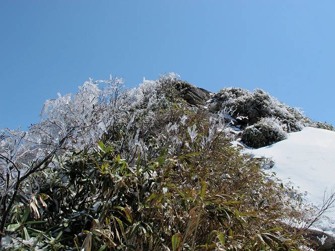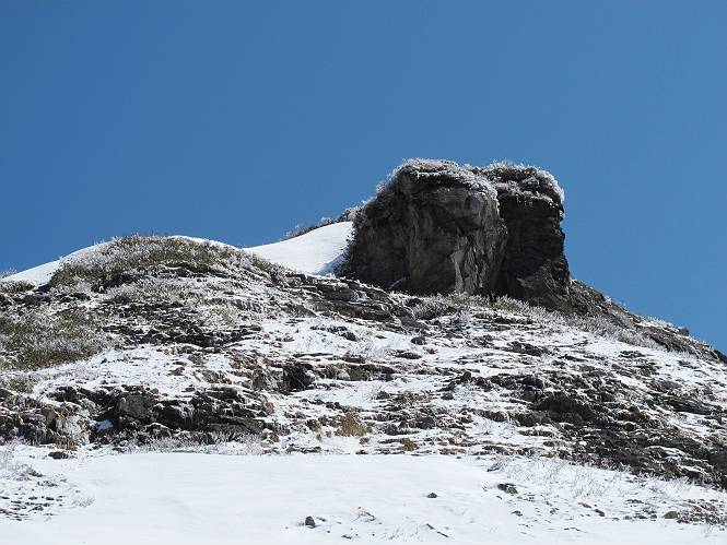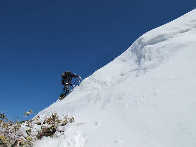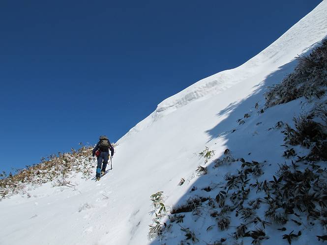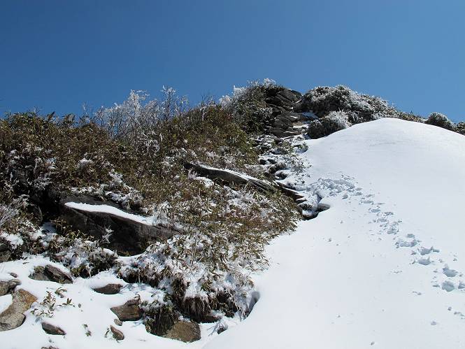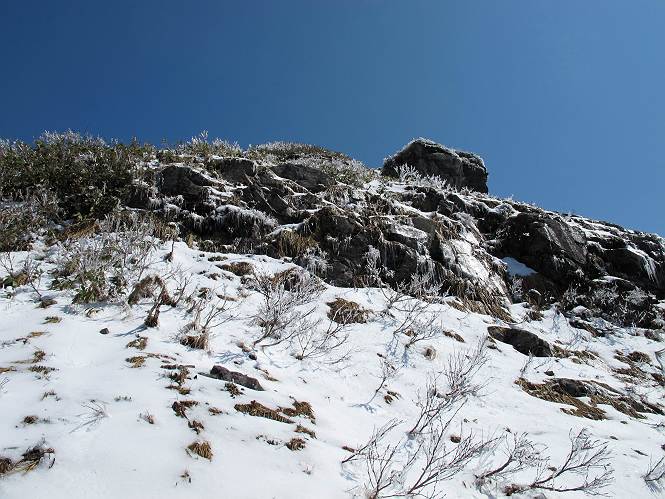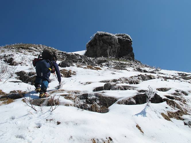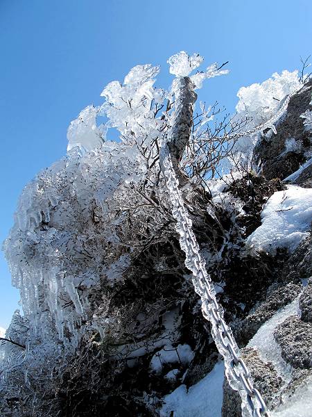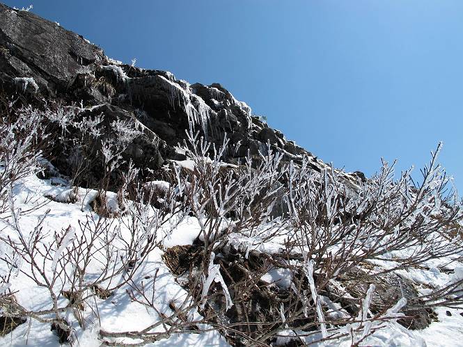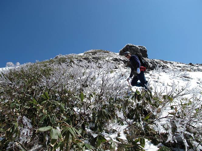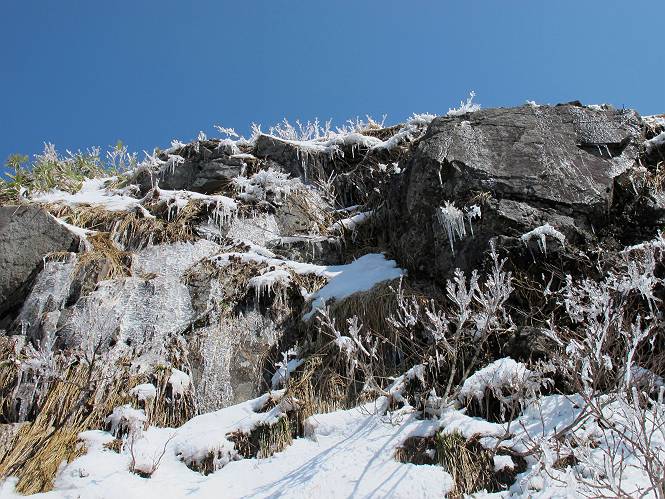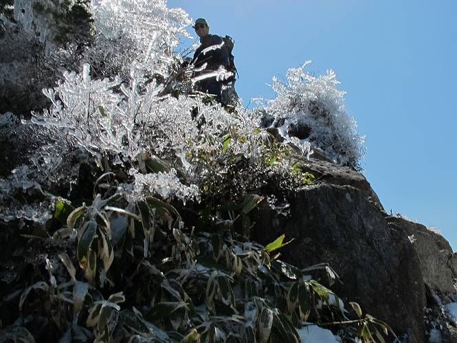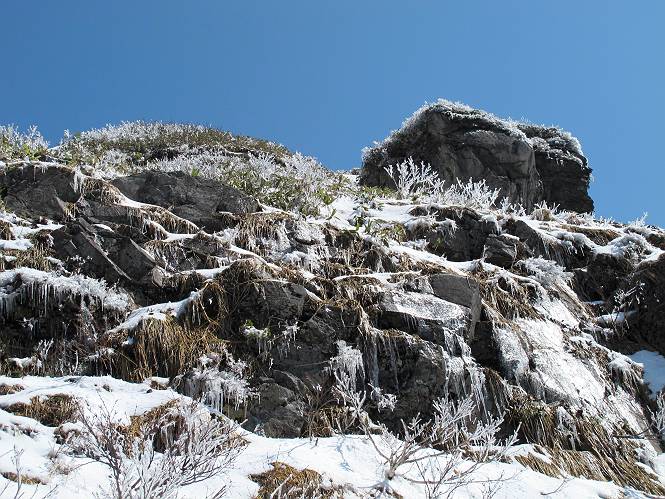 | 3.白毛門⇒土合橋駐車場 1.土合橋駐車場⇒松ノ木沢の頭(TOP) 2.松ノ木沢の頭⇒白毛門 松ノ木沢の頭を発って、上天気なので見た目は、山頂まで目と鼻の先。と思ったら、とんでもない、夏道と大違い。要注意ヶ所が数ヶ所ある、その都度緊張が走った。でも、今日の景色が直ぐに緊張から解放してくれる、素晴しいことだ。到底一人では入り込めない白毛門、何と言っても経験がものをいう山頂部である。凍っていなければ、雪が少なければ、と思うなら雪が消えるのを待つことだ。山並と霧氷を堪能しながら、背筋に汗をかいたが、順調に進み、9:53白毛門山頂着。 この間で見た、谷川岳方面の写真 笠ケ岳方面の写真 霧氷の写真 松ノ木沢の頭から少々下って直ぐに登り返す 見上げる山頂部は岩峰のように見える ジジ岩、ババ岩の上に見える左手の大きな岩を注目する 緩やかに入り 勾配を増していく 岩場を回り込んで振り返る 松ノ木沢から大分進んだ 大きな岩に大分近づいたようだがまだまだありそうだ 霧氷が高度とともに大きくなっていく、大きな岩の上も霧氷だ ちょっとだけ、tomoさんの前を歩いてみた ここまで来ると霧氷が太さが1cmを超えている、見事だ トレースを辿りながら進むが、見失うこともある、消えている可能性もあるし、必ずしもベストで通過したとも思わない。岩の表面は完全に凍結しているので、草付きの斜面を選ぶ、とtomoさんは言う。 大分上ってきた、霧氷がきれいだ あの辺が要注意の岩場のようだ ツララと霧氷と、氷と・・・、 緊張が走る 写真では傾斜を感じないが、実際は・・・・ カモシカになって、四つんばいになることも、本日一番は美しいけれど、それなりの苦労が伴う でっかい岩まで来たぞ この岩、2匹の巨大ガマに見えませんか 岩の脇を通って、 雪の壁に沿って進み 乗り越えます、何ていっても角度が角度です、落ちないように。 上から覗き込むと、ジジ岩、ババ岩が下に見えます こちらは辿って来た尾根ですが、簡単そうに見えますけれど・・・・ 茂倉岳と武能岳の間に苗場山、神楽ケ峰、霧ノ塔 やっとここまで来ましたが、まだ先があります 笠ケ岳と烏帽子岳が見えてきました、スゴイ霧氷でしょう この向こうに白毛門山頂があります、ここまで来れば着いたの同然です 白毛門、笠ケ岳、烏帽子岳の稜線が見えてきました 画像クリック拡大 トンネル状に雪が残ってます、不思議な形をしてます 霧氷がきれいですね、 花を飾りつけたよう、鎖が見えますね 霧氷の間を通って鎖のある大きな岩に上って行きます カッコイイですね、tomoさん あっ! くサリが凍っている、アクリルで包み込んだよう、キレーイ 山頂の山座同定板が見えました、右から回り込んで 山頂到着です、お疲れ様でした、というところかな この間で見た、谷川岳方面の写真 笠ケ岳方面の写真 霧氷の写真 3.白毛門⇒土合橋駐車場 1.土合橋駐車場⇒松ノ木沢の頭(TOP) |