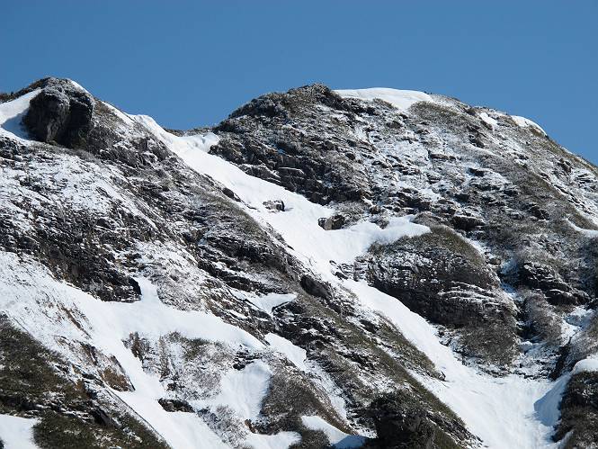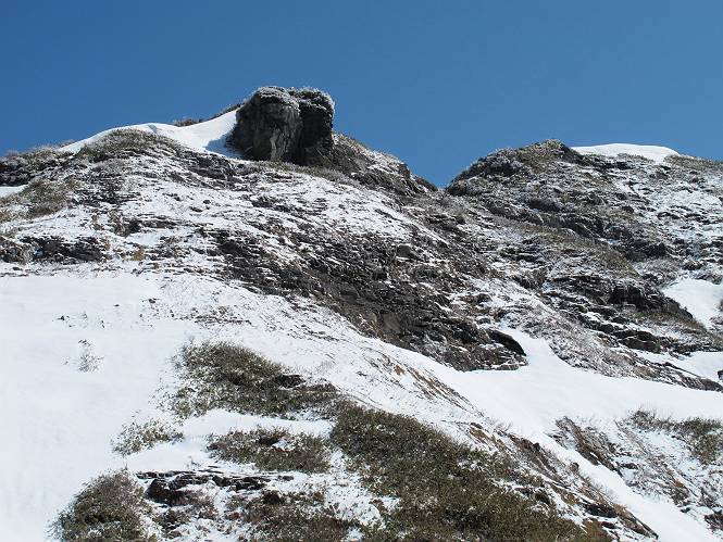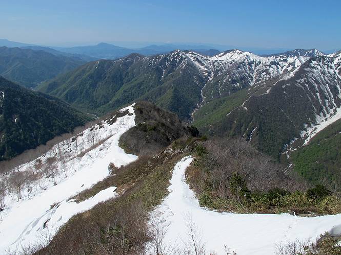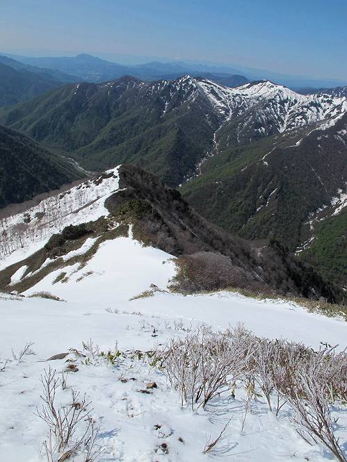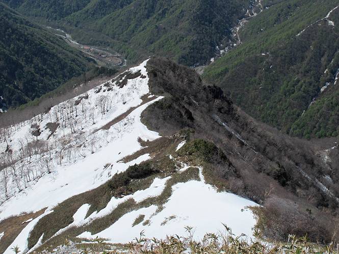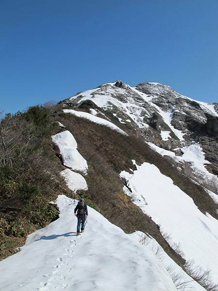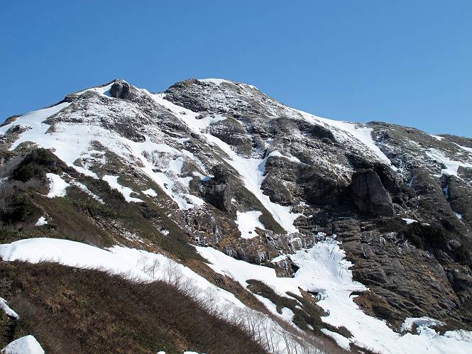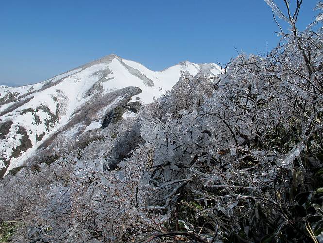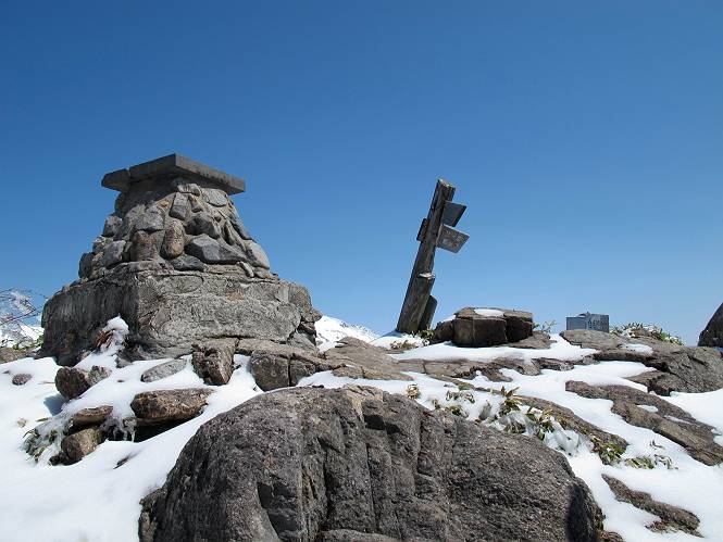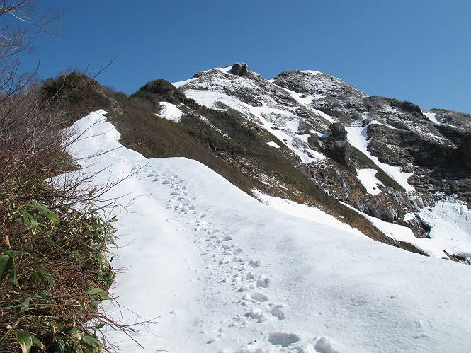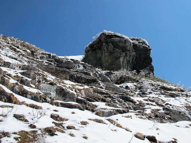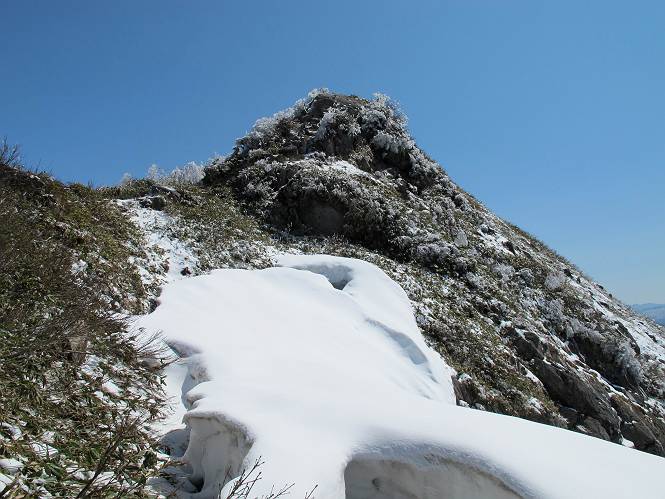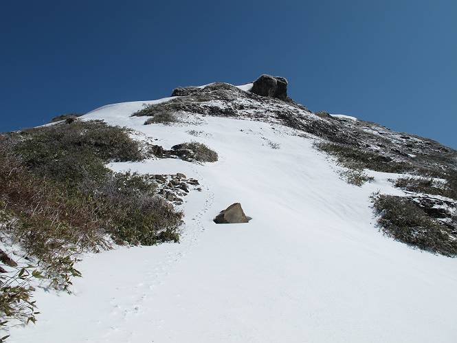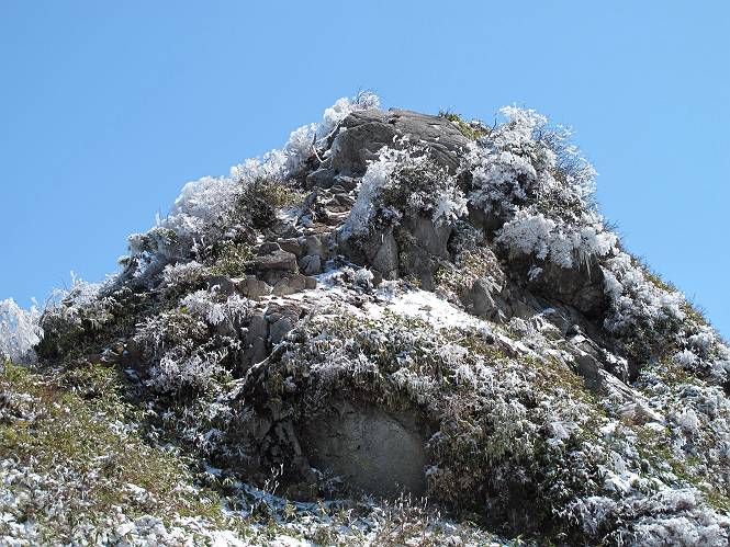 | 3.白毛門⇒土合橋駐車場 1.土合橋駐車場⇒松ノ木沢の頭(TOP) 2.松ノ木沢の頭⇒白毛門 松ノ木沢の頭を発って、上天気なので見た目は、山頂まで目と鼻の先。と思ったら、とんでもない、夏道と大違い。要注意ヶ所が数ヶ所ある、その都度緊張が走った。でも、今日の景色が直ぐに緊張から解放してくれる、素晴しいことだ。到底一人では入り込めない白毛門、何と言っても経験がものをいう山頂部である。凍っていなければ、雪が少なければ、と思うなら雪が消えるのを待つことだ。山並と霧氷を堪能しながら、背筋に汗をかいたが、順調に進み、9:53白毛門山頂着。 この間で見た、谷川岳方面の写真 笠ケ岳方面の写真 霧氷の写真 松ノ木沢の頭から少々下って直ぐに登り返す 見上げる山頂部は岩峰のように見える ジジ岩、ババ岩の上に見える左手の大きな岩を注目する 緩やかに入り 勾配を増していく 岩場を回り込んで振り返る 松ノ木沢から大分進んだ 大きな岩に大分近づいたようだがまだまだありそうだ 霧氷が高度とともに大きくなっていく、大きな岩の上も霧氷だ ちょっとだけ、tomoさんの前を歩いてみた ここまで来ると霧氷が太さが1cmを超えている、見事だ トレースを辿りながら進むが、見失うこともある、消えている可能性もあるし、必ずしもベストで通過したとも思わない。岩の表面は完全に凍結しているので、草付きの斜面を選ぶ、とtomoさんは言う。 大分上ってきた、霧氷がきれいだ あの辺が要注意の岩場のようだ ツララと霧氷と、氷と・・・、 緊張が走る 写真では傾斜を感じないが、実際は・・・・ カモシカになって、四つんばいになることも、本日一番は美しいけれど、それなりの苦労が伴う でっかい岩まで来たぞ この岩、2匹の巨大ガマに見えませんか 岩の脇を通って、 雪の壁に沿って進み 乗り越えます、何ていっても角度が角度です、落ちないように。 上から覗き込むと、ジジ岩、ババ岩が下に見えます こちらは辿って来た尾根ですが、簡単そうに見えますけれど・・・・ 茂倉岳と武能岳の間に苗場山、神楽ケ峰、霧ノ塔 やっとここまで来ましたが、まだ先があります 笠ケ岳と烏帽子岳が見えてきました、スゴイ霧氷でしょう この向こうに白毛門山頂があります、ここまで来れば着いたの同然です 白毛門、笠ケ岳、烏帽子岳の稜線が見えてきました 画像クリック拡大 トンネル状に雪が残ってます、不思議な形をしてます 霧氷がきれいですね、 花を飾りつけたよう、鎖が見えますね 霧氷の間を通って鎖のある大きな岩に上って行きます カッコイイですね、tomoさん あっ! くサリが凍っている、アクリルで包み込んだよう、キレーイ 山頂の山座同定板が見えました、右から回り込んで 山頂到着です、お疲れ様でした、というところかな この間で見た、谷川岳方面の写真 笠ケ岳方面の写真 霧氷の写真 3.白毛門⇒土合橋駐車場 1.土合橋駐車場⇒松ノ木沢の頭(TOP) |
