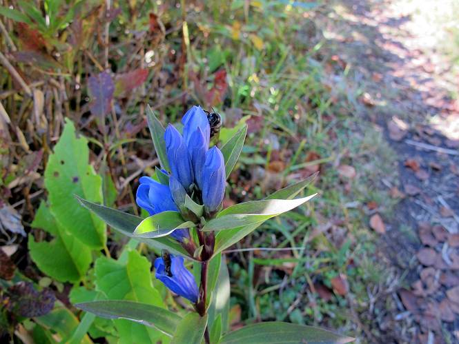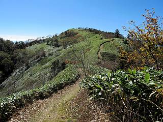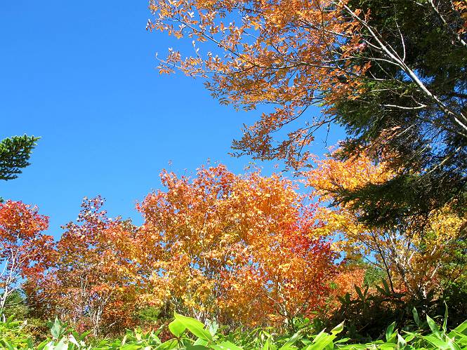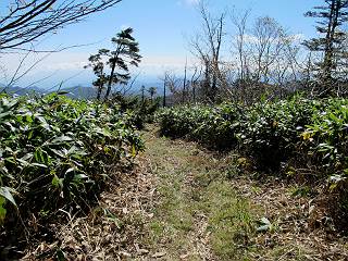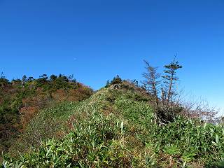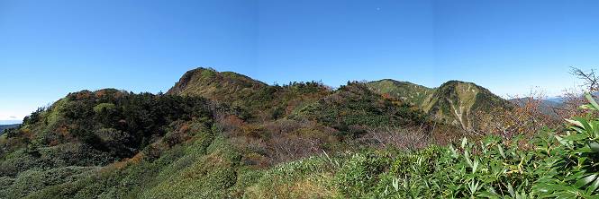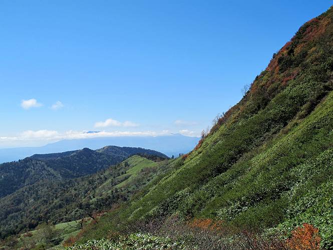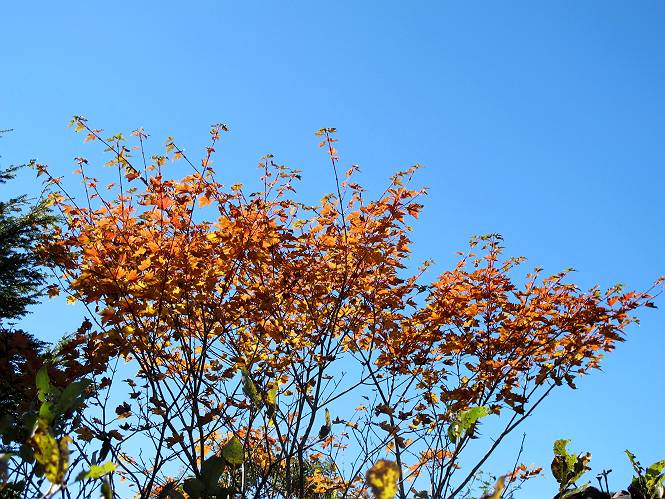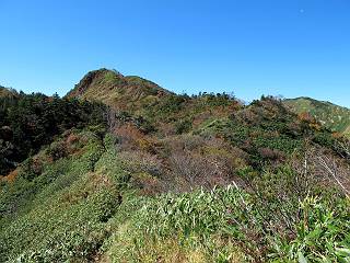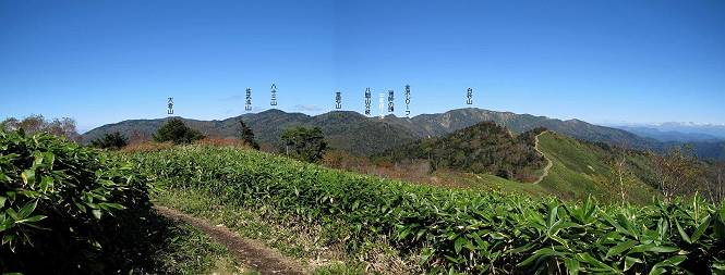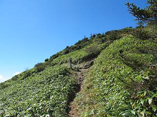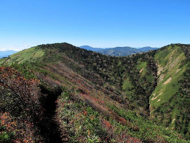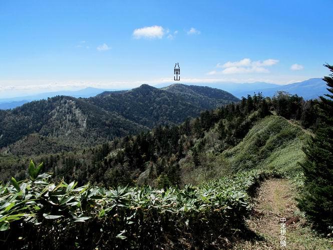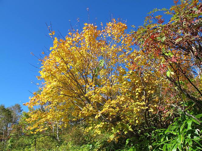 | 【後編:白砂山→八間山→登山口P】 【前編:白砂山登山口P→白砂山】へ 白砂山山頂を後に往路を堂岩山の山腹、八間山分岐点まで、休日とあって行き交う方が多数、狭い登山道を譲りあいながら進む、11:11八間山分岐点着。晴天の尾根歩きを満喫した顔、顔、顔があった。 狭い登山道を譲りあいながら進む 八間山まで5.8km、小さいアップダウンが連続する 金沢レリーフ、八間山分岐点と白砂山の中間点付近 金沢レリーフ、八間山分岐点と白砂山の中間点付近 猟師ノ頭(P2042)の左遠方に八間山 猟師ノ頭(P2042)付近から右奥に鳥甲山 同、佐武流山 振り向けば白砂山 同、堂岩山と八間山分岐点 下って、軽く登り返すと八間山分岐点 緩やかに南方向に進んで白砂山を振り返る 深い猟師ノ沢を左に見ながら緩やかにアップダウン 分岐点から南方向に、深い猟師ノ沢を左に見ながら緩やかにアップダウン、2つ目のピーク、堂岩山分岐点から0.9km、中尾根の頭(P1944)に着く、11:26。ここからしばらく眺望なし、150mほど下り小さなピークを越え、100mほど登り返すと黒渋の頭(P1895)着、12:02、八間山まであと1.2kmとある。またゆったりとした尾根歩きが楽しめる、残念ながら紅葉は僅かに残っていた程度。右奥に岩菅山と鳥甲山が見えてくると、池の峠への下山道を分け八間山山頂着、12:30-12:42。 中尾根の頭(P1944)、堂岩山分岐点から0.9km 中尾根の頭から堂岩山 中尾根の頭から八間山を南方向に、あと2.8km 下って、黒渋の頭(P1895)へ登り返す 黒渋の頭(P1895)、あと1.2km 小さい起伏を二つ三つ 八間山に大分近づいた サラサドウダンの紅葉 深山のオブジェ ここまで来れば八間山はもう目と鼻の先 右奥に岩菅山と鳥甲山 池の峠への下山道を分けると 八間山山頂 南方向は雲がかかり眺望がない、西〜北方向は青空が広がっていた。山頂には10人ほど。富士見峠から来た方がほとんどだった、家族連れあり、中には定年後北軽井沢に住み、山歩きや写真を楽しんでいるという方、“二度とない、今の景色”を表現するのに時々来るとか。終盤に入った秋を撮りながら下る、13:28八間山登山口、13:42駐車点着。総所要時間は、6時間36分、期待した紅葉はイマイチだったが、青空の下で尾根歩きを満喫できた。 西方向に本白根山、白根山、横手山 北西方向に岩菅山 北方向に鳥甲山 八間山山頂から白砂山方向の展望 画像クリック拡大 下山道分岐点から三壁山、三引山、奥に岩菅山 全体として、グシャっとした場所もあるが、歩きやすい道 池の峠駐車場脇の八間山登山口で道路へ 15分ほどで駐車点へ 【下山道の秋】 リンドウの残り花 ウルシの紅葉 カエデの紅葉 湖畔の紅葉 【前編:白砂山登山口P→白砂山】へ |