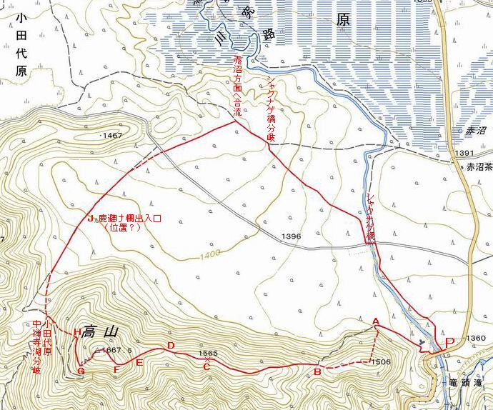 コース概略図 国土地理院1/25000地形図に赤色で付記   戻り