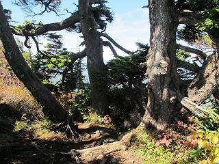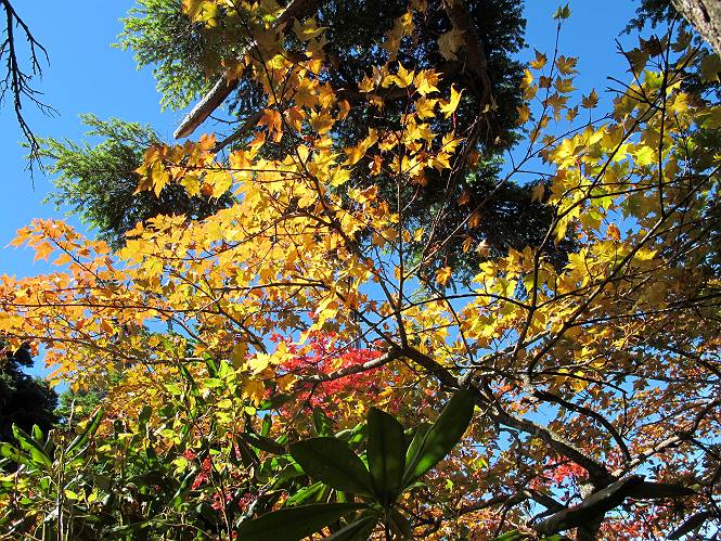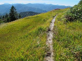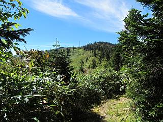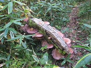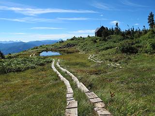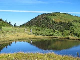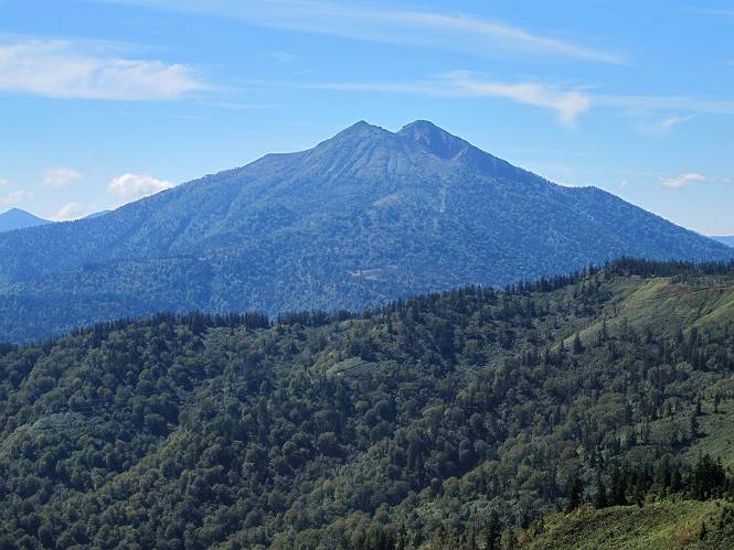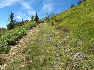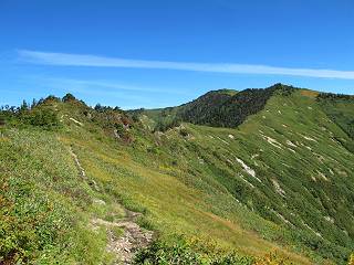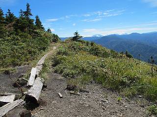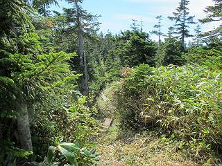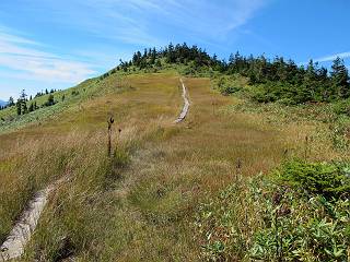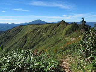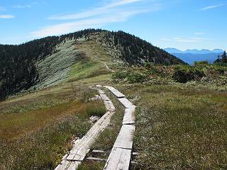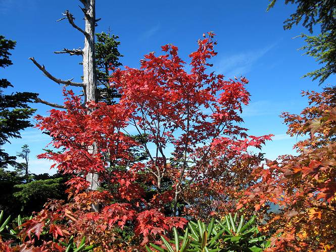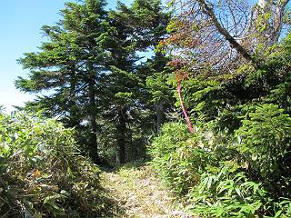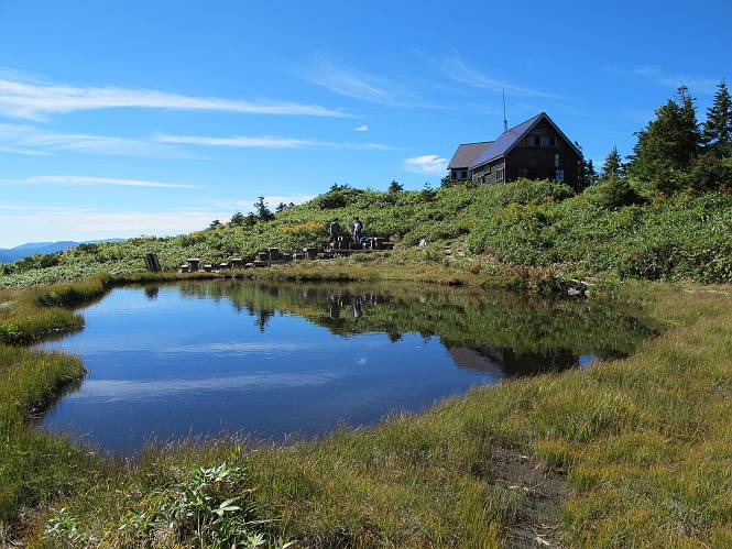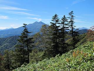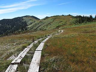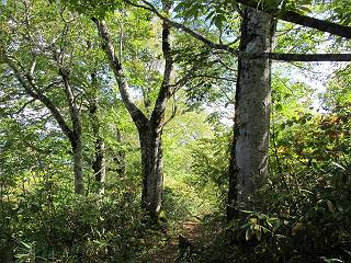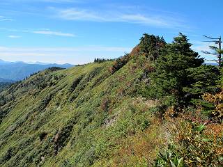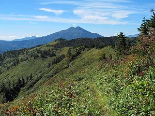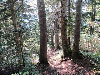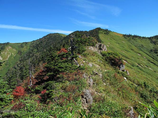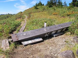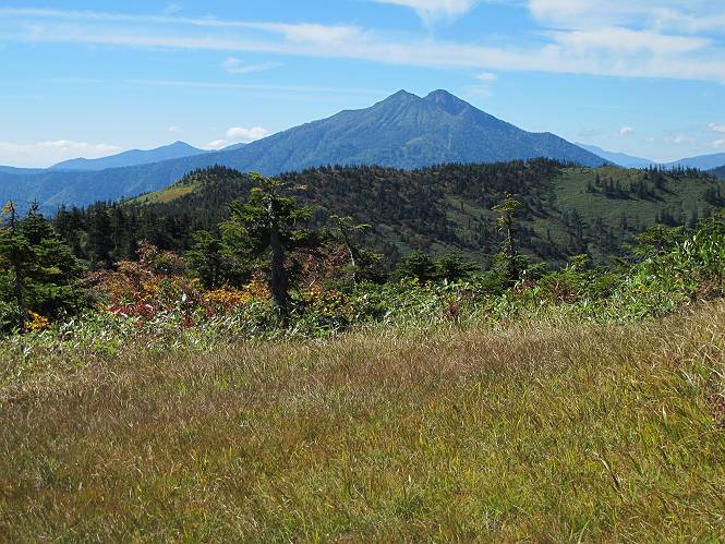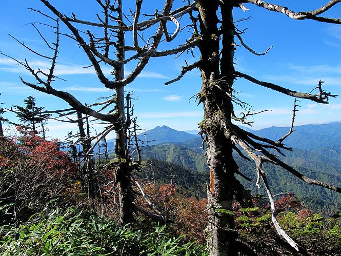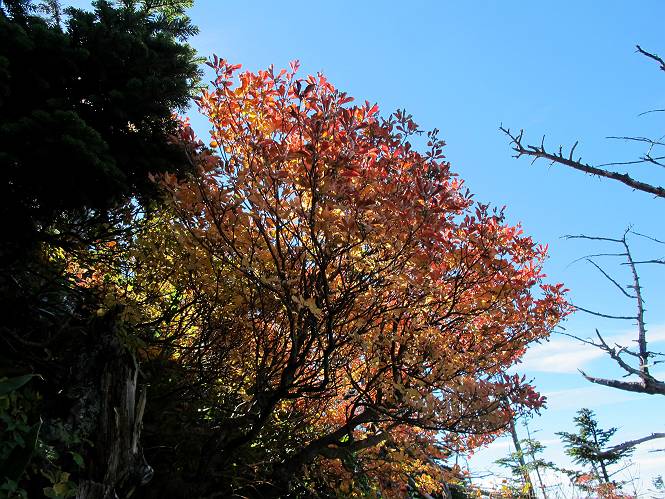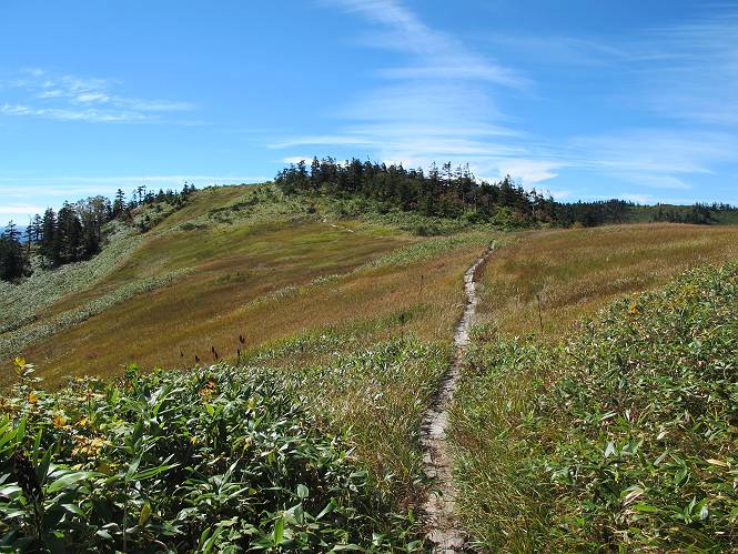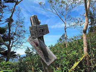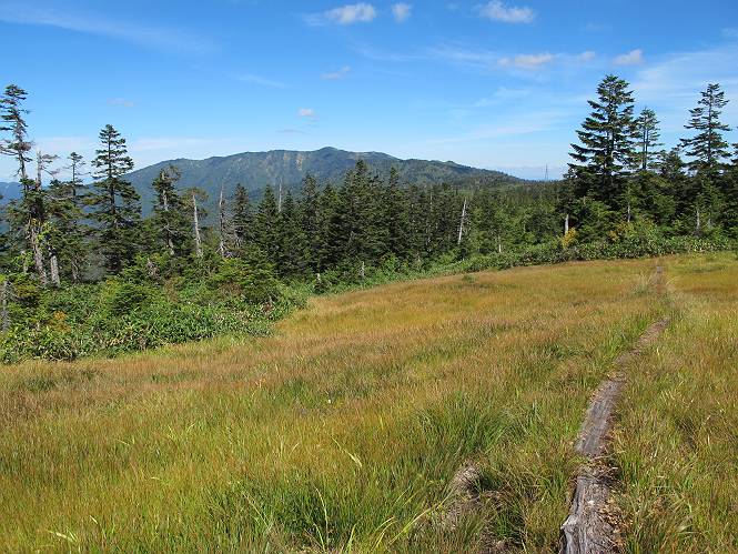 【後編:中門岳〜御池】 【前編:駐車場⇒会津駒ケ岳〜中門岳】へ 去りがたき景観、中門岳をあとに木道を会津駒ケ岳へと進む、霜は解けスリップの危険性が去った。知ってか知らぬか、ボチボチとハイカーにすれ違う。往路で見たリンドウの花、霜にやられてしまったのか、日差しを浴びても元気ない。会津駒ケ岳の巻道分岐点まで戻り、直ぐ後にいた例の男性に、「山頂でゆっくりしていったら・・・」、と別れる。立ち枯れの木の間から燧ケ岳を眺め、9:28先ほど通った山頂への分岐点に出る。間もなく眼下に駒の大池、緩やかに下って9:36駒の大池着、小休止。5分と経たないうちに、巻き道で別れた男性がやってくるではないか。考えてみれば、山頂の眺望は潅木に囲まれてイマイチだし、ベンチはあったが休まる場所ではない。ここで私は御池方面へ、彼は再び眺めながら往路を戻るそうだ。 中門岳から会津駒ケ岳の巻道分岐点まで戻る 巻き道から燧ケ岳 紅葉の進んだツツジ 木道を進むと先ほど通った山頂への分岐点に出る 駒ノ小屋目指して緩やかに下る 北側から駒の大池&駒ノ小屋、丸太のイスとハイカー二人 小休止していると例の男性到着 駒の大池をあとに南方向へ尾根を辿る、御池まで10.1km 藪漕ぎでもしそうな御池への入口、20mも下れば視界が開け、向かう長い尾根が見通せる。一旦下って最初のピーク1996mへ登り返す。枝を四方に張り出したオオシラビソと広葉落葉樹が生育した坪庭のようなピークだ。散りばめたような、赤、黄の紅葉、今が一番いいところかな。小さなハシゴを上って、10:04ピークを通過。緩やかに下って会津駒ケ岳を振り返り、進行方向に燧ケ岳を眺める。ゆったりした尾根道が素晴しいポイントだ、10:09。 大津岐峠まで富士見林道、御池でR352に出るまで大杉林道を歩く、林道と名のつく登山道 小屋から100mほど下って最初のピーク1996mを越える 枝を四方に張り出したオオシラビソと広葉落葉樹が生育した坪庭のようなピーク カエデ カエデ カエデ 短いハシゴを上ると 大きな4本の背丈の低いオオシラビソ 下って、小ピーク、会津駒ケ岳を振り返る 進行方向には燧ケ岳 時を忘れたのか、ミヤマコゴメグサが点々と咲いていた 小さく登り返すと森に囲まれた高層湿原、山並を背景に草紅葉を撮る。秋を彩る一時の静かな空間、一人で観ているのがもったいない。再びオオシラビソの森に入り、抜けると大津岐峠手前の草紅葉が歓迎してくれる。湿原の南側から会津駒ケ岳を振り返る、この山容は熊沢田代で見たのとそっくり。ここは背を歩いているようで、東西とも落ちているようだ、越えて大津岐峠着10:49小休止。この峠で左下、キリンテに通じる道と尾根伝いに直進して御池へ向かう道に分かれる。朽ちた大きな道標、案内板が散乱している、物悲しい昨今の山筋を感じてしまう。 燧ケ岳、尾根筋には大小高層湿原が多数あり、前方饅頭型のピークの向こう側が大津岐峠 燧ケ岳、樹林帯を抜ける 草紅葉の間を通り 斜めになった若干歩きにくい道 また、良い感じの草紅葉 笹っ原を抜けると 次の草紅葉、この向こうが大津岐峠 湿原の南側から会津駒ケ岳を振り返る、この山容は熊沢田代で見たのとそっくり 大津岐峠、前方は大杉岳経由御池方面 こちらはキリンテ方面下山路分岐 大津岐峠から燧ケ岳 大津岐峠からオオシラビソの間を抜けると道幅が急に広がり、もしかしたら“車が・・・”、と思ったが、笹の払われた短い距離だった。潅木、笹原の軽いアップダウンを繰り返し、やっと見えてきた鉄塔、まだまだ遠く、潅木の道が続く。少々上って平坦になると、古い道標、何故ここに? 多分笹が生い茂ったら方向を見失ってしまうかも、と想像してみたが・・・、11:50鉄塔通過。 大津岐峠からオオシラビソの間を抜けると 道幅が広がる(ここだけだった) 潅木、笹原の軽いアップダウン 小湿原も点々と たっぷり水を含んだようなコケ 鉄塔が前方に見えてきた 疎林の間を進むと 古そうな道標、平坦地で迷い易いのかな 送電線巡視路No.101とある 鉄塔&作業小屋? ここからも先の見えない樹林帯が続く、時々山頂らしきものは見えているが、どうなることやら。コースタイムでは大津岐峠と大杉岳の所要が1時間10分とあった。気温は上がるし、疲れも少々感じる、林中でドカッと腰を降ろし小休止、青空を仰いで深呼吸、ミカンを2個食べ歩き出す、間もなく平坦になって、グシャグシャ道を進むと、樹林帯の中に山頂があった、12:41大杉岳山頂着。おかしい、CT=70はキツイ、一度小休止はしたがそれにしても。 まだまだ先の見えない樹林帯が続く やっと大杉岳に近づいたかな 画像クリック拡大 登り坂、林中で青い空を眺めて小休止 平坦になって小湿原、背景は会津駒ケ岳 林中ど真ん中に大杉岳の標柱 脇の木には趣味でつけたか山名板 大杉岳から少し進むと、下り始め、オオシラビソはブナに変り、あっという間に国道に飛び出た、13:15。このCTもおかしいな、でも合算すれば駒ノ小屋と御池の間