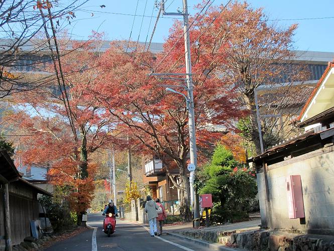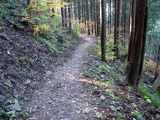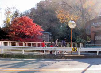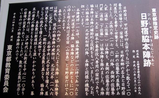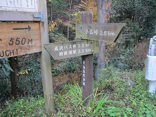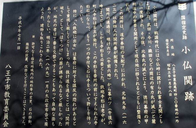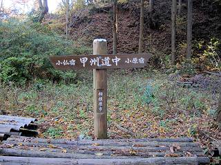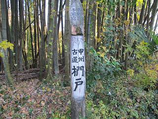 *********************************************************************************** 第一日目レポへ 第三日目レポへ 第四日目レポへ 第五日目レポへ 第六日目レポへ 第二日目 12/2 晴れ 行程:府中〜藤野駅前 2日目、本日の行程は、府中から藤野駅入口まで40km弱、途中小仏峠越え、相模湖付近の山道もあり、早発ちとする。しかし、観てまわる楽しみもあり、早く出発すればいいというものでもない、日野橋交差点付近の旧道が入り組んでいるので、この辺で明るくなるように、4:31市役所前交差点、高札場跡を出発する。旧甲州街道の様子を伝える案内を見ながら西方向へ進む。夜明けの街並みは静かだ、4:45分倍河原駅バス停、間もなく本宿町交差点でR20に出る、4:53。日野バイパスでR20と分れ、都道256を直進すして日野橋交差点を斜め右に入り、住宅地から下水処理場へ、ここに日野渡しの碑あり、遊歩道を通り日野橋の袂に出てR20へ、6:17。 2日目、府中市役所前交差点、高札場跡を出発 夜明けの街並み 旧甲州街道様子を伝える案内が各所に 分倍河原駅 分倍河原バス停 由緒ありそうな構え 本宿町交差点でR20に出る、写真斜め右が旧道 国立市をかすめ、日野バイパスを過ぎると都道256号線に変る 常夜燈、あちらこちらあったようだ 立川市に入って 日野橋交差点で旧道(都道29号線)は斜め右に入る 更に住宅地を通り、 下水処理場へ向かう 柵に面したところに日野の渡し碑あり 遊歩道を抜け 多摩川にかかる日野橋を渡って、右折、土手に沿って進むと、こちら側にも日野渡船場跡あり、現在の日野橋と立日橋の間にある、6:23日野橋南、6:29日野渡船場跡、6:35立日橋南。スポーツ公園の東を通り、突き当たって右折すると日野宿脇本陣跡に出る、6:44。日野駅をクランクで抜け、大坂上通りを進むと、日野台五丁目西交差点を過ぎ、八王子市に入る、7:38。 日野橋の袂へ 多摩川にかかる日野橋 日野橋から一つ上の立日橋と多摩モノレール、中間に渡しがあったとか 日野市に入って土手から日野橋 立日橋を見る、モノレールが走ってます 日野の渡しの案内板より スポーツ公園前交差点 スポーツ公園、丁度、ラジオ体操第二を市民の方やってました 旧道は突き当たって右折すると、日野宿脇本陣跡あり 案内より その横に日野宿、問屋場&高札場の跡 駅を東に巻いて日野駅東交差点 駅のホーム下を抜け左折 大坂上通りを抜け 日野台五丁目西交差点を過ぎると 八王子市に入る 高倉町交差点を過ぎR20へ入り、R16の下を通り、旧道は大和田五丁目付近を東に巻き橋の北詰で合流し、浅川を渡る、8:12。旧道は南詰交差点で右に入り、回り込んで一里塚の史跡を通り、八王子駅入口東でR20に入る、8:27八王子駅入口交差点。 イチョウ並木が輝いていた 日本橋から42km地点通過 空は青空、黄金に輝くイチョウ、行き交う車々 高倉町交差点を過ぎR20へ入り、R16の下を抜ける 大和田五丁目付近を東に巻き橋の北詰で合流し、浅川を渡る 旧道は南詰交差点で右に入る 一里塚の史跡あり、回り込んで 八王子駅入口東でR20へ 八王子駅入口交差点、正面が八王子駅 ここからR20を追分交差点、高尾駅前交差点へと進む、旧道は途中2ヶ所小さく巻いて小道へ入る、8:34日本橋から45km、8:49日本橋から46km、8:59追分町交差点、9:04日本橋から47km、9:27旧道入口、9:46次の旧道入口、10:02高尾駅前交差点通過。 この辺で日本橋から45km 八日市宿があったそうだ がっちりした建物、雑貨屋さんだったかな? \800/24h、これは安い 珍しいですね、ストーブの芯交換 ここは八百屋さんかな 追分交差点で左カーブ この辺もイチョウ並木が美しい キレーイ、思わず立ち止まってしまいました でも、プロの清掃 地域のボランティア、と大変な様子 日本橋から47kmを過ぎ 長房団地入口から旧道はちょっと脇道を通りまたR20へ 多摩御陵参道を過ぎ また右ちょこんと入ります 閑静な住宅地でした、ここまで来てやっと山を見ました R20に戻ると直ぐに高尾駅前の交差点です 高尾駅前からガード下を抜け西浅川交差点で右折、いよいよ旧甲州街道は小仏峠に向かう。都道516号線で最奥は一般駐車場となっている。まず、小仏関跡、駒木野宿跡と案内板から甲州街道のお勉強、なるほどね、小仏関は重要拠点ってわけかな。清流に沿った集落は、戸間を徐々に距離をおくようになる、感心なのは軒先に置かれた地場産の野菜等で、昔の分け与える助け合いの習慣の名残なのだろうか。旧東海道を歩いた時も箱根手前に点々とあったなあ、10:15西浅川交差点、10:24小仏関跡、10:51圏央道下、11:15中央線下、11:28小仏バス停、11:45歳奥の駐車場。 古風な駅舎ですね、立派 ガード下を抜けると 鮮やかなモミジ、家族連れで散策でしょうか、 西浅川交差点で右折、旧甲州街道は小仏峠に向かいます 間もなく裏高尾町の駒木野宿跡、小仏関跡にでます 小仏関の案内より この辺でしょうか、念珠坂碑と石仏 裏高尾町の家並みです 清流に接近した所に石仏 “野菜あります”、山間にあって分け与える習慣の名残でしょうか 真っ赤なモミ