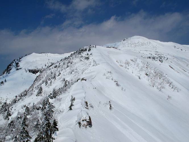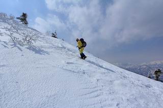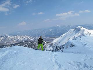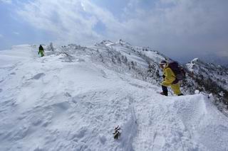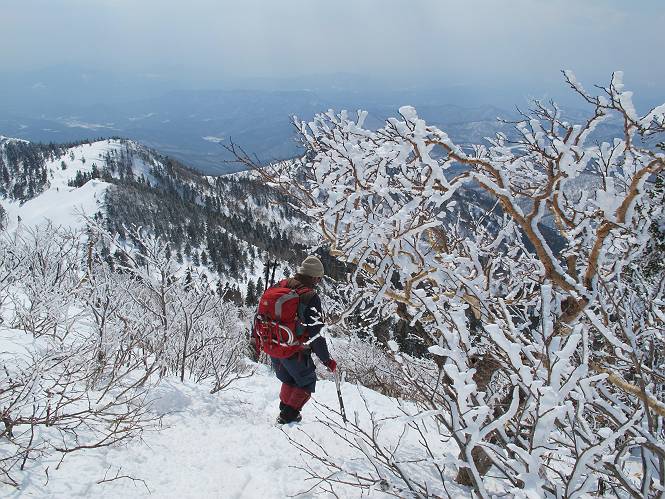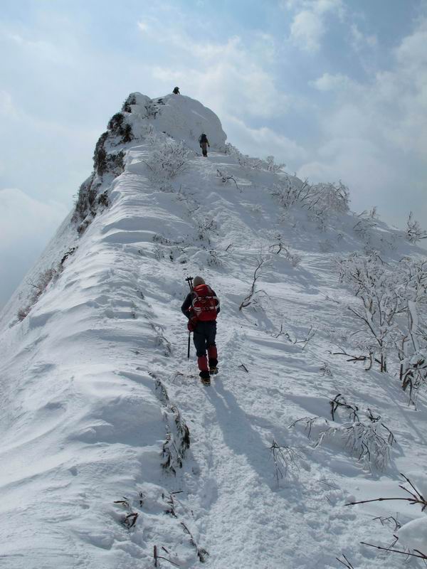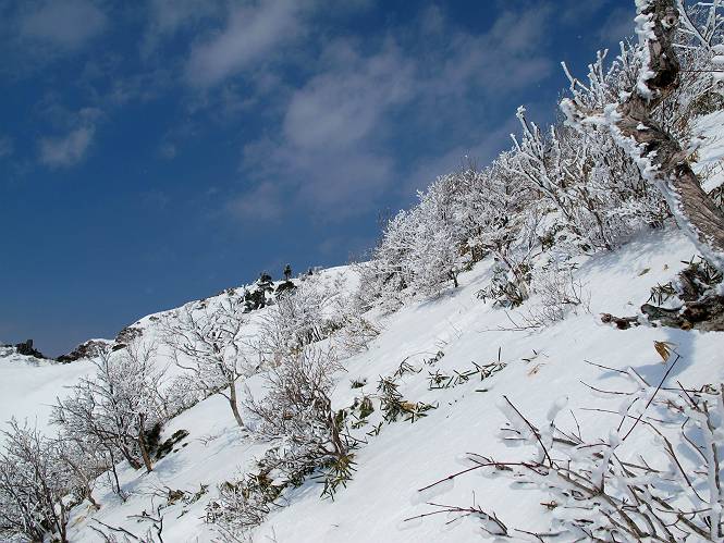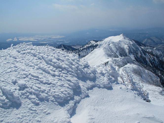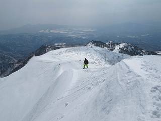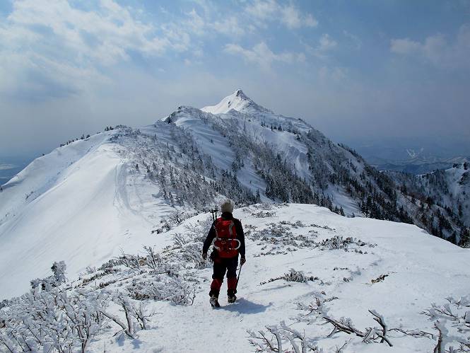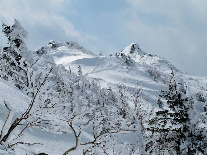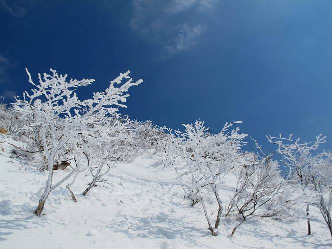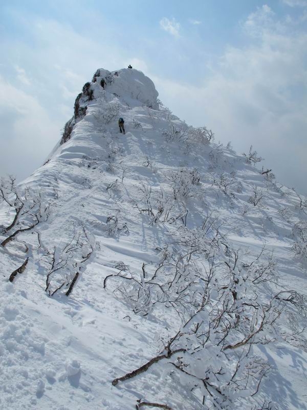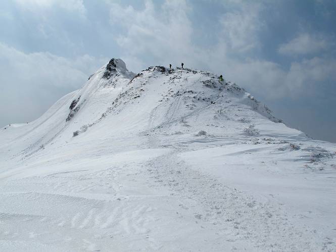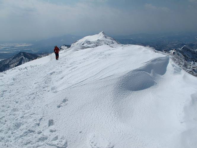 【後編:武尊山〜リフト最上部】 【前編:リフト最上部)〜武尊山】に戻る ( tomoさんのレジャーシートにドッカリ腰を降ろし、ちょっと早目の昼食、行き交う人たちが次々と、満面の笑みを浮かべ、交わす言葉は「素晴しい・・・」の一言、1時間ほど経ったろうか、去りがたき山頂を後にする。 また、絶景に体をまわす 画像クリック拡大 下の方に見えたボーダー達も到着 こちらの方は単独、天辺から風を切って下って行った、あっという間に・・・ 賑わう山頂を後に帰路につく 【遠のく雄姿武尊山】8枚(武尊山→剣ケ峰直下) 画像クリック拡大 【剣ケ峰山へ再び】17枚(武尊山→剣ケ峰直下) 先に行く人、tomoさん 雲が出てきましたが、上空は晴れてます、tomoさん、足どりも軽く。 緩い起伏がしばらく続き、ちょっと我慢の急斜面、続いて直下の岩峰を一気に上る、12:57剣ケ峰山の山頂到着。もう、ここからリフト最上部まで30分とかかるまい。 山頂から滑走したこの方、2回こなして我らの先に 剣ケ峰山の北側の登りです、この先で岩峰に取り付きます 撮っていたつもりが、撮られてました、tomoさん提供2枚 左上のボーダーも入って、急坂も楽し、でした 【剣ケ峰山直下の急登】5枚(剣ケ峰直下→剣ケ峰山) 剣ケ峰山山頂 先ほどのボーダーは滑って行った、駐車場まで一気に? 剣ケ峰山山頂から獅子ケ鼻山 雪が緩んでダンゴ屋さん、ピッケルで叩き落しながら 祠の主は笑っているかな、あきれてるかな 霧氷の潅木帯を抜ける 気温が上がっているが、 まだ、しっかり着いている 上空は青空、霧氷が映える ここまで下ると、リフトが見える スゴイ、いっぱいいるなあ リフト最上部から武尊山の南部一望 画像クリック拡大 多分上の写真を撮っていた時の・・・tomoさん提供2枚 リフト乗り場へ戻りました、チケット売場で登山届確認します 剣ケ峰山からのあっという間の下山、13:20リフト最上部着。総所要時間は、4時間53分。のんびり歩いた武尊山、天気に恵まれたのも一つ、同行のtomoさんの何から何まで、至れり尽くせりの動き、お陰様で何も考えず、絶景を十二分に堪能できました。今日は、条件が良過ぎたかもしれない、しかし、素晴しいコースだ、アクセスも良いし、ハード&ソフト面もバッチリ、危険な場所はないし、病みつきになっちゃうかな。下山するまでに会った人は50人超だろう。 ここのゲレンデ、若い人が多いのにビックリ、七階建ての立体駐車場は満車、P手前の2ヶ所もいっぱいでしたよ。山へ行かれる方は、早目に来られた方がいいです、とのこと。 【前編:リフト最上部)〜武尊山】に戻る tomoさんのページへリンク |