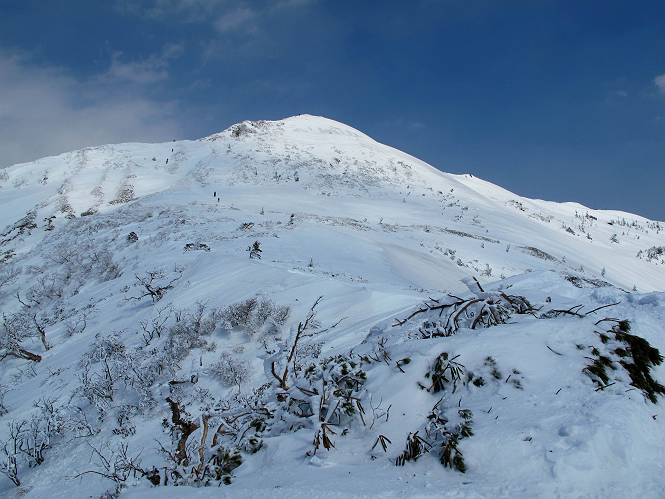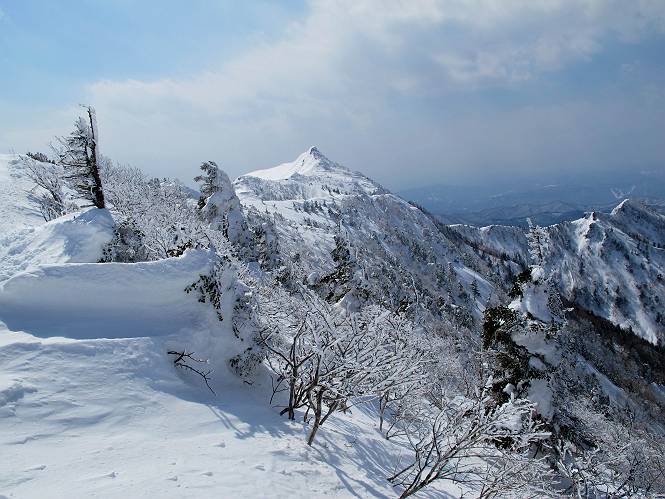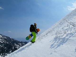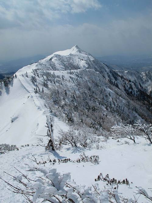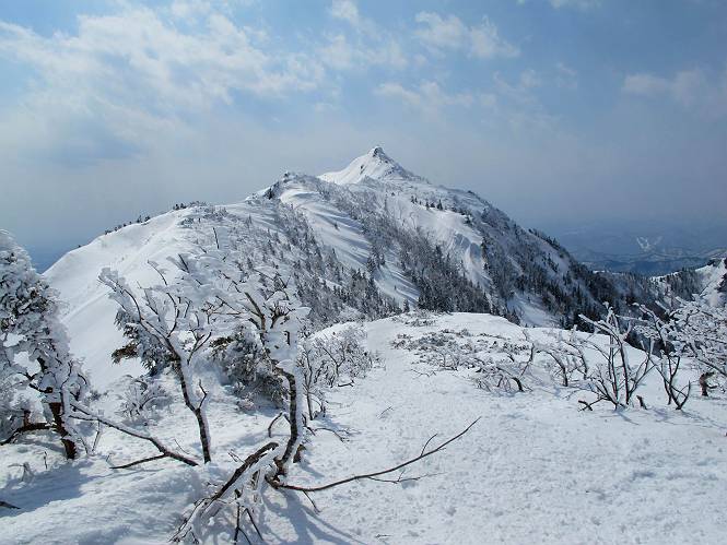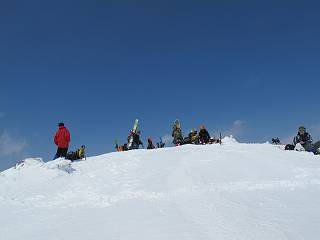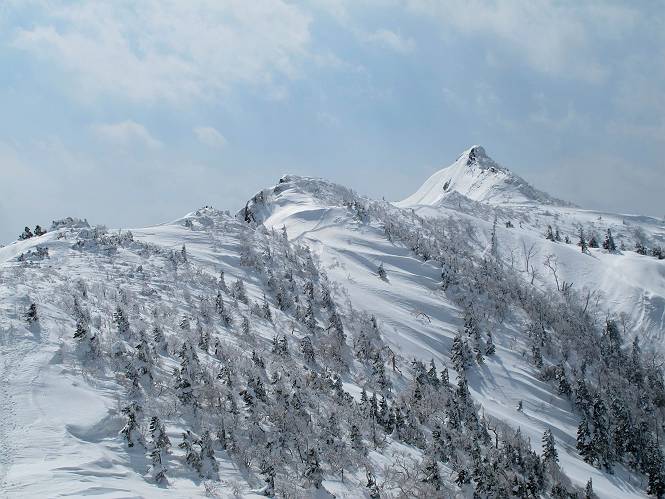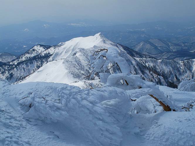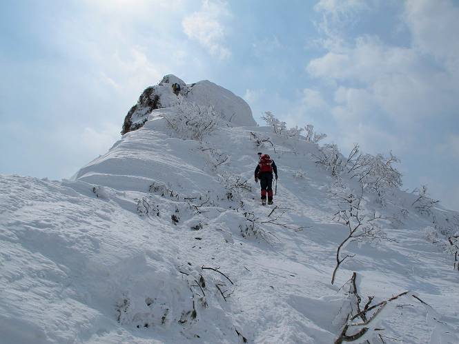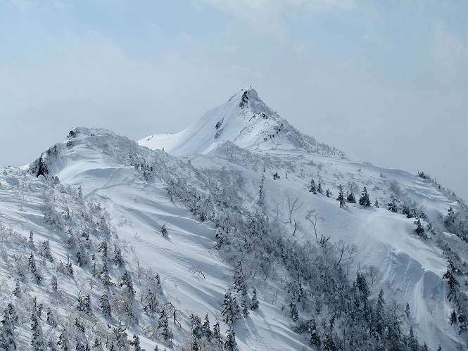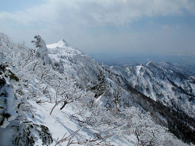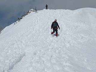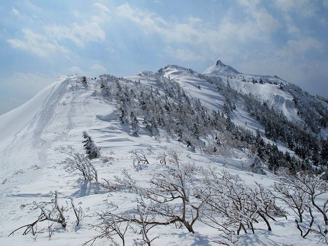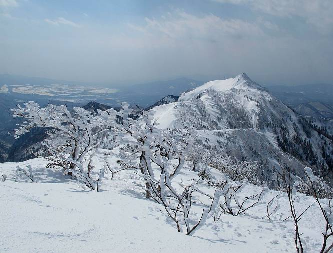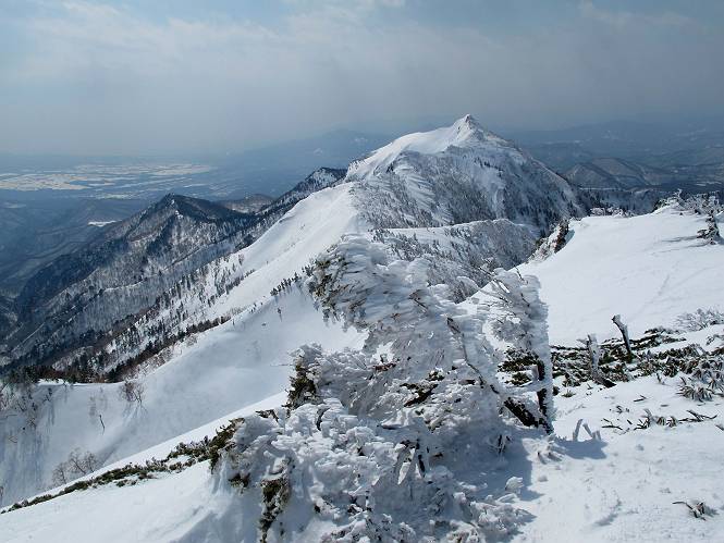 【後編:武尊山〜リフト最上部】 【前編:リフト最上部)〜武尊山】に戻る ( tomoさんのレジャーシートにドッカリ腰を降ろし、ちょっと早目の昼食、行き交う人たちが次々と、満面の笑みを浮かべ、交わす言葉は「素晴しい・・・」の一言、1時間ほど経ったろうか、去りがたき山頂を後にする。 また、絶景に体をまわす 画像クリック拡大 下の方に見えたボーダー達も到着 こちらの方は単独、天辺から風を切って下って行った、あっという間に・・・ 賑わう山頂を後に帰路につく 【遠のく雄姿武尊山】8枚(武尊山→剣ケ峰直下) 画像クリック拡大 【剣ケ峰山へ再び】17枚(武尊山→剣ケ峰直下) 先に行く人、tomoさん 雲が出てきましたが、上空は晴れてます、tomoさん、足どりも軽く。 緩い起伏がしばらく続き、ちょっと我慢の急斜面、続いて直下の岩峰を一気に上る、12:57剣ケ峰山の山頂到着。もう、ここからリフト最上部まで30分とかかるまい。 山頂から滑走したこの方、2回こなして我らの先に 剣ケ峰山の北側の登りです、この先で岩峰に取り付きます 撮っていたつもりが、撮られてました、tomoさん提供2枚 左上のボーダーも入って、急坂も楽し、でした 【剣ケ峰山直下の急登】5枚(剣ケ峰直下→剣ケ峰山) 剣ケ峰山山頂 先ほどのボーダーは滑って行った、駐車場まで一気に? 剣ケ峰山山頂から獅子ケ鼻山 雪が緩んでダンゴ屋さん、ピッケルで叩き落しながら 祠の主は笑っているかな、あきれてるかな 霧氷の潅木帯を抜ける 気温が上がっているが、 まだ、しっかり着いている 上空は青空、霧氷が映える ここまで下ると、リフトが見える スゴイ、いっぱいいるなあ リフト最上部から武尊山の南部一望 画像クリック拡大 多分上の写真を撮っていた時の・・・tomoさん提供2枚 リフト乗り場へ戻りました、チケット売場で登山届確認します 剣ケ峰山からのあっという間の下山、13:20リフト最上部着。総所要時間は、4時間53分。のんびり歩いた武尊山、天気に恵まれたのも一つ、同行のtomoさんの何から何まで、至れり尽くせりの動き、お陰様で何も考えず、絶景を十二分に堪能できました。今日は、条件が良過ぎたかもしれない、しかし、素晴しいコースだ、アクセスも良いし、ハード&ソフト面もバッチリ、危険な場所はないし、病みつきになっちゃうかな。下山するまでに会った人は50人超だろう。 ここのゲレンデ、若い人が多いのにビックリ、七階建ての立体駐車場は満車、P手前の2ヶ所もいっぱいでしたよ。山へ行かれる方は、早目に来られた方がいいです、とのこと。 【前編:リフト最上部)〜武尊山】に戻る tomoさんのページへリンク |