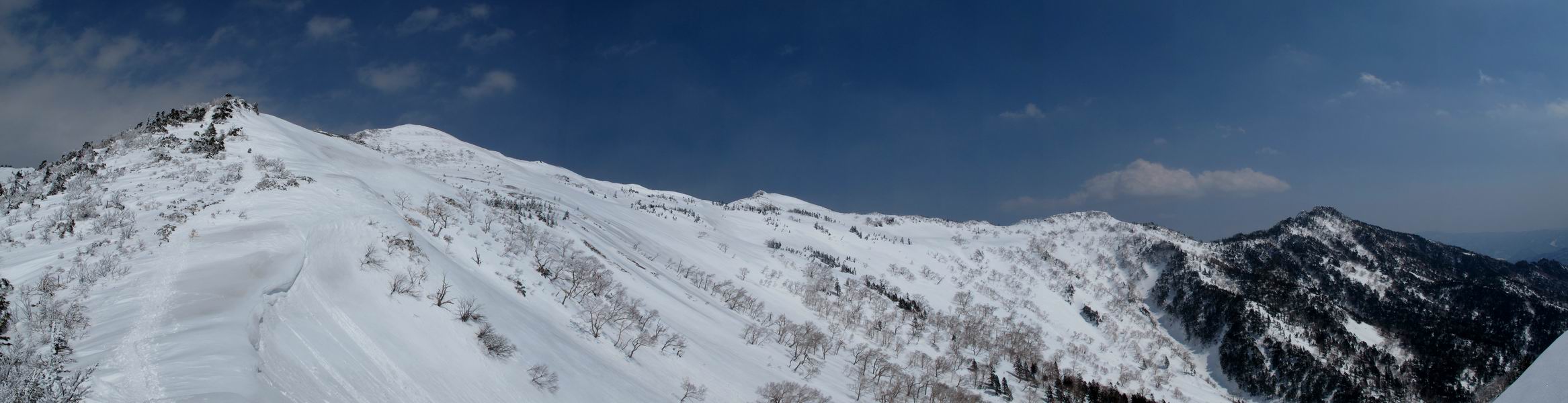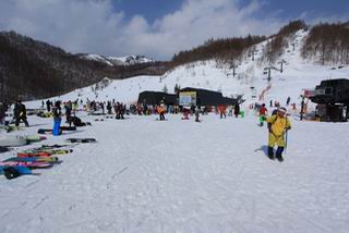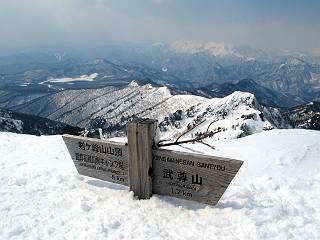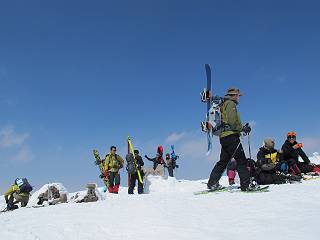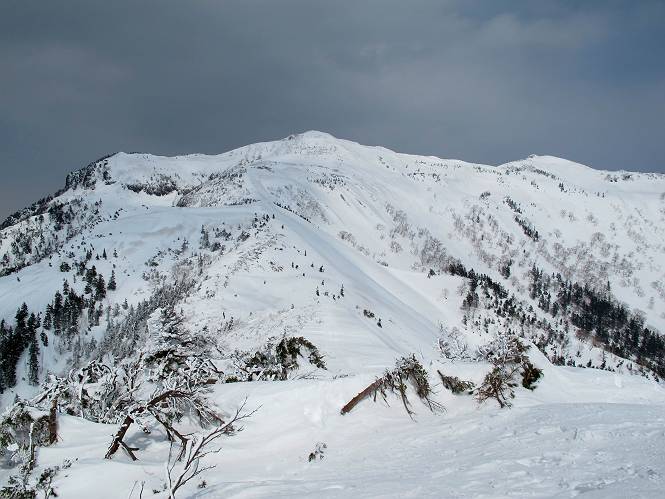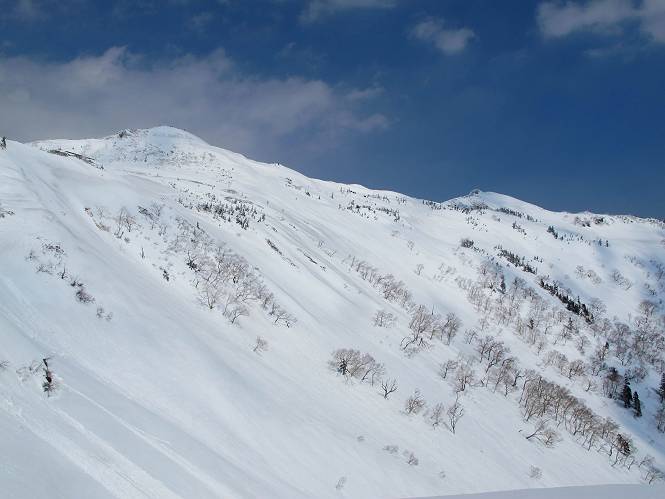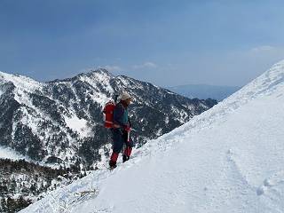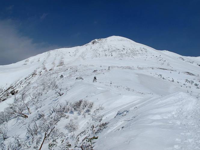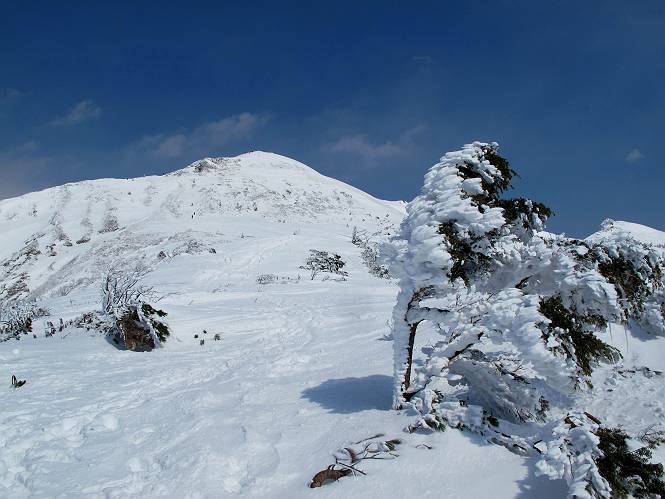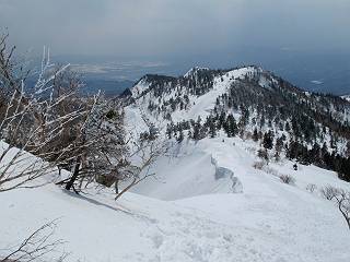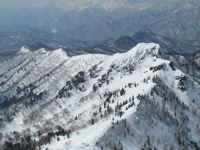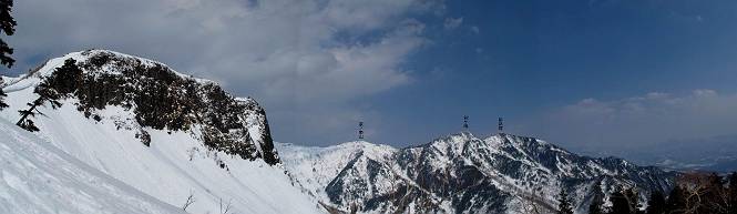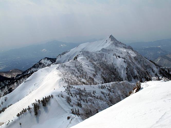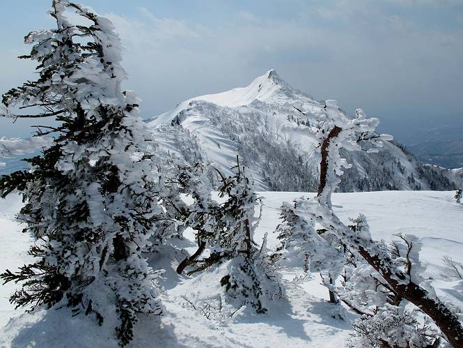 【後編:武尊山〜リフト最上部】 【前編:リフト最上部)〜武尊山】に戻る ( tomoさんのレジャーシートにドッカリ腰を降ろし、ちょっと早目の昼食、行き交う人たちが次々と、満面の笑みを浮かべ、交わす言葉は「素晴しい・・・」の一言、1時間ほど経ったろうか、去りがたき山頂を後にする。 また、絶景に体をまわす 画像クリック拡大 下の方に見えたボーダー達も到着 こちらの方は単独、天辺から風を切って下って行った、あっという間に・・・ 賑わう山頂を後に帰路につく 【遠のく雄姿武尊山】8枚(武尊山→剣ケ峰直下) 画像クリック拡大 【剣ケ峰山へ再び】17枚(武尊山→剣ケ峰直下) 先に行く人、tomoさん 雲が出てきましたが、上空は晴れてます、tomoさん、足どりも軽く。 緩い起伏がしばらく続き、ちょっと我慢の急斜面、続いて直下の岩峰を一気に上る、12:57剣ケ峰山の山頂到着。もう、ここからリフト最上部まで30分とかかるまい。 山頂から滑走したこの方、2回こなして我らの先に 剣ケ峰山の北側の登りです、この先で岩峰に取り付きます 撮っていたつもりが、撮られてました、tomoさん提供2枚 左上のボーダーも入って、急坂も楽し、でした 【剣ケ峰山直下の急登】5枚(剣ケ峰直下→剣ケ峰山) 剣ケ峰山山頂 先ほどのボーダーは滑って行った、駐車場まで一気に? 剣ケ峰山山頂から獅子ケ鼻山 雪が緩んでダンゴ屋さん、ピッケルで叩き落しながら 祠の主は笑っているかな、あきれてるかな 霧氷の潅木帯を抜ける 気温が上がっているが、 まだ、しっかり着いている 上空は青空、霧氷が映える ここまで下ると、リフトが見える スゴイ、いっぱいいるなあ リフト最上部から武尊山の南部一望 画像クリック拡大 多分上の写真を撮っていた時の・・・tomoさん提供2枚 リフト乗り場へ戻りました、チケット売場で登山届確認します 剣ケ峰山からのあっという間の下山、13:20リフト最上部着。総所要時間は、4時間53分。のんびり歩いた武尊山、天気に恵まれたのも一つ、同行のtomoさんの何から何まで、至れり尽くせりの動き、お陰様で何も考えず、絶景を十二分に堪能できました。今日は、条件が良過ぎたかもしれない、しかし、素晴しいコースだ、アクセスも良いし、ハード&ソフト面もバッチリ、危険な場所はないし、病みつきになっちゃうかな。下山するまでに会った人は50人超だろう。 ここのゲレンデ、若い人が多いのにビックリ、七階建ての立体駐車場は満車、P手前の2ヶ所もいっぱいでしたよ。山へ行かれる方は、早目に来られた方がいいです、とのこと。 【前編:リフト最上部)〜武尊山】に戻る tomoさんのページへリンク |