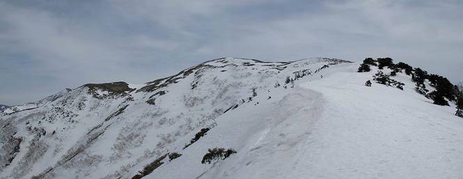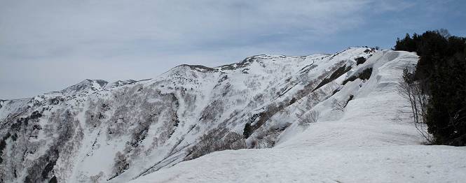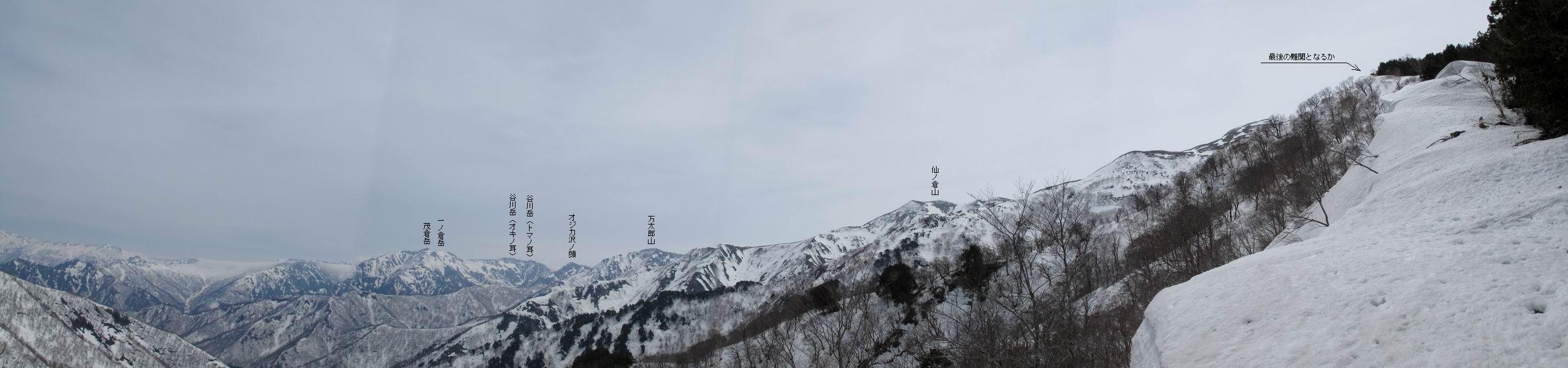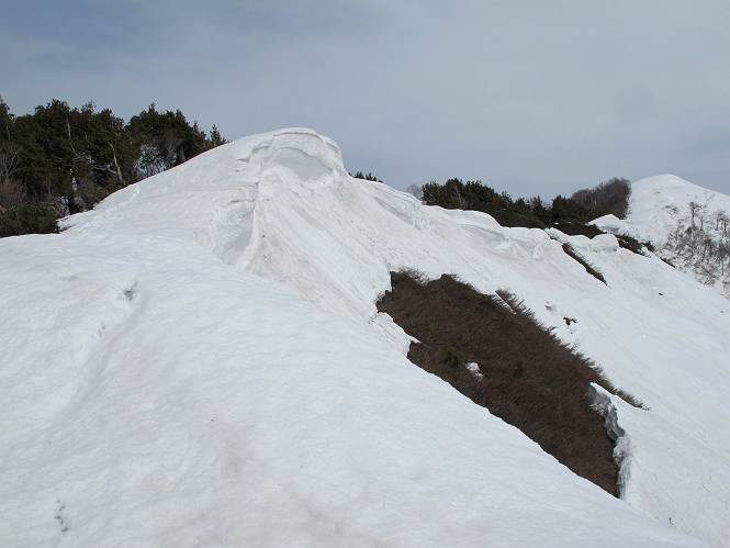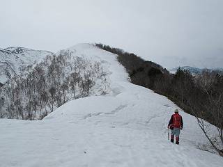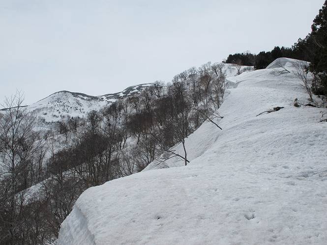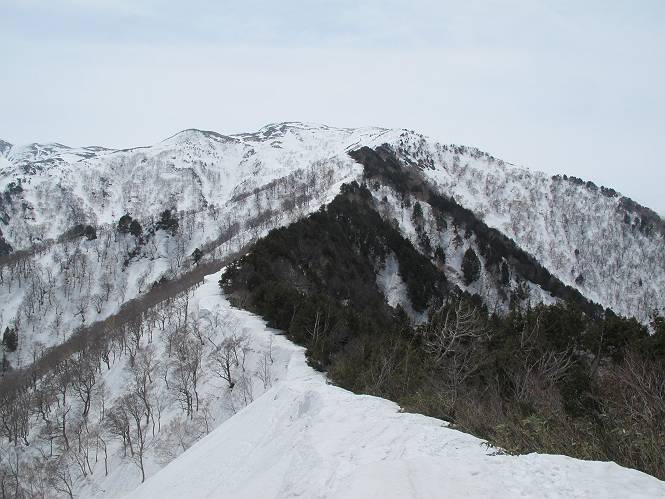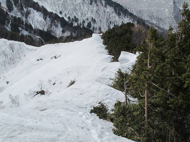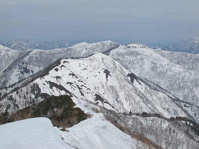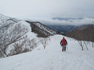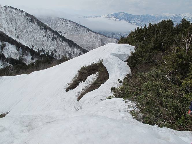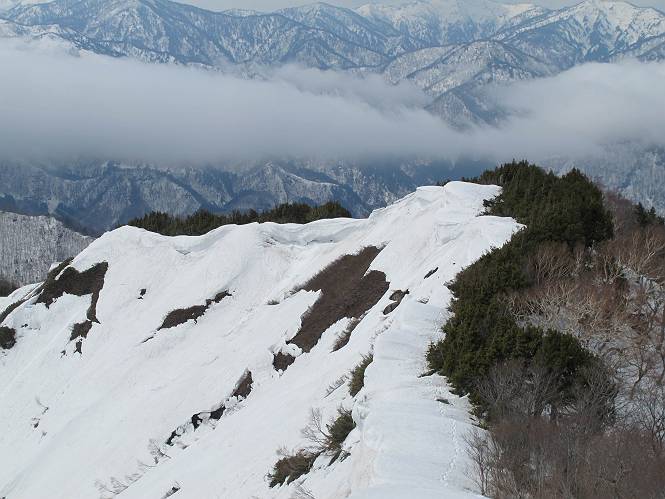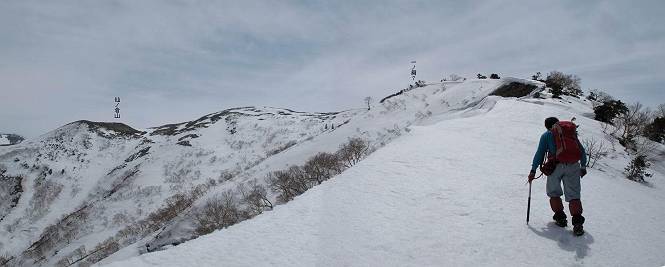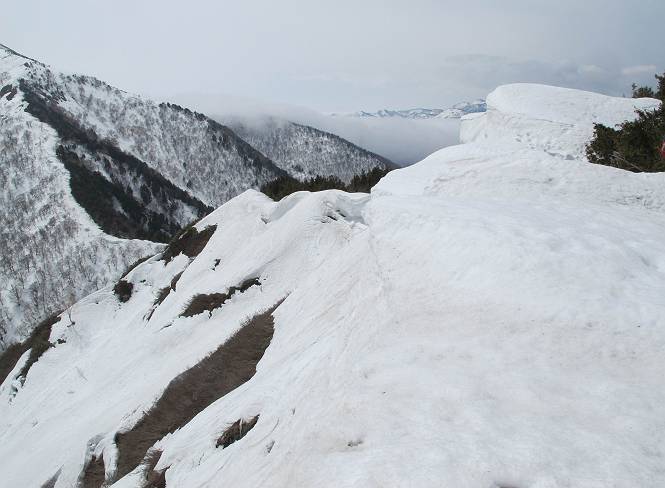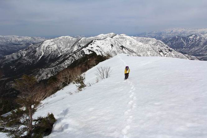 【中編:日白山〜一ノ肩〜平標山】 【後編:平標山〜松手山〜二居集落】へ 【前編:二居集落〜日白山】へ 沢山のトレースのある雪庇、日白山から二居集落の距離が短く利用者が多いとか、鞍部に赤い目印があり、トレースもここで減った。登り返して、三角点のあるピーク(二居俣ノ頭)に立つ。ここで2回目の確認だ、地図上にある両端崖のヤセオネ、どう見ても見当たらない。雪庇で被われているのかな、とりあえず、無いので安心する。上部の崩落は思ったより小さいようだ、これも安心材料。もし、引き返す場合はこの辺から派生する枝尾根が3本ほどある、気温はあまり上昇してないので、エスケープに利用できよう。tomoさんは慎重だ、お陰で安心してついて来られる。全部で数ヶ所巻いたが、私が考えるより、気遣ってか、大きく巻き、丁寧な歩き方をしていた。10:11最初の鞍部、10:27-10:47三角点のあるピーク(二居俣ノ頭)でルート見極め、12:15危険地帯脱出(標高1700m付近)、12:54一ノ肩で登山道に無事合流。tomoさんは、ほっと胸を撫で下ろしたことでしょう。 日白山の下り、兎に角急で、飛び込むような格好でした 日白山から南に下る この辺は大勢歩いた跡があり、分岐の目印か、ブナに赤い紐が 3人ほどの新しいトレースを踏んでP1584.1に登り返す 日白山を振り返る P1584.1から尾根の雪庇の状態を眺める、この直ぐ先 ずっと見通すと上部に崩落した跡あり 拡大すると、要注意かな、樹林帯の中を巻けそうでもある 最初の崩落ヶ所、トレースも樹林帯の中を巻いていた ここの亀裂を渡って藪を漕いだんですよ(tomoさん提供) うーん、この先はどうなっているのだろう ここも安全をみて樹林帯の中を巻く 雪庇の上に出て、巻いたヶ所を振り返る ここで、上部をtomoさんが望遠レンズで観察、「通過できそうな感じ」、と言う 尾根筋から注意深く観てきたが、影になっている崩落ヶ所あり トレースはここも大きく巻いていた 笹、シャクナゲを漕いで無事通過 上部の崩落ヶ所に大分近づいてきた tomoさん、「こんな所でテントを張ったのか ここでトレースは途切れていた、西側へ下ったようだ 」 ここで前方を展望する 画像クリック拡大 いよいよ怪しい場所に近づいた 雪庇を急登し、 クロベの森を漕ぐ 抜け出た場所から辿ってきた尾根筋を振り返る 画像クリック拡大 1550m付近、前方にもう一ヶ所、怪しい場所が・・・ 画像クリック拡大 一息入れて、最後の難所へ? その先は一ノ肩だろう? 樹林帯をかすめて、 ダケカンバと苗場山にみとれて一枚 また、雪庇の上へ、辿ってきた雪庇の尾根 画像クリック拡大 ここを歩いていた時は、もう、ルンルンでした(tomoさん提供) 最後は呆気なく抜けてしまったようだ 画像クリック拡大 崩落ヶ所を振り返る 抜けてきたクロベの向こうに苗場山 振り向いても、どこをどう通ってきたか? もう一ノ肩は直ぐ先、雪庇は終わり雪原に近い、ここでtomoさんの安全宣言 画像クリック拡大 近いピークにtomoさんのステップも軽く トレースだらけの緩やかな斜面、ハイマツ、笹、シャクナゲがあちらこちらで葉を出していた 一ノ肩で登山道に合流 間もなく大山祇碑 一ノ肩からはお互い通い慣れた道、合流点から露出した道をアイゼンをつけたまま歩く、tomoさんは途中で外してましたが。13:16平標山の西のピーク、13:25-13:54平標山山頂。山頂に近づくや、天空は青空に被われ、新潟県側の眺望に見入ってしまった。特に、朝から辿ってきた雪庇の道を何度も目で追った。 平標山は歓迎ムード、天空は青空に、手前のぴーくから巻機山〜平標山を一望 画像クリック拡大 同、手前のピークから茂倉岳〜平標山 画像クリック拡大 同、仙ノ倉山、平標山 空は青空、気持ちはウキウキ、予定外の平標山山頂だ(tomoさん提供) 平標山西斜面から帰路通る一ノ肩、松手山、その奥に苗場山、 平標山山頂 平標山山頂から大源太山の頭がちょっと、群馬県側は曇り 同、仙ノ倉山 同、仙ノ倉山 同、巻機山方面 同、日白山方面 同、苗場山〜巻機山 画像クリック拡大 同、巻機山〜仙ノ倉山 画像クリック拡大 ここで、こんなことを書くのは可笑しいが、一ノ肩までは聞いていたが、その先、平標山往復は聞いてなかった。私の足と回復してきた天気のお陰か、付け足してくれたのだろう。山頂の景色は見るたびに違うものだ、まだ深い雪に覆われた越後の山、まだまだ雪遊びできそうだ。 【後編:平標山〜松手山〜二居集落】へ 【前編:二居集落〜日白山】へ |