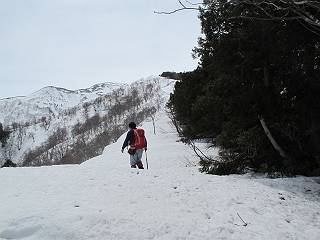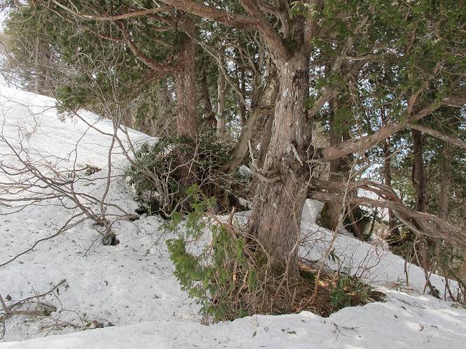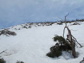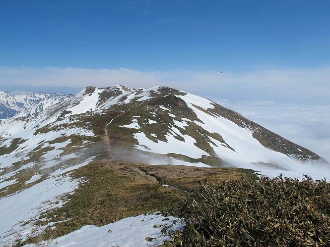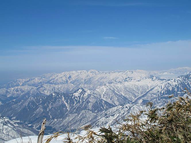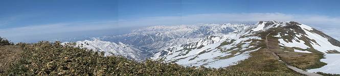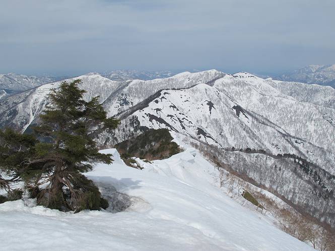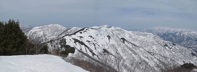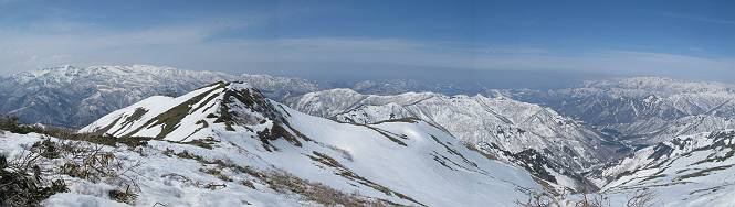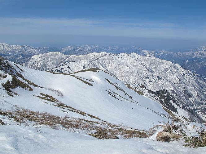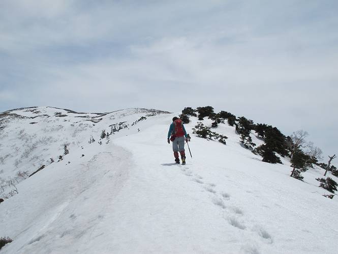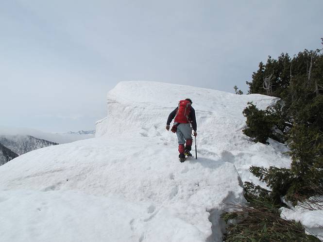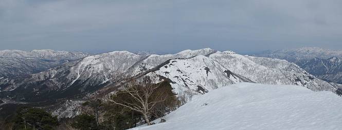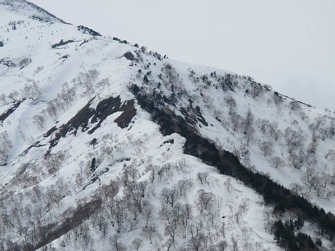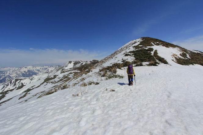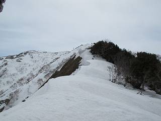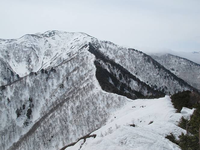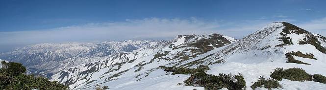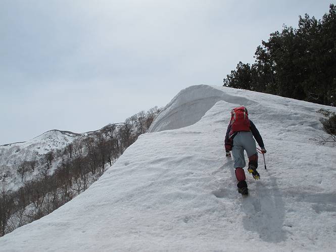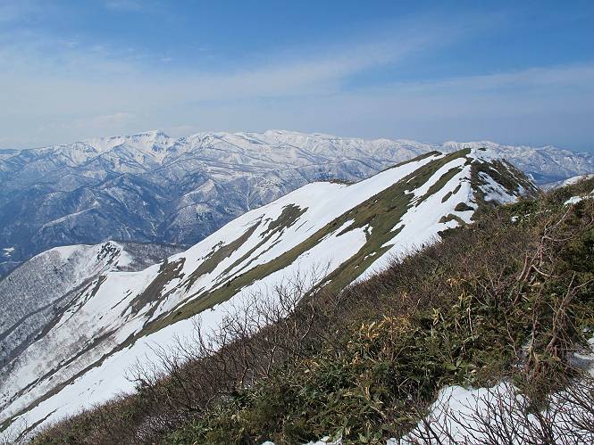 【中編:日白山〜一ノ肩〜平標山】 【後編:平標山〜松手山〜二居集落】へ 【前編:二居集落〜日白山】へ 沢山のトレースのある雪庇、日白山から二居集落の距離が短く利用者が多いとか、鞍部に赤い目印があり、トレースもここで減った。登り返して、三角点のあるピーク(二居俣ノ頭)に立つ。ここで2回目の確認だ、地図上にある両端崖のヤセオネ、どう見ても見当たらない。雪庇で被われているのかな、とりあえず、無いので安心する。上部の崩落は思ったより小さいようだ、これも安心材料。もし、引き返す場合はこの辺から派生する枝尾根が3本ほどある、気温はあまり上昇してないので、エスケープに利用できよう。tomoさんは慎重だ、お陰で安心してついて来られる。全部で数ヶ所巻いたが、私が考えるより、気遣ってか、大きく巻き、丁寧な歩き方をしていた。10:11最初の鞍部、10:27-10:47三角点のあるピーク(二居俣ノ頭)でルート見極め、12:15危険地帯脱出(標高1700m付近)、12:54一ノ肩で登山道に無事合流。tomoさんは、ほっと胸を撫で下ろしたことでしょう。 日白山の下り、兎に角急で、飛び込むような格好でした 日白山から南に下る この辺は大勢歩いた跡があり、分岐の目印か、ブナに赤い紐が 3人ほどの新しいトレースを踏んでP1584.1に登り返す 日白山を振り返る P1584.1から尾根の雪庇の状態を眺める、この直ぐ先 ずっと見通すと上部に崩落した跡あり 拡大すると、要注意かな、樹林帯の中を巻けそうでもある 最初の崩落ヶ所、トレースも樹林帯の中を巻いていた ここの亀裂を渡って藪を漕いだんですよ(tomoさん提供) うーん、この先はどうなっているのだろう ここも安全をみて樹林帯の中を巻く 雪庇の上に出て、巻いたヶ所を振り返る ここで、上部をtomoさんが望遠レンズで観察、「通過できそうな感じ」、と言う 尾根筋から注意深く観てきたが、影になっている崩落ヶ所あり トレースはここも大きく巻いていた 笹、シャクナゲを漕いで無事通過 上部の崩落ヶ所に大分近づいてきた tomoさん、「こんな所でテントを張ったのか ここでトレースは途切れていた、西側へ下ったようだ 」 ここで前方を展望する 画像クリック拡大 いよいよ怪しい場所に近づいた 雪庇を急登し、 クロベの森を漕ぐ 抜け出た場所から辿ってきた尾根筋を振り返る 画像クリック拡大 1550m付近、前方にもう一ヶ所、怪しい場所が・・・ 画像クリック拡大 一息入れて、最後の難所へ? その先は一ノ肩だろう? 樹林帯をかすめて、 ダケカンバと苗場山にみとれて一枚 また、雪庇の上へ、辿ってきた雪庇の尾根 画像クリック拡大 ここを歩いていた時は、もう、ルンルンでした(tomoさん提供) 最後は呆気なく抜けてしまったようだ 画像クリック拡大 崩落ヶ所を振り返る 抜けてきたクロベの向こうに苗場山 振り向いても、どこをどう通ってきたか? もう一ノ肩は直ぐ先、雪庇は終わり雪原に近い、ここでtomoさんの安全宣言 画像クリック拡大 近いピークにtomoさんのステップも軽く トレースだらけの緩やかな斜面、ハイマツ、笹、シャクナゲがあちらこちらで葉を出していた 一ノ肩で登山道に合流 間もなく大山祇碑 一ノ肩からはお互い通い慣れた道、合流点から露出した道をアイゼンをつけたまま歩く、tomoさんは途中で外してましたが。13:16平標山の西のピーク、13:25-13:54平標山山頂。山頂に近づくや、天空は青空に被われ、新潟県側の眺望に見入ってしまった。特に、朝から辿ってきた雪庇の道を何度も目で追った。 平標山は歓迎ムード、天空は青空に、手前のぴーくから巻機山〜平標山を一望 画像クリック拡大 同、手前のピークから茂倉岳〜平標山 画像クリック拡大 同、仙ノ倉山、平標山 空は青空、気持ちはウキウキ、予定外の平標山山頂だ(tomoさん提供) 平標山西斜面から帰路通る一ノ肩、松手山、その奥に苗場山、 平標山山頂 平標山山頂から大源太山の頭がちょっと、群馬県側は曇り 同、仙ノ倉山 同、仙ノ倉山 同、巻機山方面 同、日白山方面 同、苗場山〜巻機山 画像クリック拡大 同、巻機山〜仙ノ倉山 画像クリック拡大 ここで、こんなことを書くのは可笑しいが、一ノ肩までは聞いていたが、その先、平標山往復は聞いてなかった。私の足と回復してきた天気のお陰か、付け足してくれたのだろう。山頂の景色は見るたびに違うものだ、まだ深い雪に覆われた越後の山、まだまだ雪遊びできそうだ。 【後編:平標山〜松手山〜二居集落】へ 【前編:二居集落〜日白山】へ |