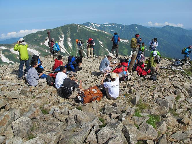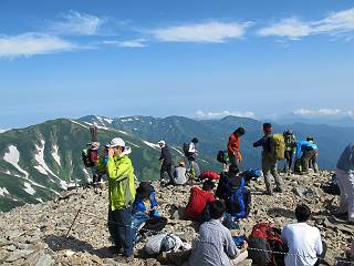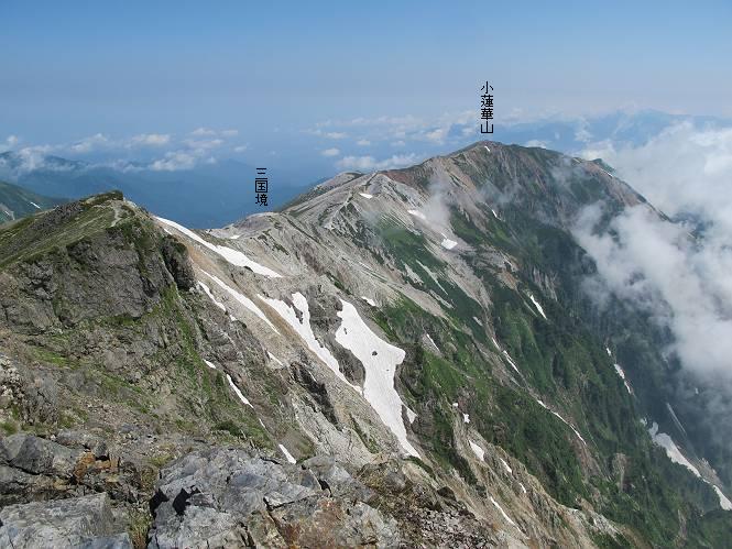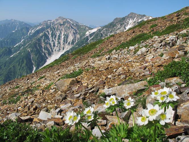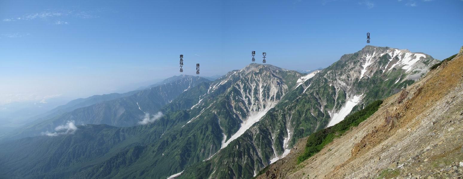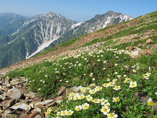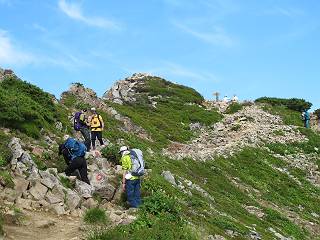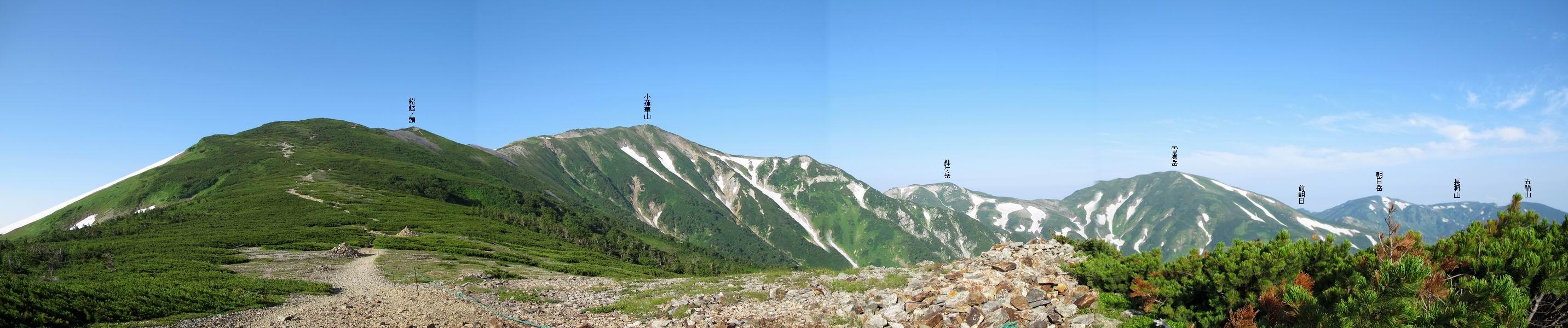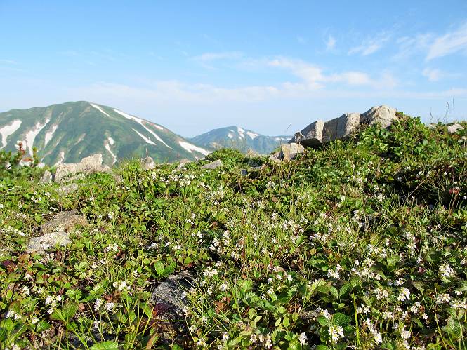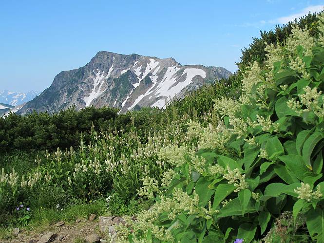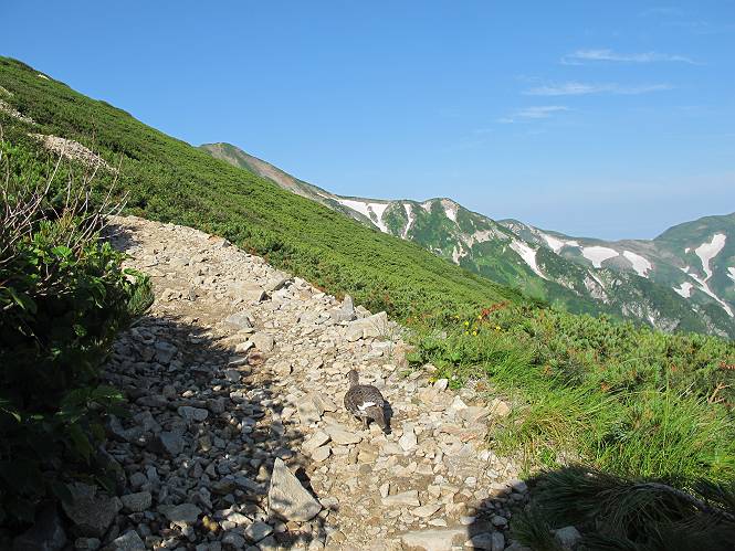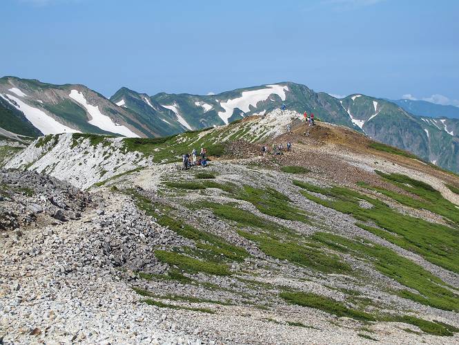 2.白馬大池⇒白馬岳 3.白馬岳⇒雪倉避難小屋 4.雪倉避難小屋⇒朝日岳 5.朝日岳⇒蓮華温泉 TOPへ戻る 白馬大池のパラダイスを後に、白馬岳に向かう。すでに一帯は森林限界を越えており、眺望を遮るものはない。遮るとすれば、足元の斜面だけである。振り向いては白馬大池を眺め、目指す小蓮華山、白馬岳を稜線上に見て進む。2500m超の稜線歩きの醍醐味を味わえる。呼吸が乱れるようなら立ち止まって足元の花に、遠い雲に語りかける。決してラクではないが、山並と花々が力を与えてくれるだろう、7:43船越ノ頭。 白馬大池を振り返り 稜線上の小蓮華山を追う 小蓮華山〜朝日岳 画像クリック拡大 【ヒメコゴメグサ】 背景は雪倉岳と朝日岳 徐々に高度を上げ、緑に囲まれた白馬大池が神秘性を帯びてくる ふと、足元に餌を啄ばむ雷鳥(♂)の姿 距離をおいて後につく、ハイマツの茂みに入りかけたりしながら15mほど歩く 下って来た女性に静かにタッチしその場を離れる 大分上ってきたぞ、雪倉岳、朝日岳 白馬大池 小さいアップダウンを繰り返す稜線、先端が小蓮華山 点々と向かう人、下る人 鹿島槍ヶ岳、唐松岳、鑓ケ岳が視界に入る 鑓ケ岳と杓子岳、剱岳もチョコンと飛び出す 船越ノ頭2612m 足元にミヤマダイコンソウ 船越ノ頭から小蓮華山、中間にもう一つピークがありそうだ 小蓮華山へまた1歩近づいた 鞍部から振り返る、船越ノ頭に5,6人 ガレ場を登る 船越ノ頭を下って鞍部へ、丁度下りのラッシュかな、いっぱい、どの顔も満足そうに見えた。これが昼過ぎると、特に登りの人は力の入った様相に変る、まれには悲壮感に満ちてくる。一声かけてやりたいが、口を閉ざして首を下げるだけ、午前中の顔は皆良い顔だ。小蓮華山山頂を目前にして、横にちょっと寄って立ち止まっていたら、本日2度目の雷鳥の姿、隣に居合せた方が「カワイイ・・・」、見ると雷鳥の子、今年のヒナだ、チョコチョコ歩き回る、その姿は・・・・。親鳥は「グー、グー・・・」鳴いて躾けているようだった。次の瞬間、親鳥のとまっている岩の横にチョコンと上って並んだ。その親子の目線が生息圏の白馬三山を見入っているようで、当山行の印象に残る一コマであった、8:42小蓮華山着。 行き交う人大勢 狭い道は譲り合い、総勢22人の団体さんのようです 【タカネヤハズハハコ】 【タカネナデシコ】 【ヤハズヒゴタイ】 【イブキジャコウソウ】 画像クリック拡大 【ホソバツメクサ】 【チシマギキョウ】 【ミヤマアズマギク】 【ミヤマタンポポ】 【ウサギギク】 【エゾシオガマ】 【イワカガミ】 【アオノツガザクラ】 ガレた道も少々あり 白馬三山、左が鑓ケ岳&杓子岳、右が白馬岳 【チングルマ】 背景は鑓ケ岳と白馬岳 【ハクサンイチゲ】 背景は鑓ケ岳と白馬岳 「グーグー・・・、こっちへ来なさい」 「なーに、お母さん」 「良ーく、見ておくんだよ、・・・・・」 「わかったよ、私達の棲みかは美しくて雄大だね、・・・・」、といった感じかな 【ハクサンフウロ】 【ミヤマアキノキリンソウ】 【コバイケイソウ】 【コバイケイソウとオンタデ】 【ミヤマダイモンジソウ】 小蓮華山山頂直下 賑わう小蓮華山山頂 小蓮華山山頂からの眺望、白馬大池から小蓮華山の稜線、背景は頚城山塊 画像クリック拡大 同、鹿島槍ヶ岳〜朝日岳 画像クリック拡大 同、鹿島槍ヶ岳、白馬三山 同、くつろぐハイカー 同、白馬岳 同、鑓ケ岳&杓子岳 同、鉢ケ岳 同、雪倉岳、朝日岳 小蓮華山の山頂部は亀裂が入り、ロープが張られたままになっているが、進んでいるようには見えなかった。南側に面した急斜面はいつ崩落するかわからないとか。賑わう山頂を後にガレた斜面を下り、細かい砂礫の道に変る。見渡す山並を楽しみながら進むと間もなく雪倉岳方面の分岐点、三国境に出る、9:26。 白馬岳に向かって@ 白馬岳に向かってA 白馬岳に向かってB 【ヨツバシオガマ】 アップダウンを2度繰り返し、小蓮華山を振り返る 白馬岳山頂部が見えてきた 雪倉岳、朝日岳も近づいてきた様子 雪倉岳、朝日岳の分岐点、三国境 分岐点にザックをデポして白馬岳に向かう。岩場は花盛り、チシマギキョウ、クモマミミナグサ、ミヤマクワガタ、ミヤマタンポポ、ミヤマアズマギクなどなど楽しませてくれる。山頂直下のピークを乗り越えると、いよいよクライマックス、当HPのTOPページの撮影点の到着する。夏のバージョンに張り替えようとしたが、どうも代えることに抵抗を感じ、開設以来の写真を使用している。また、この小蓮華山〜白馬岳の画像をNHKドラマ『坂の上の雲』で使用したとか、どこやらのジオ○○のHPの中でも北側から見た白馬岳山頂を載せていた。どうも、つまらないことを書いてしまいました、10:08着。 【チシマギキョウ】 【クモマミミナグサ】 【ミヤマクワガタ】 【ミヤマアズマギク】 【ミヤマタンポポ】 【タカネシオガマ】 【シナノキンバイ】 【ハクサンイチゲ】 【イワカガミ】 白馬岳直下から小蓮華山を振り返る 白