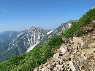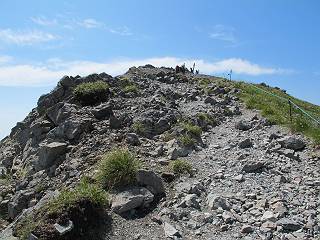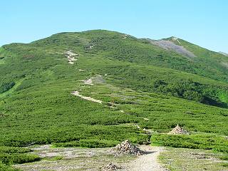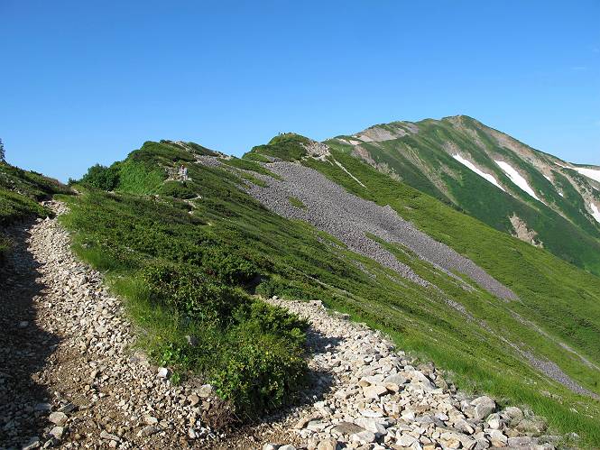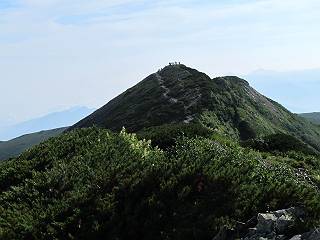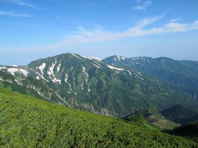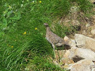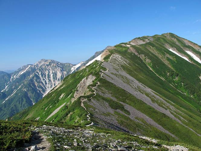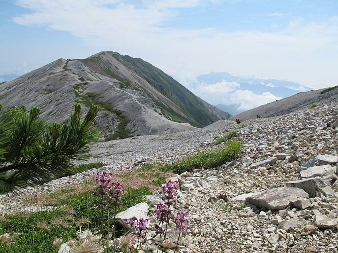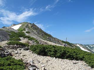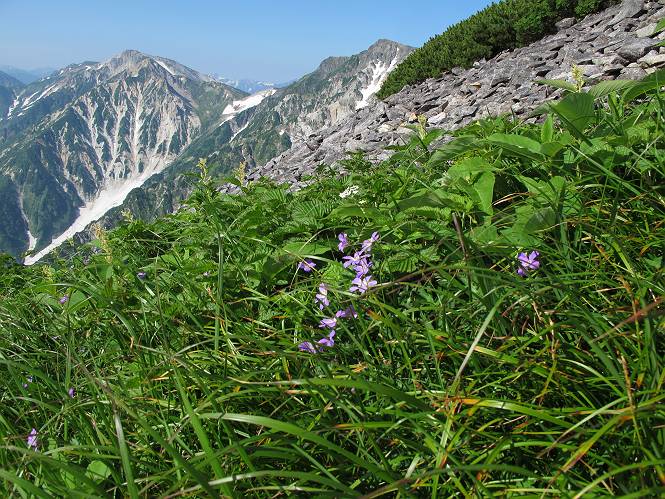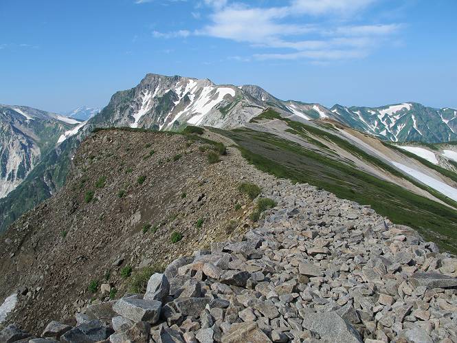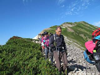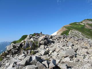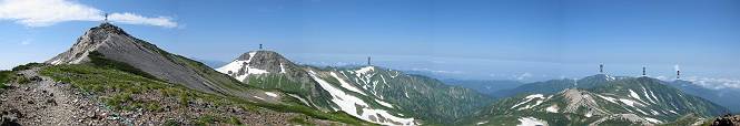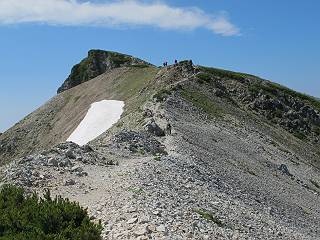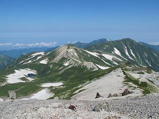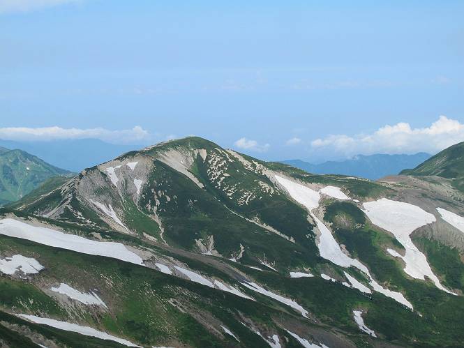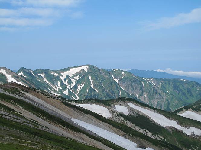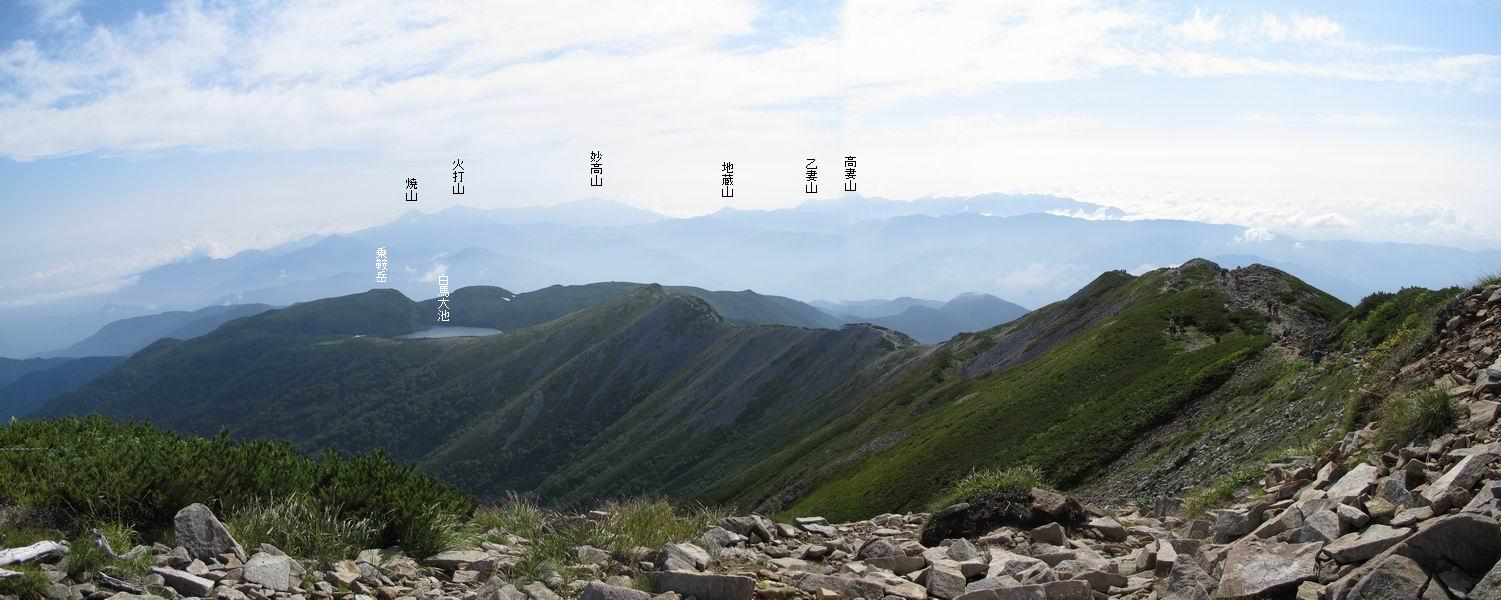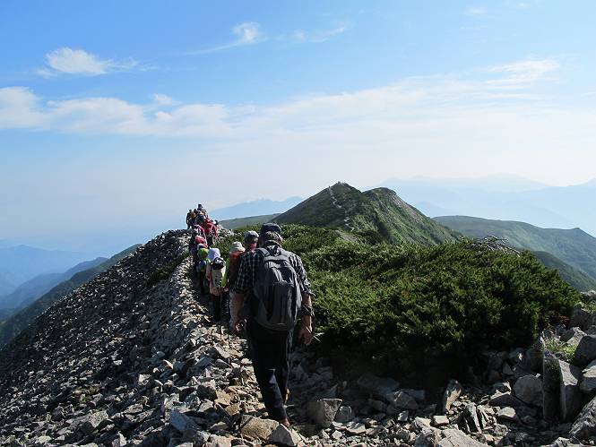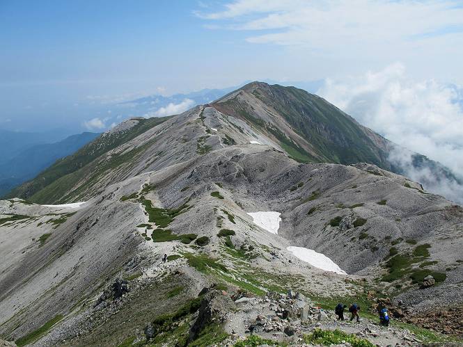 2.白馬大池⇒白馬岳 3.白馬岳⇒雪倉避難小屋 4.雪倉避難小屋⇒朝日岳 5.朝日岳⇒蓮華温泉 TOPへ戻る 白馬大池のパラダイスを後に、白馬岳に向かう。すでに一帯は森林限界を越えており、眺望を遮るものはない。遮るとすれば、足元の斜面だけである。振り向いては白馬大池を眺め、目指す小蓮華山、白馬岳を稜線上に見て進む。2500m超の稜線歩きの醍醐味を味わえる。呼吸が乱れるようなら立ち止まって足元の花に、遠い雲に語りかける。決してラクではないが、山並と花々が力を与えてくれるだろう、7:43船越ノ頭。 白馬大池を振り返り 稜線上の小蓮華山を追う 小蓮華山〜朝日岳 画像クリック拡大 【ヒメコゴメグサ】 背景は雪倉岳と朝日岳 徐々に高度を上げ、緑に囲まれた白馬大池が神秘性を帯びてくる ふと、足元に餌を啄ばむ雷鳥(♂)の姿 距離をおいて後につく、ハイマツの茂みに入りかけたりしながら15mほど歩く 下って来た女性に静かにタッチしその場を離れる 大分上ってきたぞ、雪倉岳、朝日岳 白馬大池 小さいアップダウンを繰り返す稜線、先端が小蓮華山 点々と向かう人、下る人 鹿島槍ヶ岳、唐松岳、鑓ケ岳が視界に入る 鑓ケ岳と杓子岳、剱岳もチョコンと飛び出す 船越ノ頭2612m 足元にミヤマダイコンソウ 船越ノ頭から小蓮華山、中間にもう一つピークがありそうだ 小蓮華山へまた1歩近づいた 鞍部から振り返る、船越ノ頭に5,6人 ガレ場を登る 船越ノ頭を下って鞍部へ、丁度下りのラッシュかな、いっぱい、どの顔も満足そうに見えた。これが昼過ぎると、特に登りの人は力の入った様相に変る、まれには悲壮感に満ちてくる。一声かけてやりたいが、口を閉ざして首を下げるだけ、午前中の顔は皆良い顔だ。小蓮華山山頂を目前にして、横にちょっと寄って立ち止まっていたら、本日2度目の雷鳥の姿、隣に居合せた方が「カワイイ・・・」、見ると雷鳥の子、今年のヒナだ、チョコチョコ歩き回る、その姿は・・・・。親鳥は「グー、グー・・・」鳴いて躾けているようだった。次の瞬間、親鳥のとまっている岩の横にチョコンと上って並んだ。その親子の目線が生息圏の白馬三山を見入っているようで、当山行の印象に残る一コマであった、8:42小蓮華山着。 行き交う人大勢 狭い道は譲り合い、総勢22人の団体さんのようです 【タカネヤハズハハコ】 【タカネナデシコ】 【ヤハズヒゴタイ】 【イブキジャコウソウ】 画像クリック拡大 【ホソバツメクサ】 【チシマギキョウ】 【ミヤマアズマギク】 【ミヤマタンポポ】 【ウサギギク】 【エゾシオガマ】 【イワカガミ】 【アオノツガザクラ】 ガレた道も少々あり 白馬三山、左が鑓ケ岳&杓子岳、右が白馬岳 【チングルマ】 背景は鑓ケ岳と白馬岳 【ハクサンイチゲ】 背景は鑓ケ岳と白馬岳 「グーグー・・・、こっちへ来なさい」 「なーに、お母さん」 「良ーく、見ておくんだよ、・・・・・」 「わかったよ、私達の棲みかは美しくて雄大だね、・・・・」、といった感じかな 【ハクサンフウロ】 【ミヤマアキノキリンソウ】 【コバイケイソウ】 【コバイケイソウとオンタデ】 【ミヤマダイモンジソウ】 小蓮華山山頂直下 賑わう小蓮華山山頂 小蓮華山山頂からの眺望、白馬大池から小蓮華山の稜線、背景は頚城山塊 画像クリック拡大 同、鹿島槍ヶ岳〜朝日岳 画像クリック拡大 同、鹿島槍ヶ岳、白馬三山 同、くつろぐハイカー 同、白馬岳 同、鑓ケ岳&杓子岳 同、鉢ケ岳 同、雪倉岳、朝日岳 小蓮華山の山頂部は亀裂が入り、ロープが張られたままになっているが、進んでいるようには見えなかった。南側に面した急斜面はいつ崩落するかわからないとか。賑わう山頂を後にガレた斜面を下り、細かい砂礫の道に変る。見渡す山並を楽しみながら進むと間もなく雪倉岳方面の分岐点、三国境に出る、9:26。 白馬岳に向かって@ 白馬岳に向かってA 白馬岳に向かってB 【ヨツバシオガマ】 アップダウンを2度繰り返し、小蓮華山を振り返る 白馬岳山頂部が見えてきた 雪倉岳、朝日岳も近づいてきた様子 雪倉岳、朝日岳の分岐点、三国境 分岐点にザックをデポして白馬岳に向かう。岩場は花盛り、チシマギキョウ、クモマミミナグサ、ミヤマクワガタ、ミヤマタンポポ、ミヤマアズマギクなどなど楽しませてくれる。山頂直下のピークを乗り越えると、いよいよクライマックス、当HPのTOPページの撮影点の到着する。夏のバージョンに張り替えようとしたが、どうも代えることに抵抗を感じ、開設以来の写真を使用している。また、この小蓮華山〜白馬岳の画像をNHKドラマ『坂の上の雲』で使用したとか、どこやらのジオ○○のHPの中でも北側から見た白馬岳山頂を載せていた。どうも、つまらないことを書いてしまいました、10:08着。 【チシマギキョウ】 【クモマミミナグサ】 【ミヤマクワガタ】 【ミヤマアズマギク】 【ミヤマタンポポ】 【タカネシオガマ】 【シナノキンバイ】 【ハクサンイチゲ】 【イワカガミ】 白馬岳直下から小蓮華山を振り返る 白