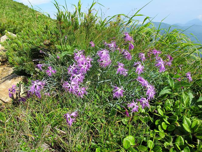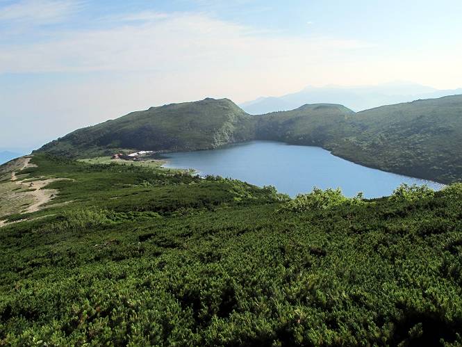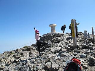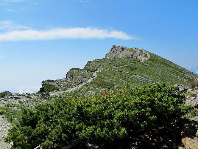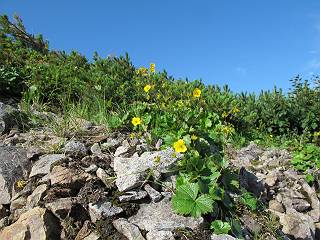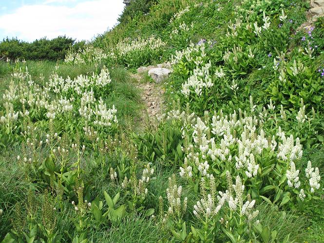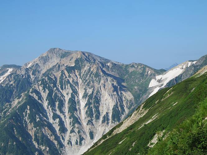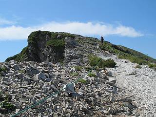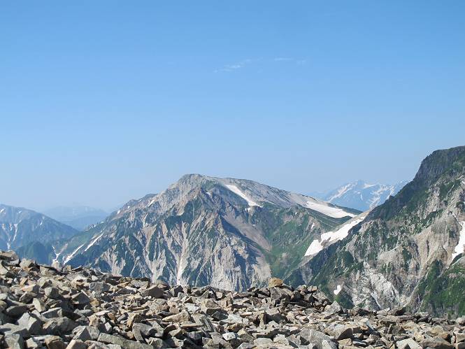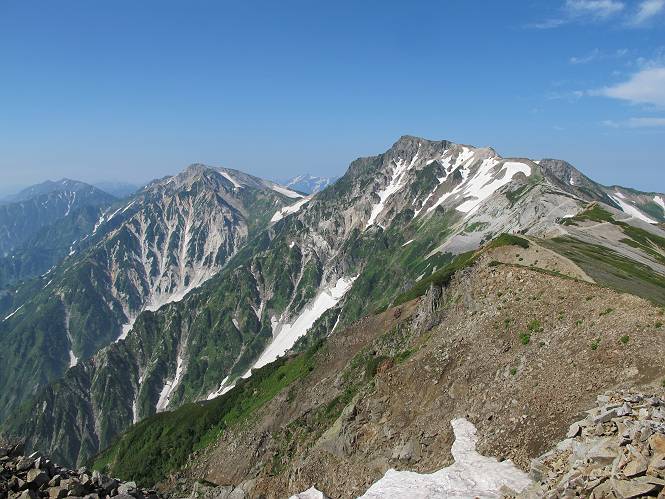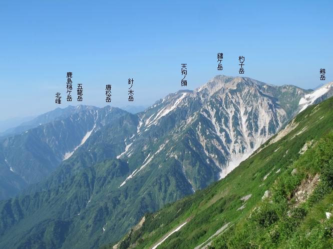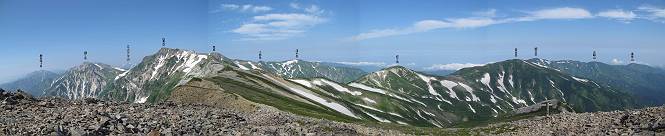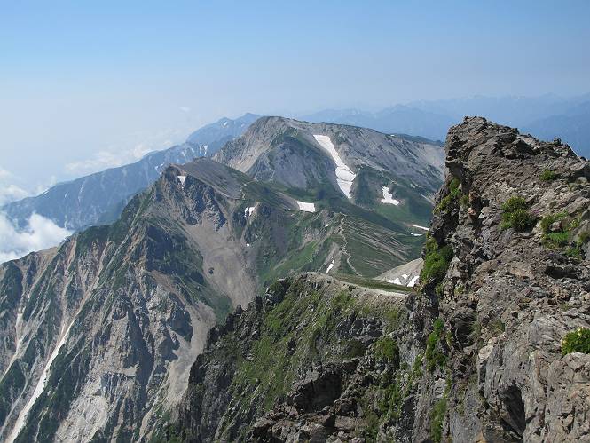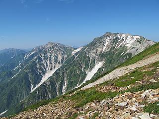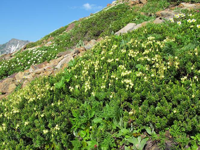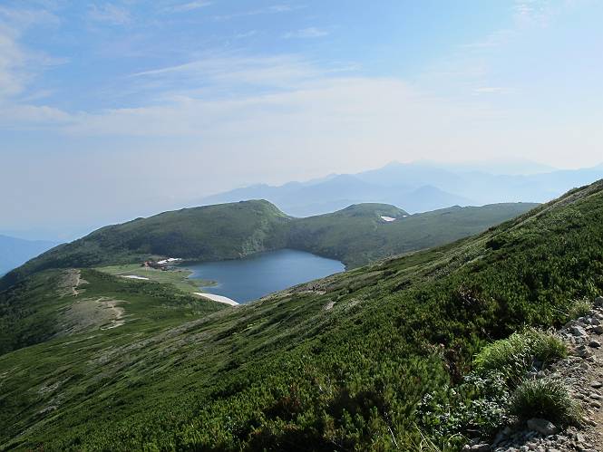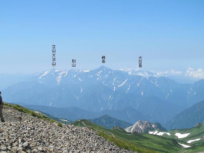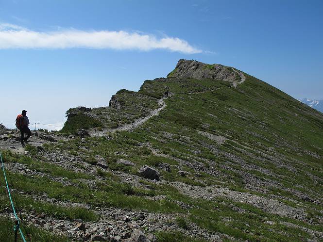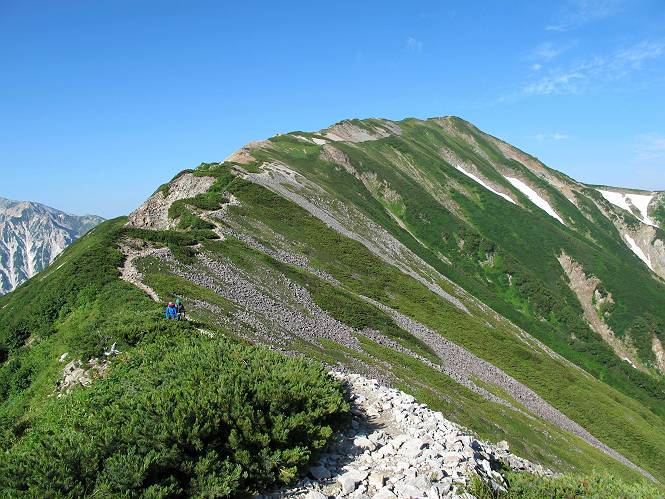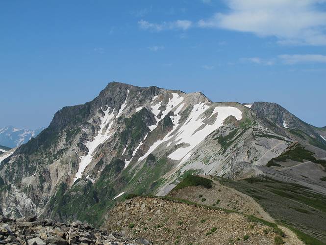 2.白馬大池⇒白馬岳 3.白馬岳⇒雪倉避難小屋 4.雪倉避難小屋⇒朝日岳 5.朝日岳⇒蓮華温泉 TOPへ戻る 白馬大池のパラダイスを後に、白馬岳に向かう。すでに一帯は森林限界を越えており、眺望を遮るものはない。遮るとすれば、足元の斜面だけである。振り向いては白馬大池を眺め、目指す小蓮華山、白馬岳を稜線上に見て進む。2500m超の稜線歩きの醍醐味を味わえる。呼吸が乱れるようなら立ち止まって足元の花に、遠い雲に語りかける。決してラクではないが、山並と花々が力を与えてくれるだろう、7:43船越ノ頭。 白馬大池を振り返り 稜線上の小蓮華山を追う 小蓮華山〜朝日岳 画像クリック拡大 【ヒメコゴメグサ】 背景は雪倉岳と朝日岳 徐々に高度を上げ、緑に囲まれた白馬大池が神秘性を帯びてくる ふと、足元に餌を啄ばむ雷鳥(♂)の姿 距離をおいて後につく、ハイマツの茂みに入りかけたりしながら15mほど歩く 下って来た女性に静かにタッチしその場を離れる 大分上ってきたぞ、雪倉岳、朝日岳 白馬大池 小さいアップダウンを繰り返す稜線、先端が小蓮華山 点々と向かう人、下る人 鹿島槍ヶ岳、唐松岳、鑓ケ岳が視界に入る 鑓ケ岳と杓子岳、剱岳もチョコンと飛び出す 船越ノ頭2612m 足元にミヤマダイコンソウ 船越ノ頭から小蓮華山、中間にもう一つピークがありそうだ 小蓮華山へまた1歩近づいた 鞍部から振り返る、船越ノ頭に5,6人 ガレ場を登る 船越ノ頭を下って鞍部へ、丁度下りのラッシュかな、いっぱい、どの顔も満足そうに見えた。これが昼過ぎると、特に登りの人は力の入った様相に変る、まれには悲壮感に満ちてくる。一声かけてやりたいが、口を閉ざして首を下げるだけ、午前中の顔は皆良い顔だ。小蓮華山山頂を目前にして、横にちょっと寄って立ち止まっていたら、本日2度目の雷鳥の姿、隣に居合せた方が「カワイイ・・・」、見ると雷鳥の子、今年のヒナだ、チョコチョコ歩き回る、その姿は・・・・。親鳥は「グー、グー・・・」鳴いて躾けているようだった。次の瞬間、親鳥のとまっている岩の横にチョコンと上って並んだ。その親子の目線が生息圏の白馬三山を見入っているようで、当山行の印象に残る一コマであった、8:42小蓮華山着。 行き交う人大勢 狭い道は譲り合い、総勢22人の団体さんのようです 【タカネヤハズハハコ】 【タカネナデシコ】 【ヤハズヒゴタイ】 【イブキジャコウソウ】 画像クリック拡大 【ホソバツメクサ】 【チシマギキョウ】 【ミヤマアズマギク】 【ミヤマタンポポ】 【ウサギギク】 【エゾシオガマ】 【イワカガミ】 【アオノツガザクラ】 ガレた道も少々あり 白馬三山、左が鑓ケ岳&杓子岳、右が白馬岳 【チングルマ】 背景は鑓ケ岳と白馬岳 【ハクサンイチゲ】 背景は鑓ケ岳と白馬岳 「グーグー・・・、こっちへ来なさい」 「なーに、お母さん」 「良ーく、見ておくんだよ、・・・・・」 「わかったよ、私達の棲みかは美しくて雄大だね、・・・・」、といった感じかな 【ハクサンフウロ】 【ミヤマアキノキリンソウ】 【コバイケイソウ】 【コバイケイソウとオンタデ】 【ミヤマダイモンジソウ】 小蓮華山山頂直下 賑わう小蓮華山山頂 小蓮華山山頂からの眺望、白馬大池から小蓮華山の稜線、背景は頚城山塊 画像クリック拡大 同、鹿島槍ヶ岳〜朝日岳 画像クリック拡大 同、鹿島槍ヶ岳、白馬三山 同、くつろぐハイカー 同、白馬岳 同、鑓ケ岳&杓子岳 同、鉢ケ岳 同、雪倉岳、朝日岳 小蓮華山の山頂部は亀裂が入り、ロープが張られたままになっているが、進んでいるようには見えなかった。南側に面した急斜面はいつ崩落するかわからないとか。賑わう山頂を後にガレた斜面を下り、細かい砂礫の道に変る。見渡す山並を楽しみながら進むと間もなく雪倉岳方面の分岐点、三国境に出る、9:26。 白馬岳に向かって@ 白馬岳に向かってA 白馬岳に向かってB 【ヨツバシオガマ】 アップダウンを2度繰り返し、小蓮華山を振り返る 白馬岳山頂部が見えてきた 雪倉岳、朝日岳も近づいてきた様子 雪倉岳、朝日岳の分岐点、三国境 分岐点にザックをデポして白馬岳に向かう。岩場は花盛り、チシマギキョウ、クモマミミナグサ、ミヤマクワガタ、ミヤマタンポポ、ミヤマアズマギクなどなど楽しませてくれる。山頂直下のピークを乗り越えると、いよいよクライマックス、当HPのTOPページの撮影点の到着する。夏のバージョンに張り替えようとしたが、どうも代えることに抵抗を感じ、開設以来の写真を使用している。また、この小蓮華山〜白馬岳の画像をNHKドラマ『坂の上の雲』で使用したとか、どこやらのジオ○○のHPの中でも北側から見た白馬岳山頂を載せていた。どうも、つまらないことを書いてしまいました、10:08着。 【チシマギキョウ】 【クモマミミナグサ】 【ミヤマクワガタ】 【ミヤマアズマギク】 【ミヤマタンポポ】 【タカネシオガマ】 【シナノキンバイ】 【ハクサンイチゲ】 【イワカガミ】 白馬岳直下から小蓮華山を振り返る 白