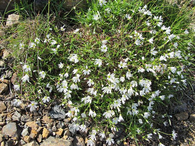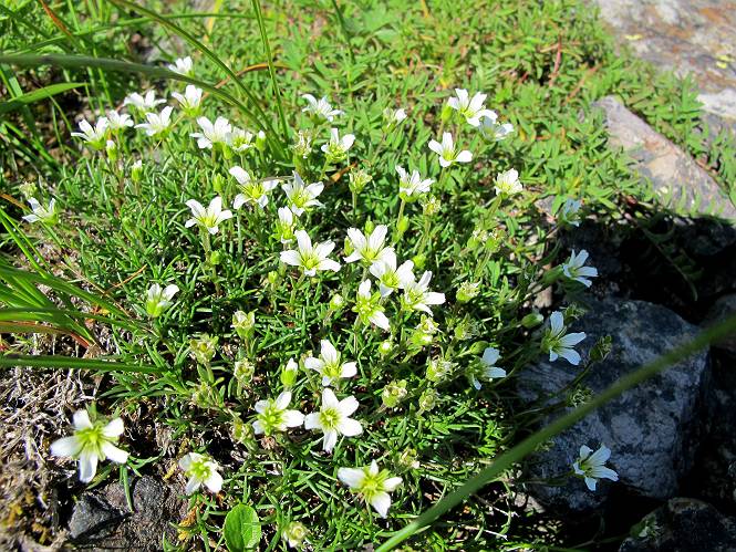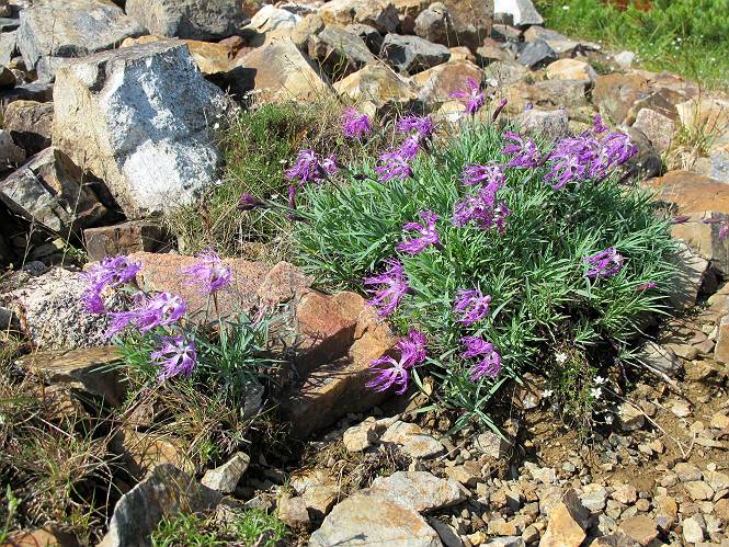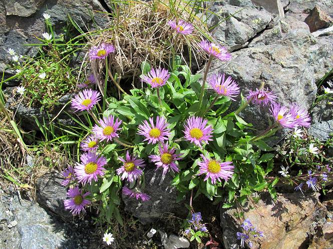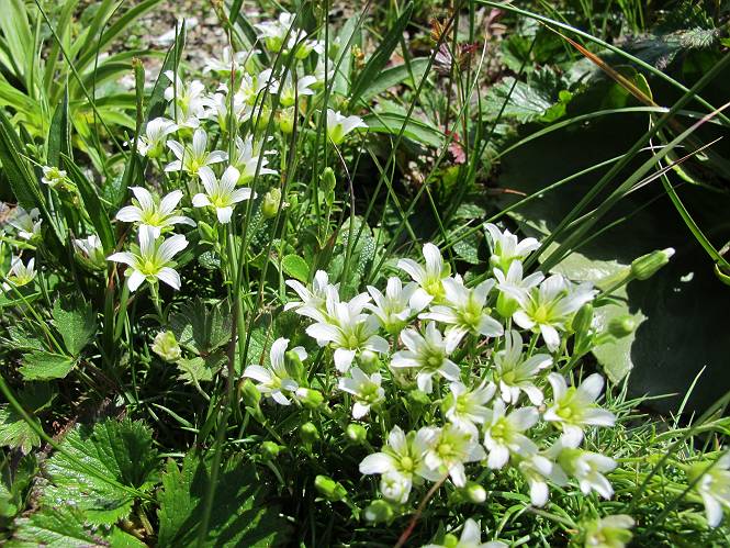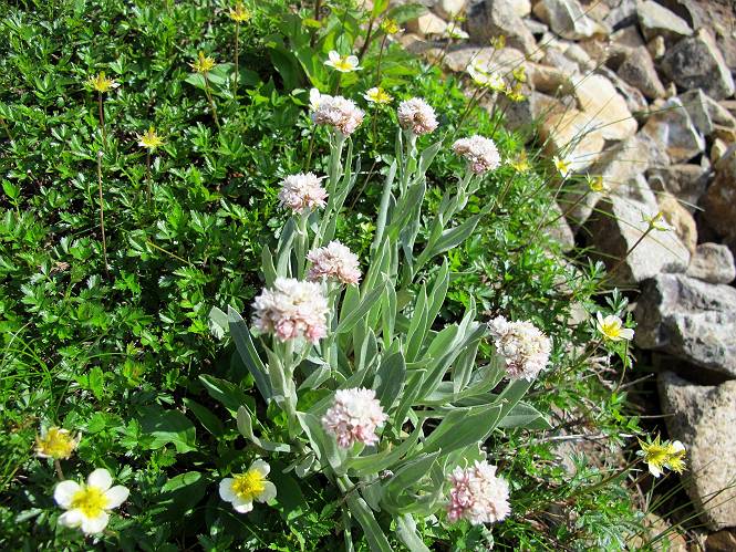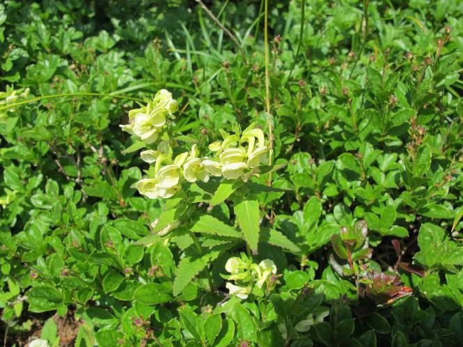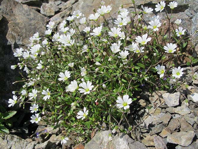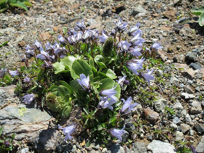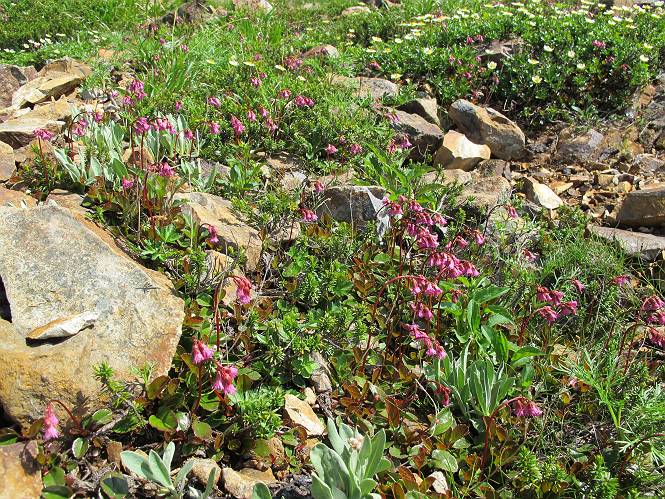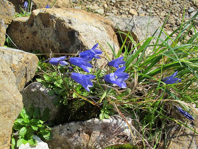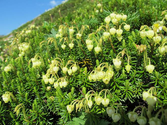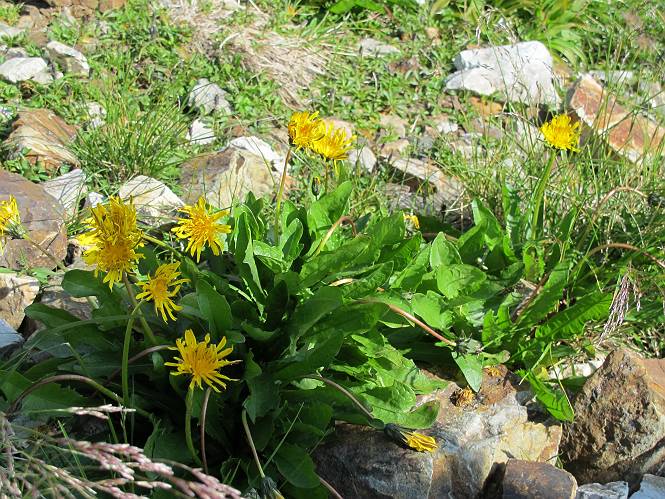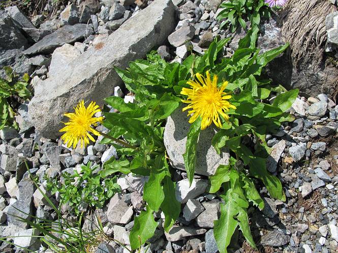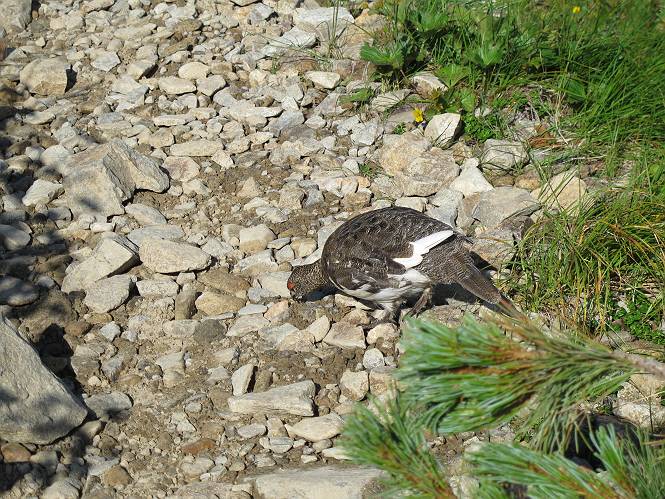 2.白馬大池⇒白馬岳 3.白馬岳⇒雪倉避難小屋 4.雪倉避難小屋⇒朝日岳 5.朝日岳⇒蓮華温泉 TOPへ戻る 白馬大池のパラダイスを後に、白馬岳に向かう。すでに一帯は森林限界を越えており、眺望を遮るものはない。遮るとすれば、足元の斜面だけである。振り向いては白馬大池を眺め、目指す小蓮華山、白馬岳を稜線上に見て進む。2500m超の稜線歩きの醍醐味を味わえる。呼吸が乱れるようなら立ち止まって足元の花に、遠い雲に語りかける。決してラクではないが、山並と花々が力を与えてくれるだろう、7:43船越ノ頭。 白馬大池を振り返り 稜線上の小蓮華山を追う 小蓮華山〜朝日岳 画像クリック拡大 【ヒメコゴメグサ】 背景は雪倉岳と朝日岳 徐々に高度を上げ、緑に囲まれた白馬大池が神秘性を帯びてくる ふと、足元に餌を啄ばむ雷鳥(♂)の姿 距離をおいて後につく、ハイマツの茂みに入りかけたりしながら15mほど歩く 下って来た女性に静かにタッチしその場を離れる 大分上ってきたぞ、雪倉岳、朝日岳 白馬大池 小さいアップダウンを繰り返す稜線、先端が小蓮華山 点々と向かう人、下る人 鹿島槍ヶ岳、唐松岳、鑓ケ岳が視界に入る 鑓ケ岳と杓子岳、剱岳もチョコンと飛び出す 船越ノ頭2612m 足元にミヤマダイコンソウ 船越ノ頭から小蓮華山、中間にもう一つピークがありそうだ 小蓮華山へまた1歩近づいた 鞍部から振り返る、船越ノ頭に5,6人 ガレ場を登る 船越ノ頭を下って鞍部へ、丁度下りのラッシュかな、いっぱい、どの顔も満足そうに見えた。これが昼過ぎると、特に登りの人は力の入った様相に変る、まれには悲壮感に満ちてくる。一声かけてやりたいが、口を閉ざして首を下げるだけ、午前中の顔は皆良い顔だ。小蓮華山山頂を目前にして、横にちょっと寄って立ち止まっていたら、本日2度目の雷鳥の姿、隣に居合せた方が「カワイイ・・・」、見ると雷鳥の子、今年のヒナだ、チョコチョコ歩き回る、その姿は・・・・。親鳥は「グー、グー・・・」鳴いて躾けているようだった。次の瞬間、親鳥のとまっている岩の横にチョコンと上って並んだ。その親子の目線が生息圏の白馬三山を見入っているようで、当山行の印象に残る一コマであった、8:42小蓮華山着。 行き交う人大勢 狭い道は譲り合い、総勢22人の団体さんのようです 【タカネヤハズハハコ】 【タカネナデシコ】 【ヤハズヒゴタイ】 【イブキジャコウソウ】 画像クリック拡大 【ホソバツメクサ】 【チシマギキョウ】 【ミヤマアズマギク】 【ミヤマタンポポ】 【ウサギギク】 【エゾシオガマ】 【イワカガミ】 【アオノツガザクラ】 ガレた道も少々あり 白馬三山、左が鑓ケ岳&杓子岳、右が白馬岳 【チングルマ】 背景は鑓ケ岳と白馬岳 【ハクサンイチゲ】 背景は鑓ケ岳と白馬岳 「グーグー・・・、こっちへ来なさい」 「なーに、お母さん」 「良ーく、見ておくんだよ、・・・・・」 「わかったよ、私達の棲みかは美しくて雄大だね、・・・・」、といった感じかな 【ハクサンフウロ】 【ミヤマアキノキリンソウ】 【コバイケイソウ】 【コバイケイソウとオンタデ】 【ミヤマダイモンジソウ】 小蓮華山山頂直下 賑わう小蓮華山山頂 小蓮華山山頂からの眺望、白馬大池から小蓮華山の稜線、背景は頚城山塊 画像クリック拡大 同、鹿島槍ヶ岳〜朝日岳 画像クリック拡大 同、鹿島槍ヶ岳、白馬三山 同、くつろぐハイカー 同、白馬岳 同、鑓ケ岳&杓子岳 同、鉢ケ岳 同、雪倉岳、朝日岳 小蓮華山の山頂部は亀裂が入り、ロープが張られたままになっているが、進んでいるようには見えなかった。南側に面した急斜面はいつ崩落するかわからないとか。賑わう山頂を後にガレた斜面を下り、細かい砂礫の道に変る。見渡す山並を楽しみながら進むと間もなく雪倉岳方面の分岐点、三国境に出る、9:26。 白馬岳に向かって@ 白馬岳に向かってA 白馬岳に向かってB 【ヨツバシオガマ】 アップダウンを2度繰り返し、小蓮華山を振り返る 白馬岳山頂部が見えてきた 雪倉岳、朝日岳も近づいてきた様子 雪倉岳、朝日岳の分岐点、三国境 分岐点にザックをデポして白馬岳に向かう。岩場は花盛り、チシマギキョウ、クモマミミナグサ、ミヤマクワガタ、ミヤマタンポポ、ミヤマアズマギクなどなど楽しませてくれる。山頂直下のピークを乗り越えると、いよいよクライマックス、当HPのTOPページの撮影点の到着する。夏のバージョンに張り替えようとしたが、どうも代えることに抵抗を感じ、開設以来の写真を使用している。また、この小蓮華山〜白馬岳の画像をNHKドラマ『坂の上の雲』で使用したとか、どこやらのジオ○○のHPの中でも北側から見た白馬岳山頂を載せていた。どうも、つまらないことを書いてしまいました、10:08着。 【チシマギキョウ】 【クモマミミナグサ】 【ミヤマクワガタ】 【ミヤマアズマギク】 【ミヤマタンポポ】 【タカネシオガマ】 【シナノキンバイ】 【ハクサンイチゲ】 【イワカガミ】 白馬岳直下から小蓮華山を振り返る 白