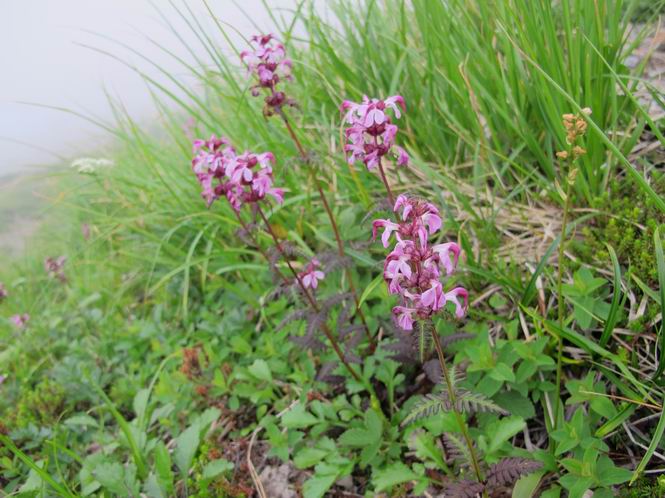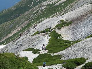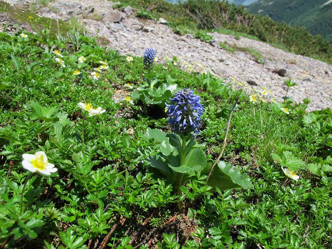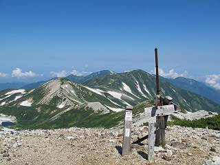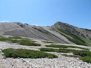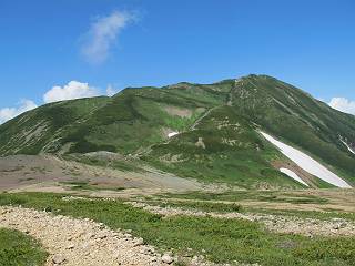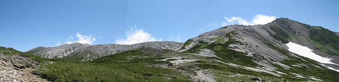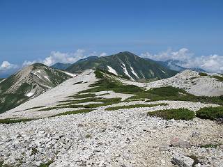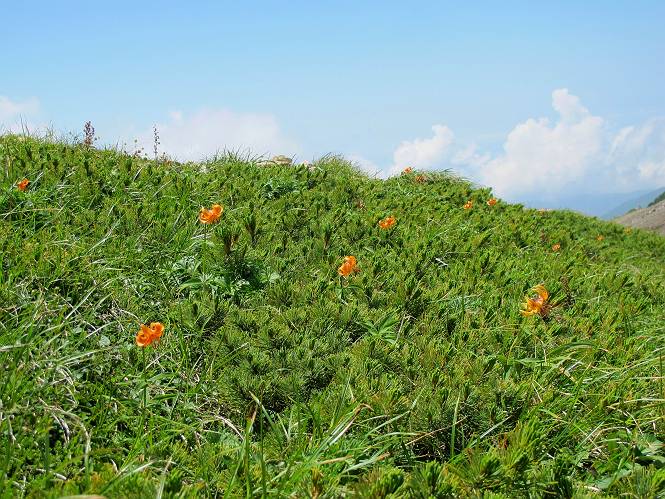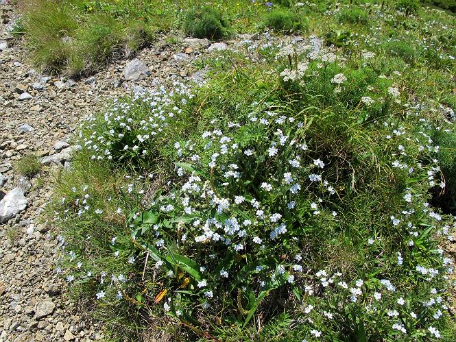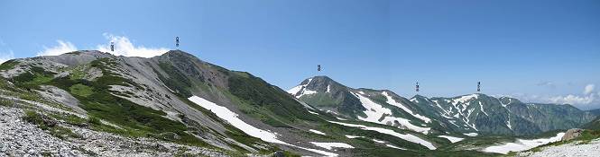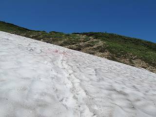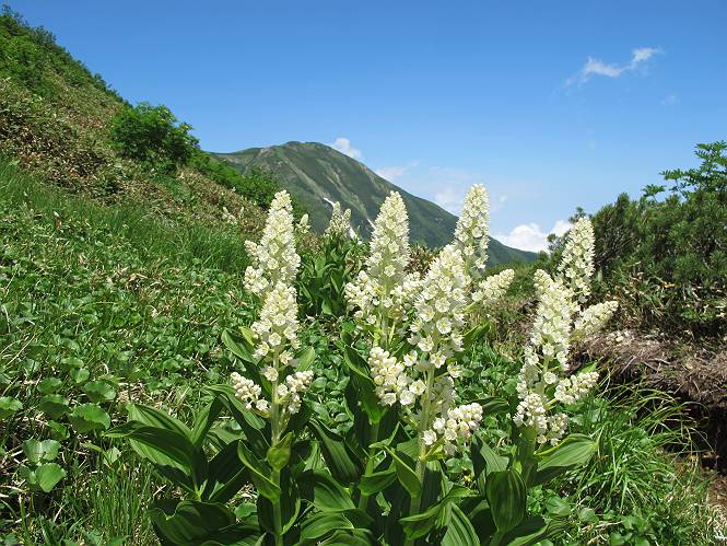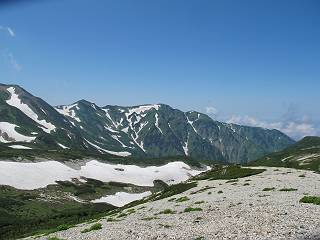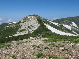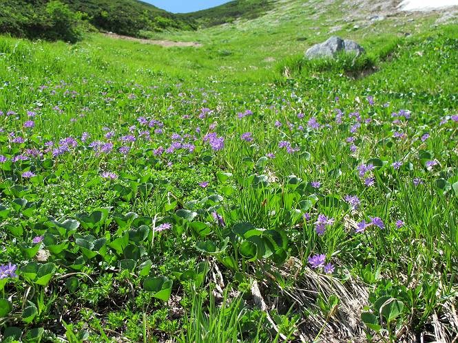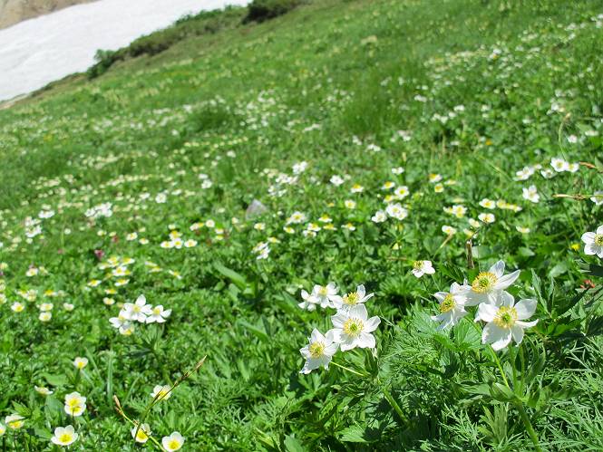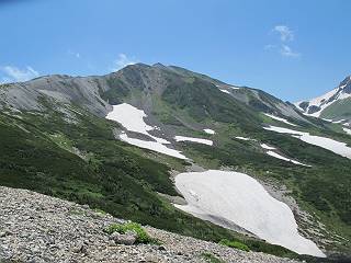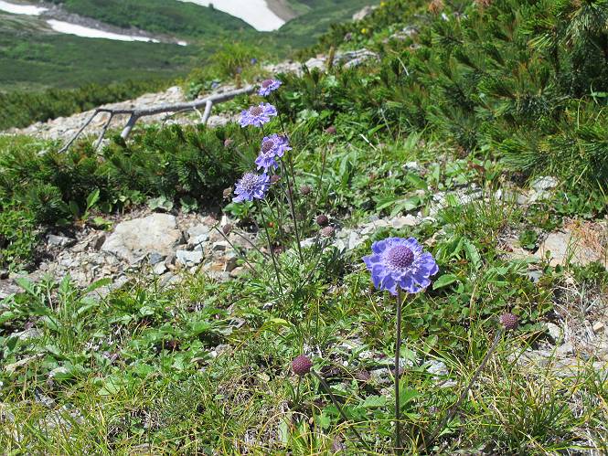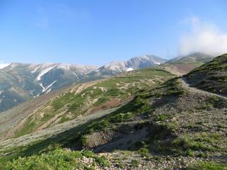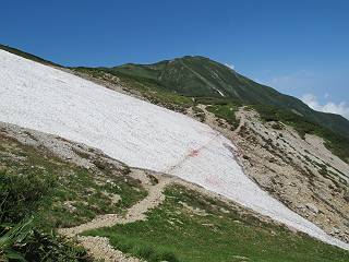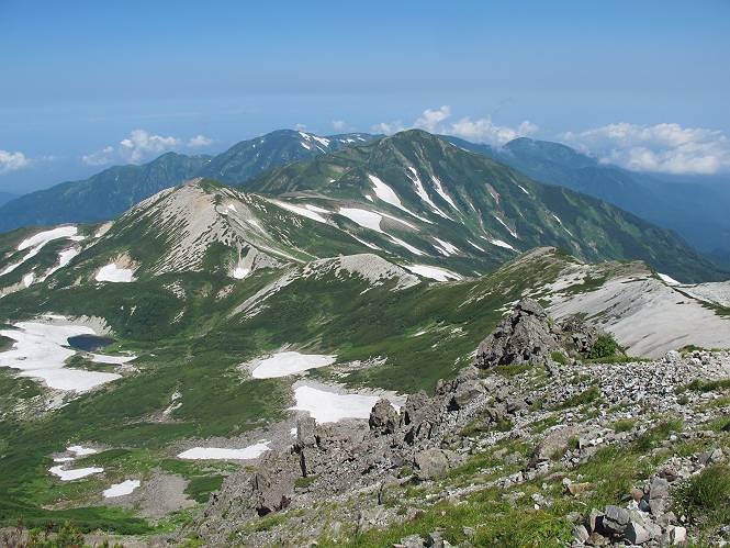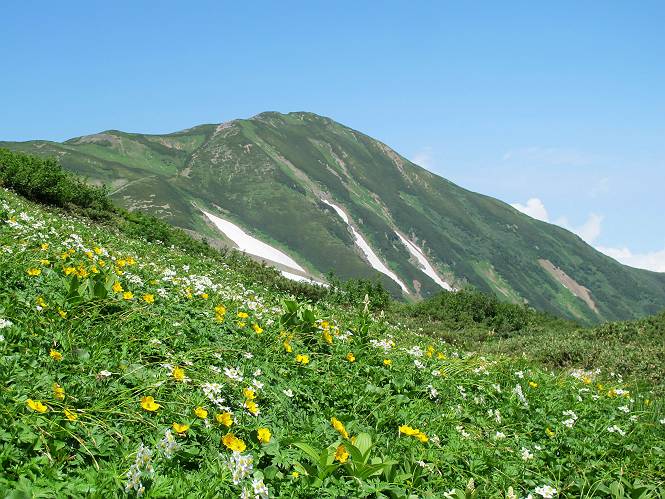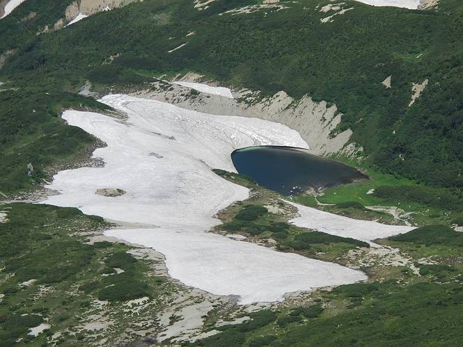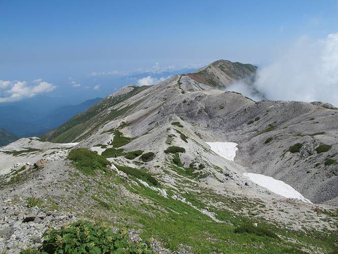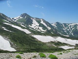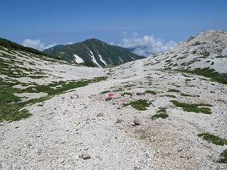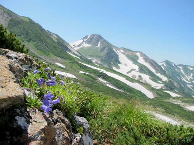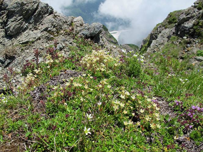 3.白馬岳⇒雪倉避難小屋 4.雪倉避難小屋⇒朝日岳 5.朝日岳⇒蓮華温泉 TOP 2. へ戻る 白馬岳山頂からザックをデポした三国境へ折り返す。向かう雪倉方面のルートを確認しながら下るのであるが、登山道沿いに咲く花も気になる、シコタンソウを往路で見逃していた。15分ほど下ったところで、先ほど会った女性にまた行きあった。山頂往復してくる間にあまり進んでない。ペースが遅いが、足元はしっかりしているし、日暮れまでには大池山荘に着く予定と言っていた、心配することはないだろう。 雪倉方面に続く尾根を眺めながら分岐点、三国境を目指す 稜線下に湖あり、長池 【イブキジャコウソウ、チシマギキョウ】 【シコタンソウ】 【イワツメクサ】 三国境に近づいた、ルートには点々と山頂に向かう人 三国境着、いよいよ雪倉岳のコースに入る 10:45三国境着、20分休憩したが、その人は来なかった。雪倉避難小屋目指して、礫岩の道を下る。濃霧等で道から外れたら迷う込んでしまいそうな道だ、そこは、小間隔で赤ペンキの塗られた石、要所に建てられた道標があるので安心して歩ける。三国境出発時間からして、16:00までに旭小屋に着くのは容易でないと考え、本日は避難小屋泊とする。避難小屋までのルートは、まず、三国境の北西方向にある鉢ケ岳へ通じる尾根を下り、P2504で鉱山道と合流し鞍部まで下る。鞍部から鉢ケ岳を巻き鉢ケ岳-雪倉岳の稜線に出て、雪倉岳方向に進めば雪倉岳の鞍部に避難小屋がある、コースタイムで1時間半ほど。タカネマツムシソウ(別名ミヤママツムシソウ)が点々と咲き出している。花はマツムシソウより大きいし、色鮮やかで豪華な花だ。清水岳を2011年に歩いているが、近いことでもあり植生が似通っているようだ、11:38鉱山道の分岐点に出る。 大粒小粒の礫の道、赤丸と道標が頼りの道 一段下った所から振り返る、白馬岳方面 三国境方面 小蓮華山方面 赤○を拾いながら下降する 【アオノツガザクラ】 【ミネズオウ】 【タカネマツムシソウ】 【チシマギキョウ】 下り斜面が緩やかになった所で白馬山頂を振り返る 画像クリック拡大 ![]() 同、小蓮華山方向を振り返る 画像クリック拡大 鉢ケ岳の右側を巻く 白馬岳山頂方面 旭岳、小旭岳 清水岳 残り花、コマクサの小群落を過ぎると 間もなく鉱山道の分岐点 【タカネマツムシソウ、タカネシオガマ】 【イワオウギ】 【ミヤマムラサキ】 【コバイケイソウ】 巻き道に入り、4ヶ所ほど雪渓を通過し、笹尾根をよじ登れば鉢ケ岳と雪倉山を結ぶ稜線に出る。雪渓付近ではシナノキンバイ、ハクサンイチゲ、ハクサンコザクラ、コバイケイソウ、ミヤマキンポウゲの群落が花盛りだった。ここまで、ウルップソウはことごとく終わっていたが、雪渓脇で3本、残り花を見つけた。稜線を辿りながら、礫の間に根づいた花々を撮る、群落はないが種類が多いこと。 雪渓はベンガラがまいてあった、最初の雪渓 小蓮華山、乗鞍岳方面 【ミヤマキンバイ】 【ミヤマキンポウゲ、コバイケイソウ】 【ミヤマキンポウゲ】 【ハクサンイチゲ】 【シナノキンバイ】 2番目の雪渓を斜め上方向に渡る 【ハクサンコザクラ】 【ウルップソウ】 白馬岳方向を振り返る 最後の雪渓、水を容器満杯にした 稜線を辿り、小ピークを越えると鞍部に避難小屋が見えた 【クルマユリ】 【イワショウブ】 【ウメバチソウ】 【タテヤマウツボグサ】 【ミヤマアケボノソウ】 【タカネナデシコ】 【ヨツバシオガマ】 【カライトソウ】 【タカネツメクサ】 【イワシモツケ】 【シモツケソウ】 【ハクサンフウロ】 【イワオウギ】 【タカネマツムシソウ】 【ハクサンシャジン】 【イブキジャコウソウ】 【クモマミミナグサ】 雪倉避難小屋から小蓮華山方面 同、道なり正面が雪倉岳山頂方向 12:35、雪倉避難小屋着、ザックを小屋に入れたところで、ガスって強風が吹き出す。一時視界が30mほどになった。でも後続の7,8人がその中を朝日小屋方面に向かった。 4.雪倉避難小屋⇒朝日岳 5.朝日岳⇒蓮華温泉 TOP 2. へ戻る |