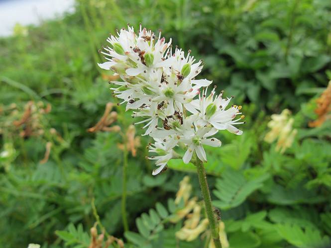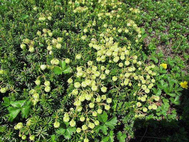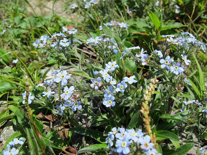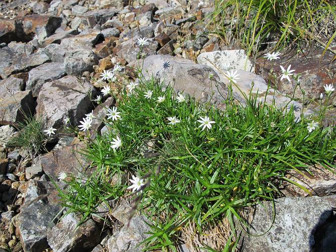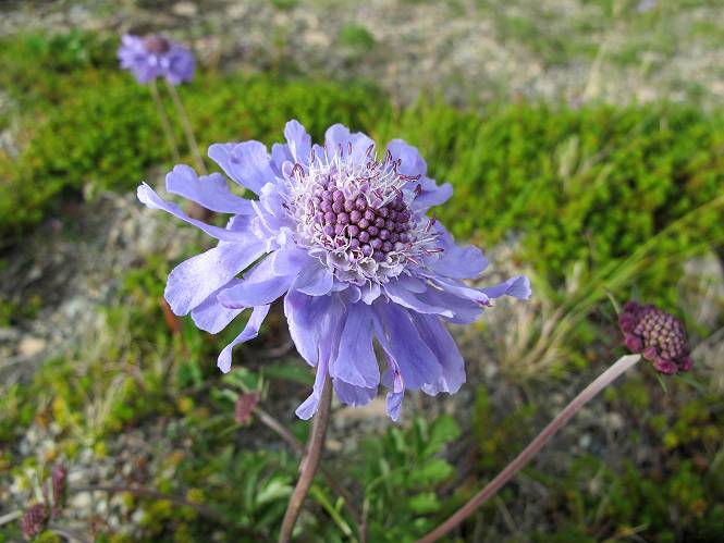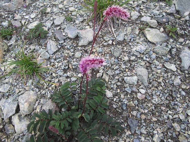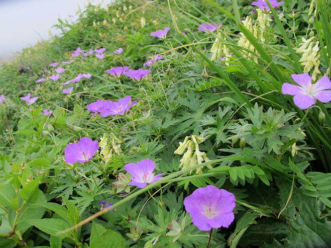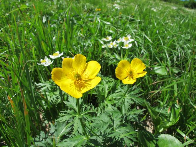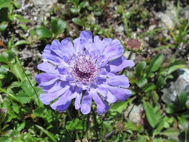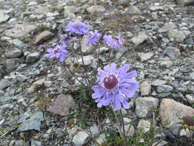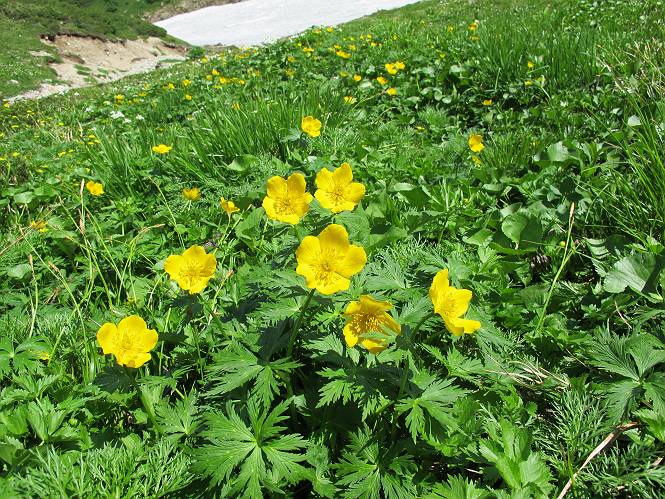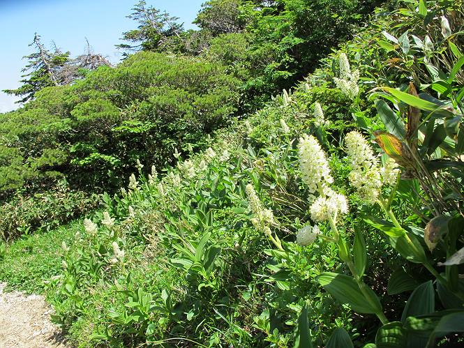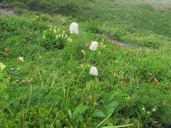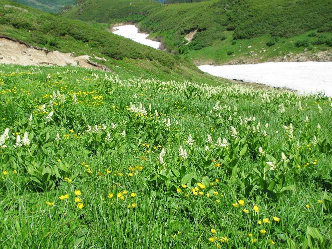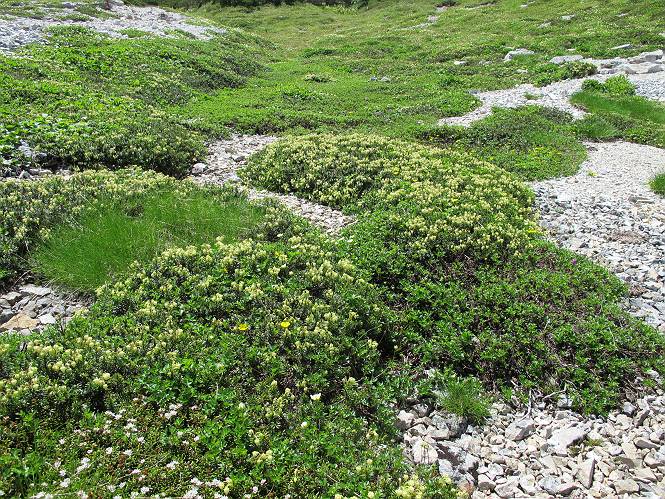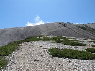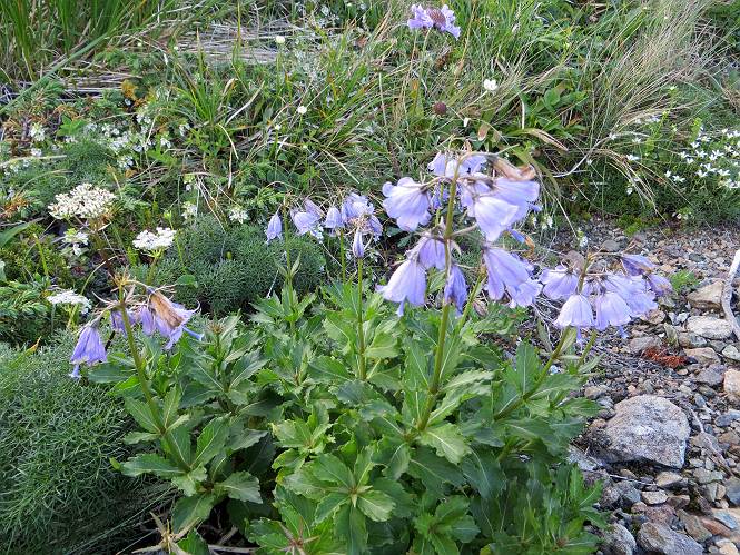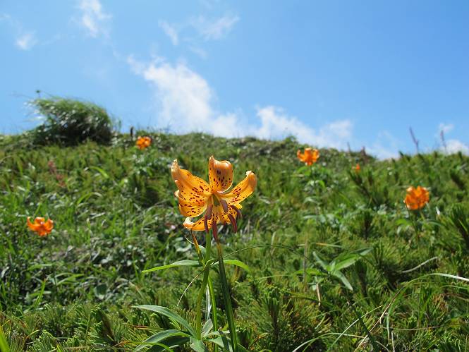 3.白馬岳⇒雪倉避難小屋 4.雪倉避難小屋⇒朝日岳 5.朝日岳⇒蓮華温泉 TOP 2. へ戻る 白馬岳山頂からザックをデポした三国境へ折り返す。向かう雪倉方面のルートを確認しながら下るのであるが、登山道沿いに咲く花も気になる、シコタンソウを往路で見逃していた。15分ほど下ったところで、先ほど会った女性にまた行きあった。山頂往復してくる間にあまり進んでない。ペースが遅いが、足元はしっかりしているし、日暮れまでには大池山荘に着く予定と言っていた、心配することはないだろう。 雪倉方面に続く尾根を眺めながら分岐点、三国境を目指す 稜線下に湖あり、長池 【イブキジャコウソウ、チシマギキョウ】 【シコタンソウ】 【イワツメクサ】 三国境に近づいた、ルートには点々と山頂に向かう人 三国境着、いよいよ雪倉岳のコースに入る 10:45三国境着、20分休憩したが、その人は来なかった。雪倉避難小屋目指して、礫岩の道を下る。濃霧等で道から外れたら迷う込んでしまいそうな道だ、そこは、小間隔で赤ペンキの塗られた石、要所に建てられた道標があるので安心して歩ける。三国境出発時間からして、16:00までに旭小屋に着くのは容易でないと考え、本日は避難小屋泊とする。避難小屋までのルートは、まず、三国境の北西方向にある鉢ケ岳へ通じる尾根を下り、P2504で鉱山道と合流し鞍部まで下る。鞍部から鉢ケ岳を巻き鉢ケ岳-雪倉岳の稜線に出て、雪倉岳方向に進めば雪倉岳の鞍部に避難小屋がある、コースタイムで1時間半ほど。タカネマツムシソウ(別名ミヤママツムシソウ)が点々と咲き出している。花はマツムシソウより大きいし、色鮮やかで豪華な花だ。清水岳を2011年に歩いているが、近いことでもあり植生が似通っているようだ、11:38鉱山道の分岐点に出る。 大粒小粒の礫の道、赤丸と道標が頼りの道 一段下った所から振り返る、白馬岳方面 三国境方面 小蓮華山方面 赤○を拾いながら下降する 【アオノツガザクラ】 【ミネズオウ】 【タカネマツムシソウ】 【チシマギキョウ】 下り斜面が緩やかになった所で白馬山頂を振り返る 画像クリック拡大 ![]() 同、小蓮華山方向を振り返る 画像クリック拡大 鉢ケ岳の右側を巻く 白馬岳山頂方面 旭岳、小旭岳 清水岳 残り花、コマクサの小群落を過ぎると 間もなく鉱山道の分岐点 【タカネマツムシソウ、タカネシオガマ】 【イワオウギ】 【ミヤマムラサキ】 【コバイケイソウ】 巻き道に入り、4ヶ所ほど雪渓を通過し、笹尾根をよじ登れば鉢ケ岳と雪倉山を結ぶ稜線に出る。雪渓付近ではシナノキンバイ、ハクサンイチゲ、ハクサンコザクラ、コバイケイソウ、ミヤマキンポウゲの群落が花盛りだった。ここまで、ウルップソウはことごとく終わっていたが、雪渓脇で3本、残り花を見つけた。稜線を辿りながら、礫の間に根づいた花々を撮る、群落はないが種類が多いこと。 雪渓はベンガラがまいてあった、最初の雪渓 小蓮華山、乗鞍岳方面 【ミヤマキンバイ】 【ミヤマキンポウゲ、コバイケイソウ】 【ミヤマキンポウゲ】 【ハクサンイチゲ】 【シナノキンバイ】 2番目の雪渓を斜め上方向に渡る 【ハクサンコザクラ】 【ウルップソウ】 白馬岳方向を振り返る 最後の雪渓、水を容器満杯にした 稜線を辿り、小ピークを越えると鞍部に避難小屋が見えた 【クルマユリ】 【イワショウブ】 【ウメバチソウ】 【タテヤマウツボグサ】 【ミヤマアケボノソウ】 【タカネナデシコ】 【ヨツバシオガマ】 【カライトソウ】 【タカネツメクサ】 【イワシモツケ】 【シモツケソウ】 【ハクサンフウロ】 【イワオウギ】 【タカネマツムシソウ】 【ハクサンシャジン】 【イブキジャコウソウ】 【クモマミミナグサ】 雪倉避難小屋から小蓮華山方面 同、道なり正面が雪倉岳山頂方向 12:35、雪倉避難小屋着、ザックを小屋に入れたところで、ガスって強風が吹き出す。一時視界が30mほどになった。でも後続の7,8人がその中を朝日小屋方面に向かった。 4.雪倉避難小屋⇒朝日岳 5.朝日岳⇒蓮華温泉 TOP 2. へ戻る |