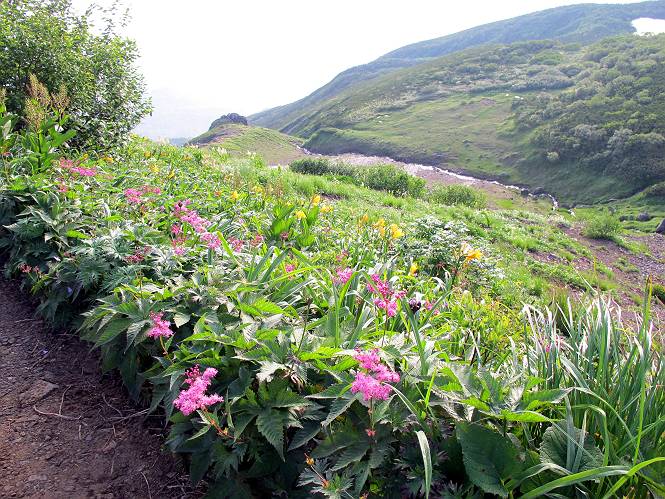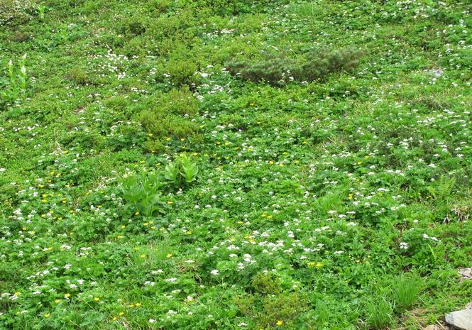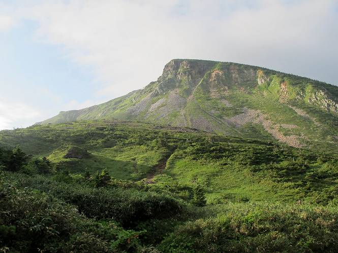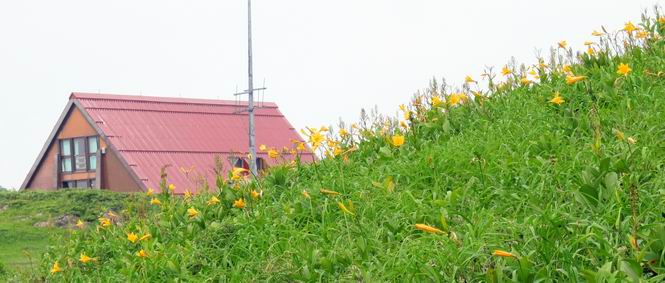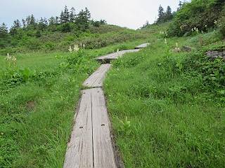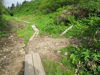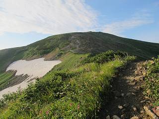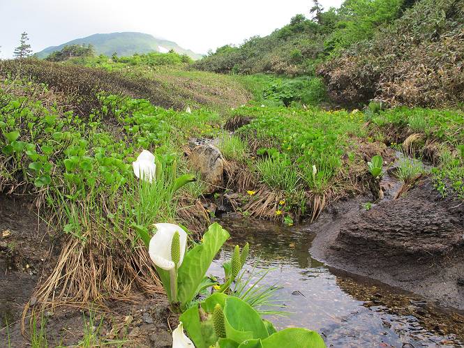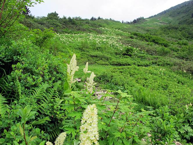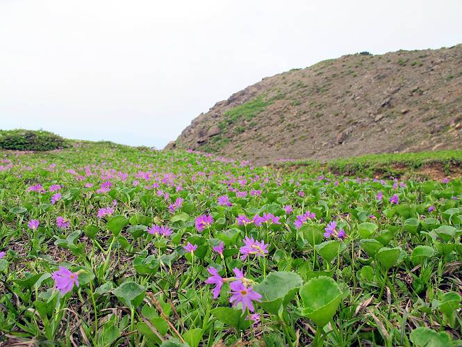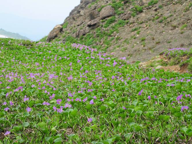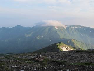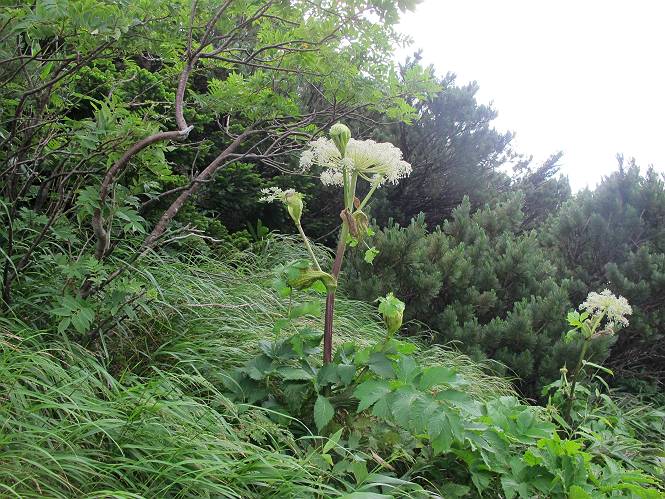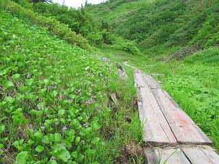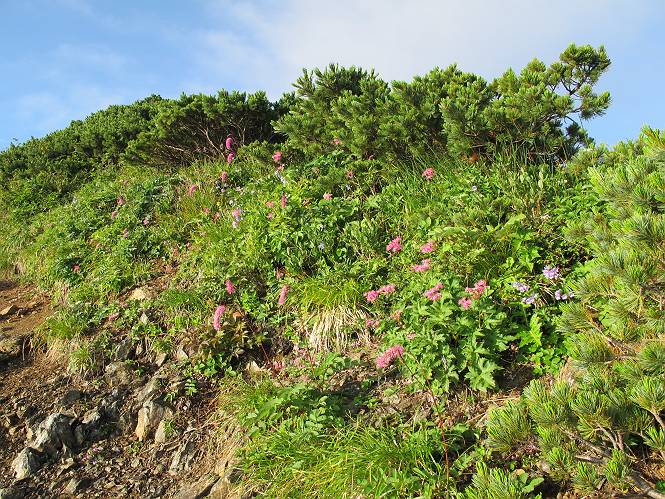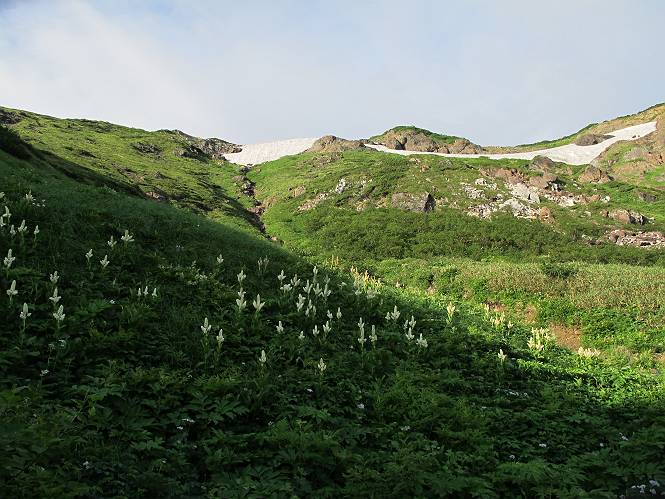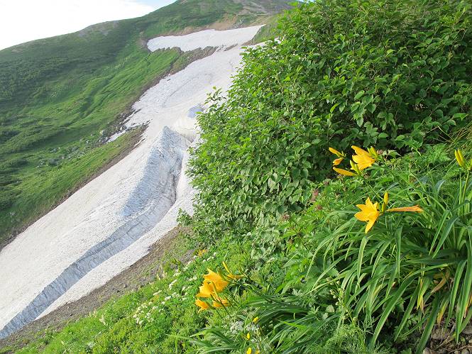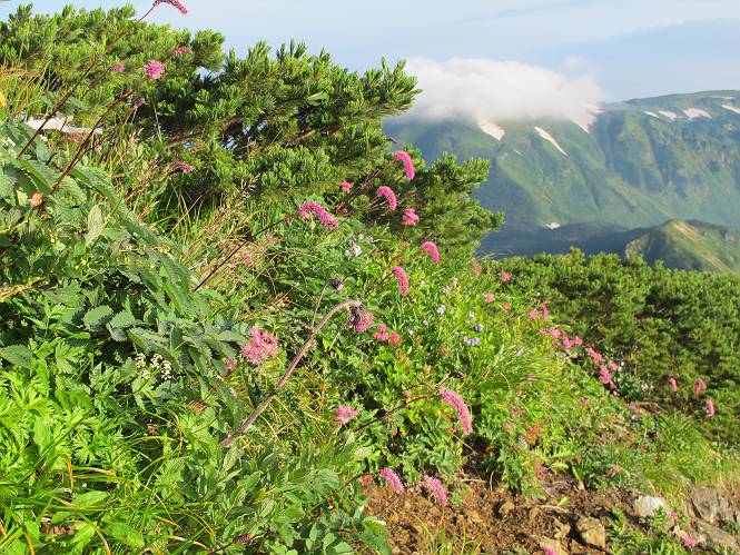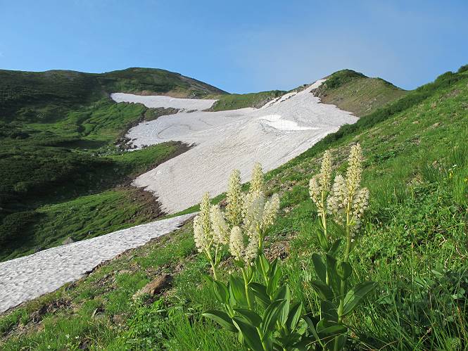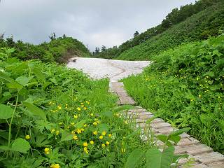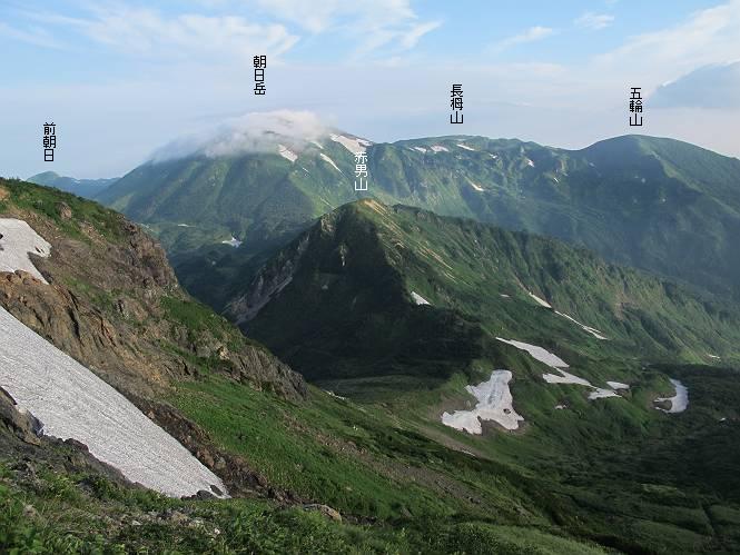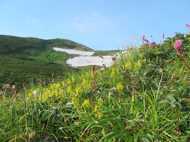 4.雪倉避難小屋⇒朝日岳 5.朝日岳⇒蓮華温泉へ TOP 2.. 3. へ戻る 2日目、夕べは良く眠れなかったなあ。窓越しの夜星を眺めていたが、今日は期待できるぞ、その意気込みは東の暗雲がによって裏切られた、4:57雪倉避難小屋出発。ハイマツの間の小道を進んで行くと薄日がもれてきた。山頂に着く頃には山並も部分的に微笑んでいた。しかし、眺望は昨日とは比較にならない、雨でないだけいいか、5:31雪倉岳着。白馬岳は見えているが、向かう朝日岳には傘雲がかかっている、本日は花見コースだから、・・・・・・。 今日の天気は? 雪倉避難小屋出発 雪倉岳山頂付近から白馬岳 雪倉岳山頂 雪倉岳山頂から傘雲が覆う朝日岳 雪倉岳山頂を振り返りながら赤男山との鞍部まで約600m降下する 道沿いの花々に呼び止められつい、また停まる P2446付近から朝日岳、花に魅せられドッコイショ、ついでに辿るルートを頭の中に 山頂北側のザレた道を下る、道沿いのガレ場にはカライトソウ、タカネマツムシソウ、ハクサンシャジン、ミヤマアズマギクが咲き、雪渓に近い草付にはマルバシモツケ、シモツケソウ、タカネナデシコ、ニッコウキスゲ、タカネアオヤギソウ、ミヤマアキノキリンソウ、シロウマアサツキが咲く、素晴しい北アルプス奥の院という感じだ。大分下って、湿原ぽくなってきた、標高は2400m近いかも、コバイケイソウ、キンコウカ、ミヤマカラマツ、アザミ、ギボウシが群落をつくる、素晴しい光景に興奮気味。深呼吸をして、これから辿るルートを頭の中に叩き込む、道なりに2030m付近まで下り、多分沢を渡って赤男山直下を巻いて水平道に入り、朝日岳西側へ登り、朝日平へ、そして少々上れば朝日岳に出る、大雑把な朝日岳までの道だ、6:44鞍部で小沢を渡る。 鞍部から赤男山 赤男山のツバメ岩 ガレた斜面を横断する 鞍部から緩やかに潅木の中を登り返し、6:54赤男山のツバメ岩の下を巻いて、湿原に出る。シシウド、オタカラコウ、キオン、オトギリソウ、リュウキンカ、ミズバショウ(残り花)が点々とハクサンコザクラ、ハクサンイチゲ、イワイチョウ、チングルマ、コバイケイソウの群落を抜ける。花越しに雪渓の残る山並を見えたが、この天気では残念、7:33水平道分岐。 湿地帯を木道が続く 朝日岳が顔を出す、「お早う」 水平道分岐、右は真っ直ぐ樹林帯を抜け山頂へ 水平道、最初の雪渓 この道は朝日小屋のブログによれば、「7/27開通、アイゼンを持参した方が・・」と書いてあった。そんなわけで軽アイゼンをザックに押し込んできた。ここまでの木道から100m超上っているようだ、キヌガサソウ、ショウジョウバカマ、アカモノ、小さな岩場でツガザクラが、ハクサンコザクラ、コバイケイソウが小群落をつくっていた、ここも素晴しいなあ。雪渓は、ベンガラはまいてあるし(日々変化するので、多少自分なりにとること)全く気にすることなく通過、クサリ場(ここも残雪期の安全上?)を通り、修復した斜面(修復されてなかったら難儀したろう)を抜けて、8:52朝日平合流点、8:58朝日小屋着。 木道沿いの花を観ながら 末期の雪渓を 4ヶ所ほど渡り クサリ場で回りこめば 前朝日、朝日平がドカン! と目の前に 本道の合流点 ニッコウキスゲも見頃でした、色が飛んでしまいましたが 朝日小屋到着、ここの宿泊が予定にあったが 今朝ここまでに会った人は、水平道で一人だけ、小屋周辺も静まり返っている、見えるのは出入する従業員だけ。備え付けの蛇口から美味しい水を頂いて、9:10朝日岳に向かう。朝日平というけれど小さな起伏があり、雪解けも一様ではない。大きな群落をつくっているチングルマにしても一部はヒゲ?状態もあり、蕾みもある、一面に白くなっているところを見ると、今が見頃でしょう。散策をしたいところだが、遊歩道がまだクローズだった、9:17先ほど通った合流点通過。 朝日岳へGO!! 先ほど通った合流点 前朝日、朝日平を振り返る 朝日岳への登り返し、前朝日、朝日小屋 小さな橋、小さなハシゴを伝って、大きな朝日岳の湿原に出る、ハクサンコザクラ、ハクサンイチゲが今は盛り、ムシトリスミレ、アオノツガザクラ、コバイケイソウ、シナノキンバイ、大きな下向いたアザミ、ミヤマタンポポなどなど、その種は数えても数え切れない、10:09朝日岳山頂着。 ちょっと上ると 高層湿原が開ける ハクサンイチゲや ハクサンゴザクラの群生地をながめ 朝日小屋から小一時間で山頂に出る 朝日岳山頂 360°のパノラマを期待したがわずかに白馬岳方面が見えただけだった。 思えば長かった、ひと様に聞いた話から、願望に変り、幾度かの計画も絵に描いた餅に終わり、そして2002年秋の頓挫と数十年の年月がながれた。しかし、歩いてみたい気持ちは変らず、ついにこの頂に立った。取巻く山並は、ソッポを向いているが、機会があったら、またこの道を歩きたい。 雪倉避難小屋⇒朝日岳で出逢った花 【タカネバラ】 【チングルマ】 【ツガザクラ】 【アオノツガザクラ】 【アカモ