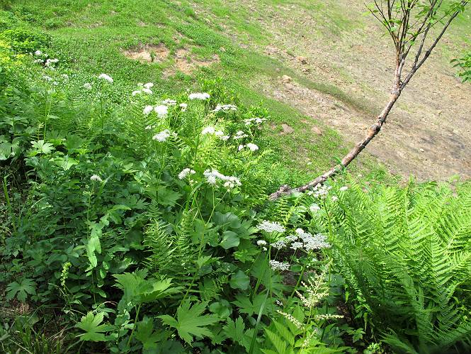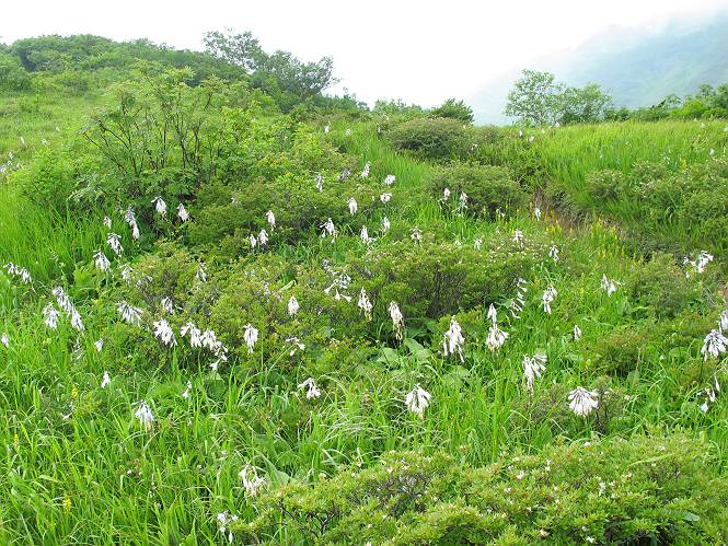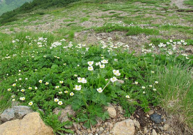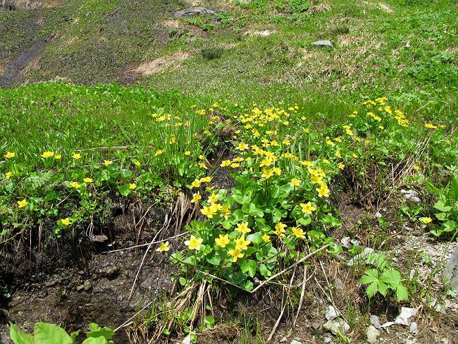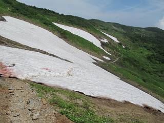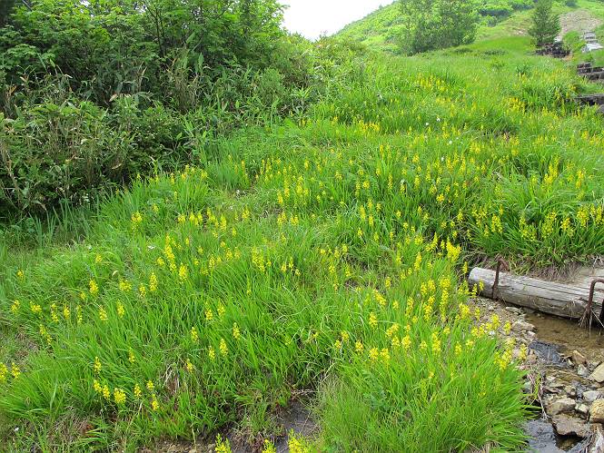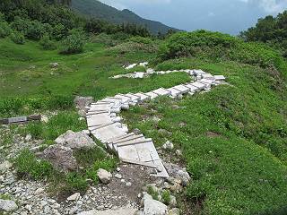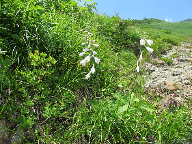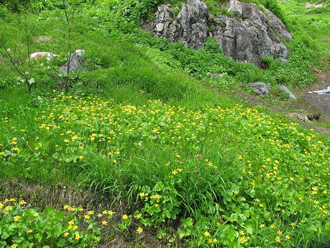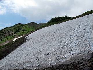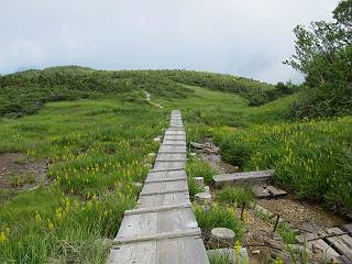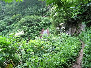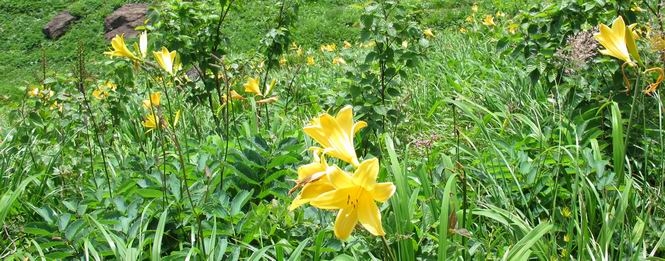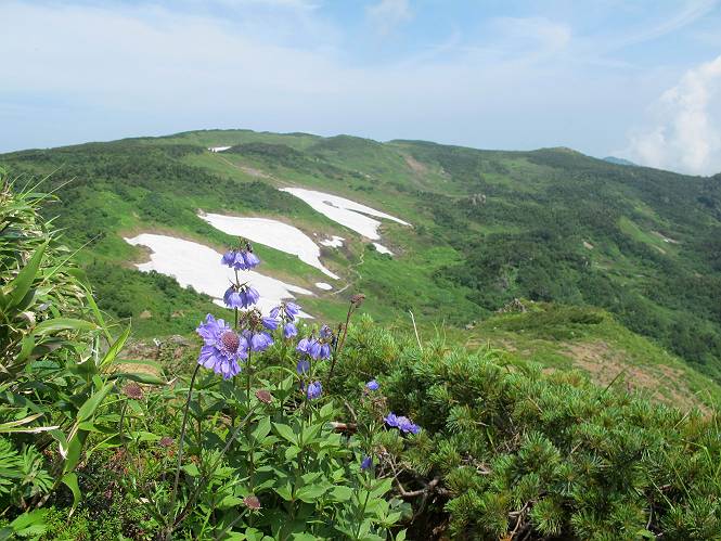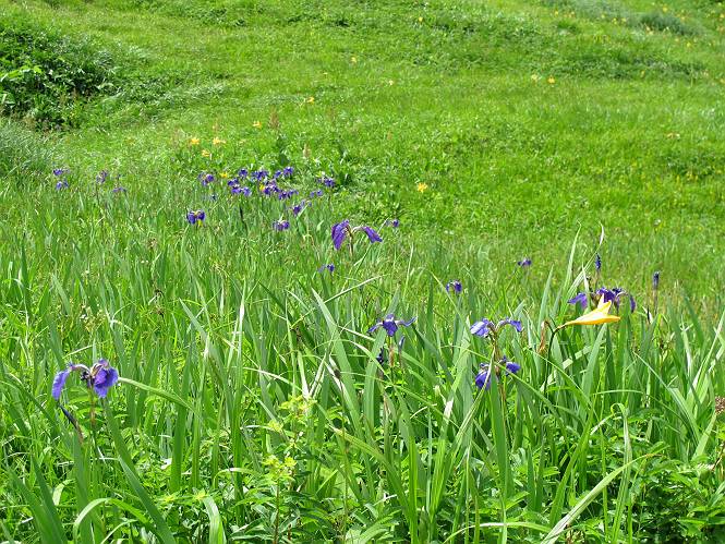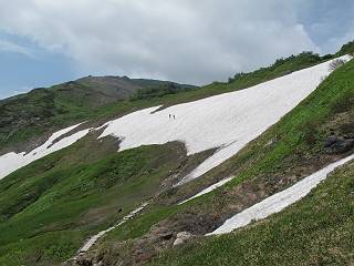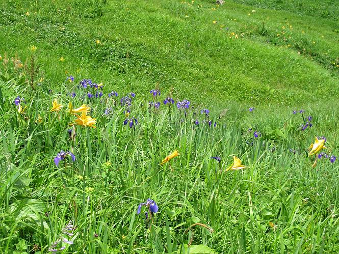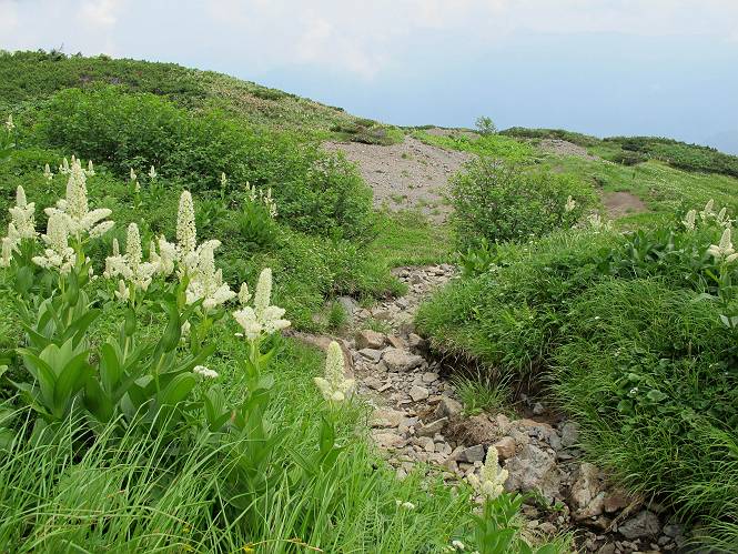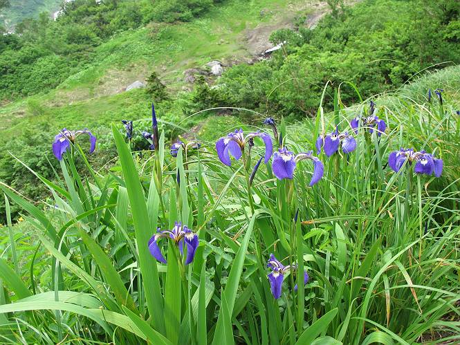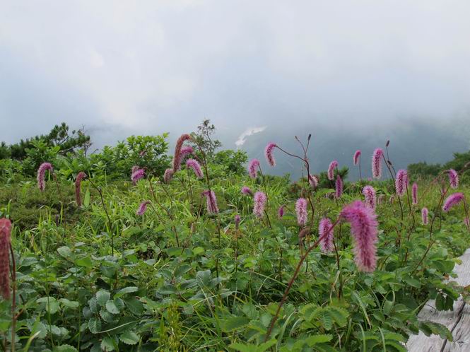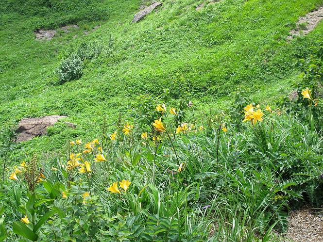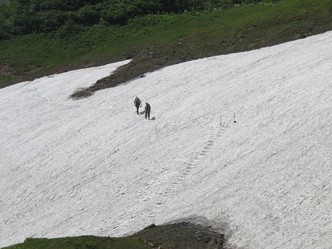 5.朝日岳⇒蓮華温泉 TOP 2 3 4 戻り 眺望の無い山頂を後に、北方向に下る。正面の長栂山、五輪山は日も当りくっきり、登山道沿いの花々を観賞しつつ高度を下げていく。大きな雪渓が残り斜度も小さく水分が豊富なのだろうか、チングルマ、ハクサンイチゲ、コバイケイソウ、ニッコウキスゲ、シモツケソウ、カライトソウ、アザミが目立つ。もう少し下ると大小礫のゴロゴロした尾根筋になり、タカネシオガマ、ミヤママツムシソウ、クモマミミナグサ、ホソバツメクサ、ハクサンシャジンが花をつけていた、10:43吹上コル。 朝日岳山頂を後に蓮華温泉へ下る ハイマツに沿って道沿いに咲くカライトソウ、シモツケソウ、アザミ 正面に長栂山、五輪山を見ながら下る 長栂山との鞍部で分岐 長栂山、五輪山 画像クリック拡大 長栂山の東南を巻きながら徐々に下って行く 吹上コル、蓮華温泉は右に入る このコースでは比較的大きな雪渓に出る 斜めに下って最後はステップ切った階段状 奥が朝日岳山頂 丁度2名で作業を終えたところだった お帰り、お疲れ様でした スコップはしばらく置きっぱなし、とか 蓮華温泉方面に入り間もなく大きな雪渓を渡り、五輪山を大きく巻くようにして湿原を進む。ニッコウキスゲ、ハクサンコザクラ、リュウキンカ、シナノキンバイ、タテヤマリンドウ、ヒオウギアヤメ、チングルマが素晴しかった。特にリュウキンカが多く、広く分布しており見応えがある。若干見えてきた雪倉岳を眺めながら、木段の途中で休憩していると、上ってきたご夫婦が「この先にいい水がありますよ」と言われ、早速移動、またまた休んでしまった、11:40。 この雪渓の下から湿原に入り花を観ながら木段を上下しながら進む リュウキンカ、ハクサンコザクラが幅広く群生 中間の休憩所、雪倉岳方面が・・・ こちらは朝日岳 休憩所からちょっと先、美味しい水 あと蓮華温泉まで8.1km 12:01あと蓮華温泉まで8.1km標柱、12:41花園三角点通過、延々と続く高層湿原の花を頭に収め、潅木の道に入り一気に下り、13:35白高地沢に飛び出る。鉄橋を渡り、ヒョウタン池を右手に見て上り坂、下って14:19瀬戸川鉄橋を渡る。『この辺から緩やかに下り蓮華温泉に出る』とみたが、“兵馬平”という観光スポットがあることに気づく、しかしここからの上り、足がついて来ない。5分歩いて5分休みを繰り返し、思い切って木の根に腰を降ろして休憩、ちょっと眠ったようだ。 モクドウ沿いにはヒオウギアヤメも沢山あった ニッコウキスゲも点々と、朝日岳を背景に ちょっと山に近づいて五輪の森の標柱 まだまだ続く湿原 ギボウシ、キンコウカが花盛りだった 平坦な木道の真ん中に洒落た名前の三角点“花園三角点” ここから先、潅木帯に入り パイプ段を下り 斜面を大きくトラバースして 急段を下れば白高地沢に出る、下りきったと思いきや、アップダウンがまだまだ続く 鉄橋を渡り、 ヒョウタン池を右手に見て上り坂 大きな桧?を過ぎると下って 瀬戸川鉄橋を渡る、これからまだまだ上って 兵馬平湿原にて、ギボウシ&シモツケソウ 同、シモツケソウが満開 兵馬平へ、緩やかにしばらく進めば 蓮華温泉の駐車場へ あとは兎に角ペースを上げないようにして、15:01兵馬平の湿原、16:01蓮華温泉に戻った。恥ずかしながら、最後はヘトヘトのゴールでした。1日目は8時間23分、2日目は11時間04分、合計19時間27分のタイムでした。机上では日帰りで検討してみたが、“目的”が何なのかを考えると、時間の多少は問題ではない。充分楽しむこと、時間はついてくるもの、結果なのだ。3日かければ、行程にかなりのゆとりができるでしょう、このコースはそれだけ価値があると思います。これからという方にはオススメコースです。 朝日岳⇒蓮華温泉で出逢った花 【チングルマ】 【コバイケイソウ】 【カライトソウ】 【タカネシオガマ】 【クモマミミナグサ】 【ホソバツメクサ】 【ハクサンシャジン】 【シロウマアサツキ】 【ギョウジャニンニク】 【ニッコウキスゲ】 【ハクサンコザクラ】 【リュウキンカ】 【ショウジョウバカマ】 【シナノキンバイ】 【タテヤマリンドウ】 【ヒオウギアヤメ】 【サンカヨウ】 【キヌガサソウ】 【ミズバショウ】 【ハナニガナ】 【ミヤマカラマツ】 【モミジカラマツ】 【キンコウカ】 【ワタスゲ】 【ギボウシ】 【ミヤマダイモンジソウ】 【コメツツジ】 【ワレモコウ】 【タテヤマウツボグサ】 【エゾアジサイ】 掴み所の無い長い山行録になって、ご覧頂いている方もお疲れになったでしょう、有難う御座いました。 終わります。 TOP 2 3 4 戻り |