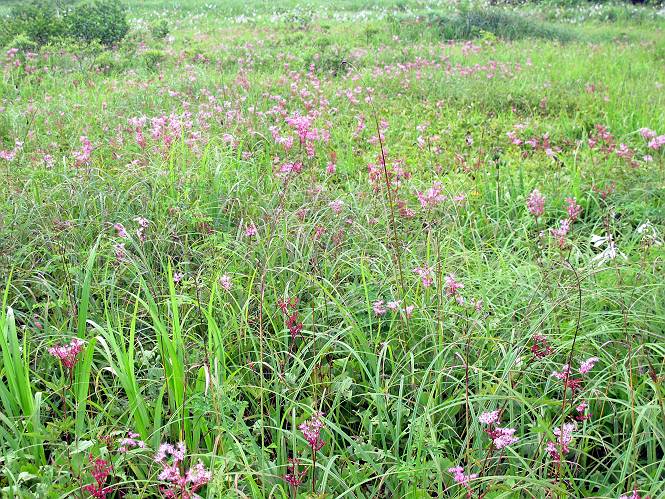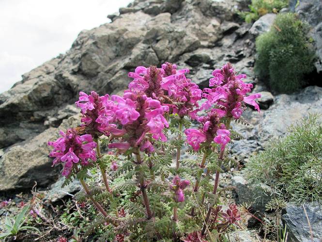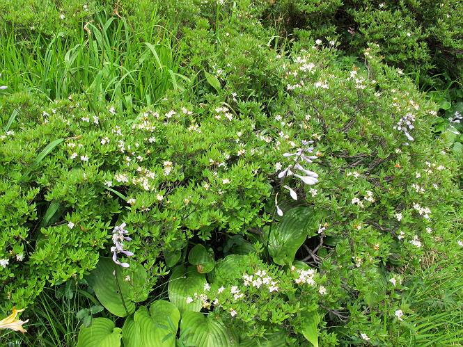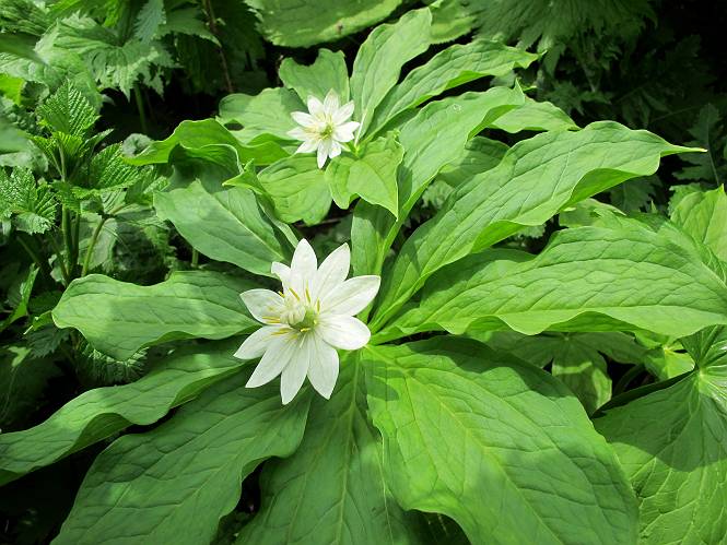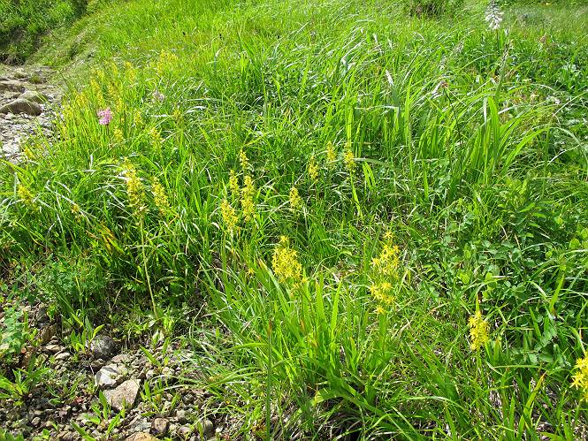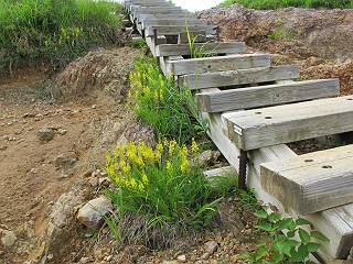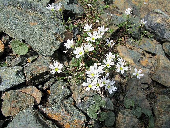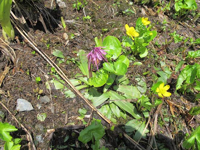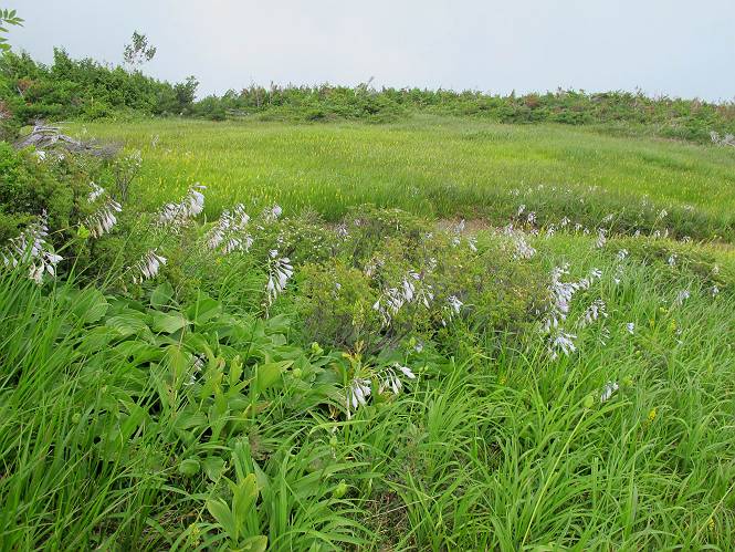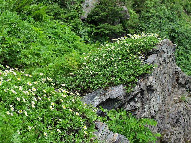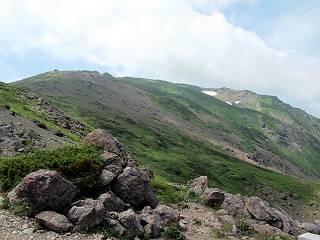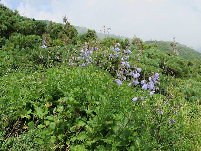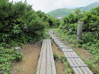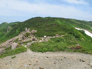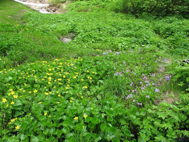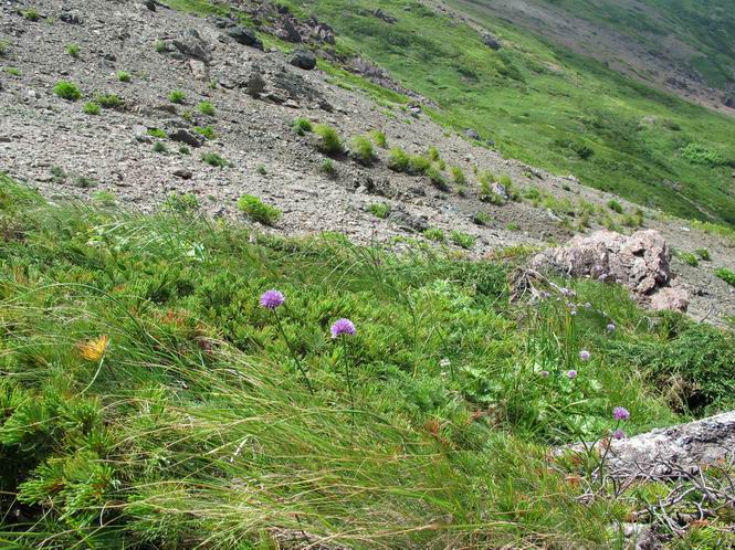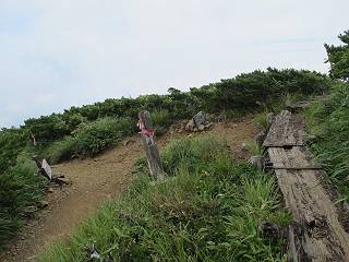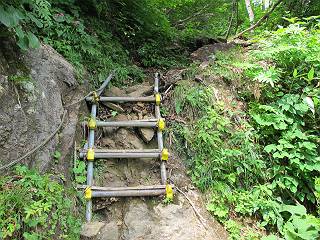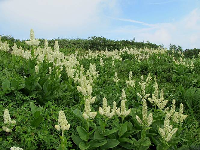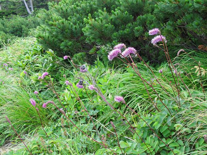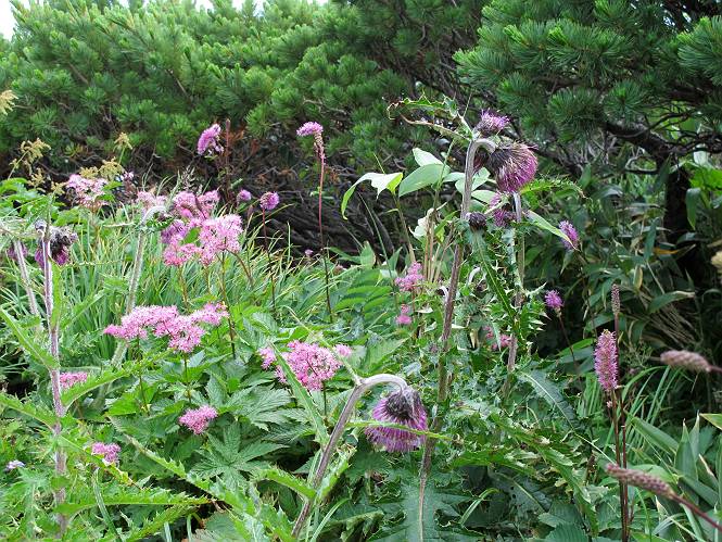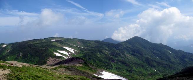 5.朝日岳⇒蓮華温泉 TOP 2 3 4 戻り 眺望の無い山頂を後に、北方向に下る。正面の長栂山、五輪山は日も当りくっきり、登山道沿いの花々を観賞しつつ高度を下げていく。大きな雪渓が残り斜度も小さく水分が豊富なのだろうか、チングルマ、ハクサンイチゲ、コバイケイソウ、ニッコウキスゲ、シモツケソウ、カライトソウ、アザミが目立つ。もう少し下ると大小礫のゴロゴロした尾根筋になり、タカネシオガマ、ミヤママツムシソウ、クモマミミナグサ、ホソバツメクサ、ハクサンシャジンが花をつけていた、10:43吹上コル。 朝日岳山頂を後に蓮華温泉へ下る ハイマツに沿って道沿いに咲くカライトソウ、シモツケソウ、アザミ 正面に長栂山、五輪山を見ながら下る 長栂山との鞍部で分岐 長栂山、五輪山 画像クリック拡大 長栂山の東南を巻きながら徐々に下って行く 吹上コル、蓮華温泉は右に入る このコースでは比較的大きな雪渓に出る 斜めに下って最後はステップ切った階段状 奥が朝日岳山頂 丁度2名で作業を終えたところだった お帰り、お疲れ様でした スコップはしばらく置きっぱなし、とか 蓮華温泉方面に入り間もなく大きな雪渓を渡り、五輪山を大きく巻くようにして湿原を進む。ニッコウキスゲ、ハクサンコザクラ、リュウキンカ、シナノキンバイ、タテヤマリンドウ、ヒオウギアヤメ、チングルマが素晴しかった。特にリュウキンカが多く、広く分布しており見応えがある。若干見えてきた雪倉岳を眺めながら、木段の途中で休憩していると、上ってきたご夫婦が「この先にいい水がありますよ」と言われ、早速移動、またまた休んでしまった、11:40。 この雪渓の下から湿原に入り花を観ながら木段を上下しながら進む リュウキンカ、ハクサンコザクラが幅広く群生 中間の休憩所、雪倉岳方面が・・・ こちらは朝日岳 休憩所からちょっと先、美味しい水 あと蓮華温泉まで8.1km 12:01あと蓮華温泉まで8.1km標柱、12:41花園三角点通過、延々と続く高層湿原の花を頭に収め、潅木の道に入り一気に下り、13:35白高地沢に飛び出る。鉄橋を渡り、ヒョウタン池を右手に見て上り坂、下って14:19瀬戸川鉄橋を渡る。『この辺から緩やかに下り蓮華温泉に出る』とみたが、“兵馬平”という観光スポットがあることに気づく、しかしここからの上り、足がついて来ない。5分歩いて5分休みを繰り返し、思い切って木の根に腰を降ろして休憩、ちょっと眠ったようだ。 モクドウ沿いにはヒオウギアヤメも沢山あった ニッコウキスゲも点々と、朝日岳を背景に ちょっと山に近づいて五輪の森の標柱 まだまだ続く湿原 ギボウシ、キンコウカが花盛りだった 平坦な木道の真ん中に洒落た名前の三角点“花園三角点” ここから先、潅木帯に入り パイプ段を下り 斜面を大きくトラバースして 急段を下れば白高地沢に出る、下りきったと思いきや、アップダウンがまだまだ続く 鉄橋を渡り、 ヒョウタン池を右手に見て上り坂 大きな桧?を過ぎると下って 瀬戸川鉄橋を渡る、これからまだまだ上って 兵馬平湿原にて、ギボウシ&シモツケソウ 同、シモツケソウが満開 兵馬平へ、緩やかにしばらく進めば 蓮華温泉の駐車場へ あとは兎に角ペースを上げないようにして、15:01兵馬平の湿原、16:01蓮華温泉に戻った。恥ずかしながら、最後はヘトヘトのゴールでした。1日目は8時間23分、2日目は11時間04分、合計19時間27分のタイムでした。机上では日帰りで検討してみたが、“目的”が何なのかを考えると、時間の多少は問題ではない。充分楽しむこと、時間はついてくるもの、結果なのだ。3日かければ、行程にかなりのゆとりができるでしょう、このコースはそれだけ価値があると思います。これからという方にはオススメコースです。 朝日岳⇒蓮華温泉で出逢った花 【チングルマ】 【コバイケイソウ】 【カライトソウ】 【タカネシオガマ】 【クモマミミナグサ】 【ホソバツメクサ】 【ハクサンシャジン】 【シロウマアサツキ】 【ギョウジャニンニク】 【ニッコウキスゲ】 【ハクサンコザクラ】 【リュウキンカ】 【ショウジョウバカマ】 【シナノキンバイ】 【タテヤマリンドウ】 【ヒオウギアヤメ】 【サンカヨウ】 【キヌガサソウ】 【ミズバショウ】 【ハナニガナ】 【ミヤマカラマツ】 【モミジカラマツ】 【キンコウカ】 【ワタスゲ】 【ギボウシ】 【ミヤマダイモンジソウ】 【コメツツジ】 【ワレモコウ】 【タテヤマウツボグサ】 【エゾアジサイ】 掴み所の無い長い山行録になって、ご覧頂いている方もお疲れになったでしょう、有難う御座いました。 終わります。 TOP 2 3 4 戻り |