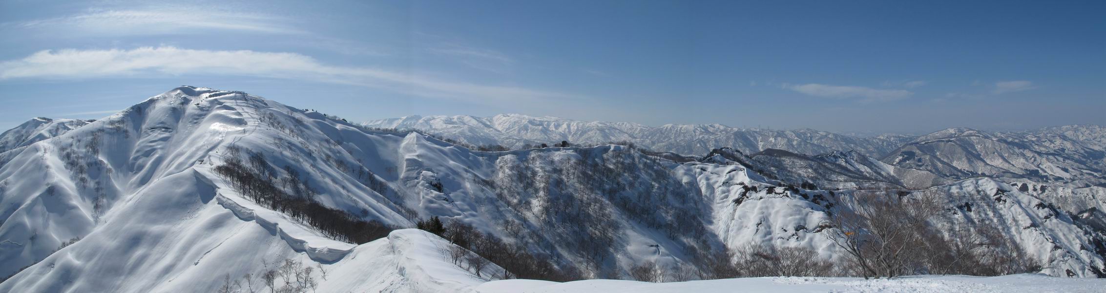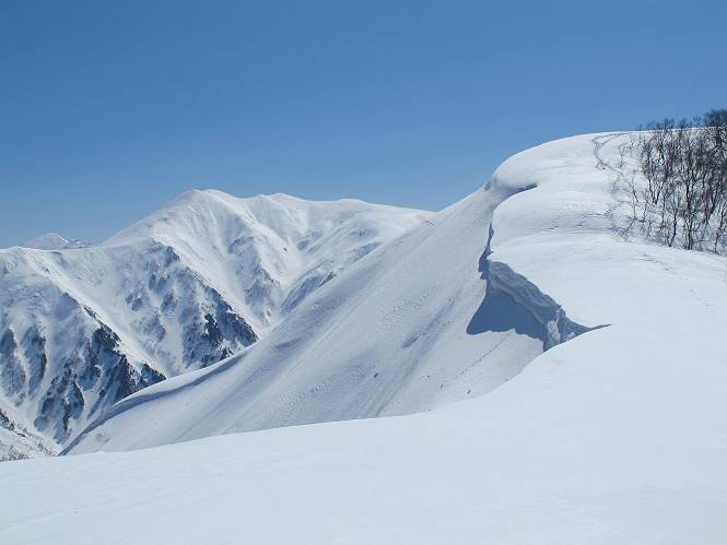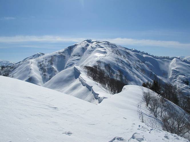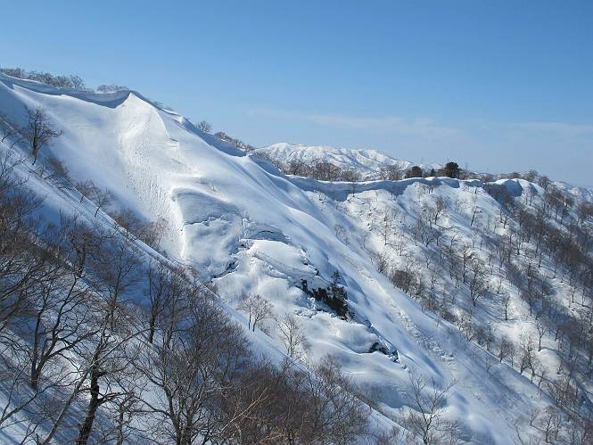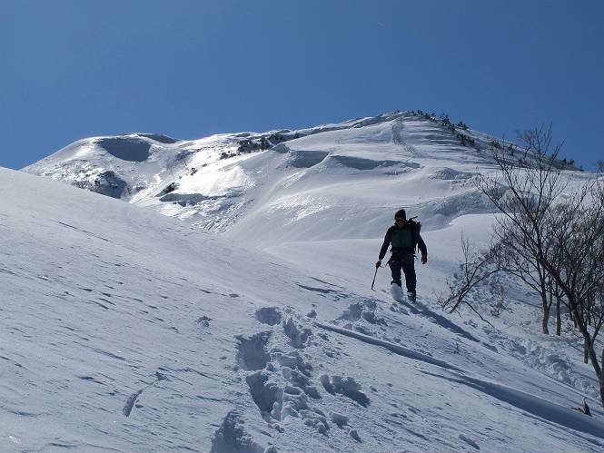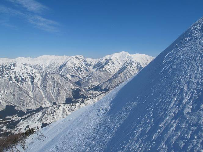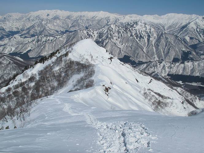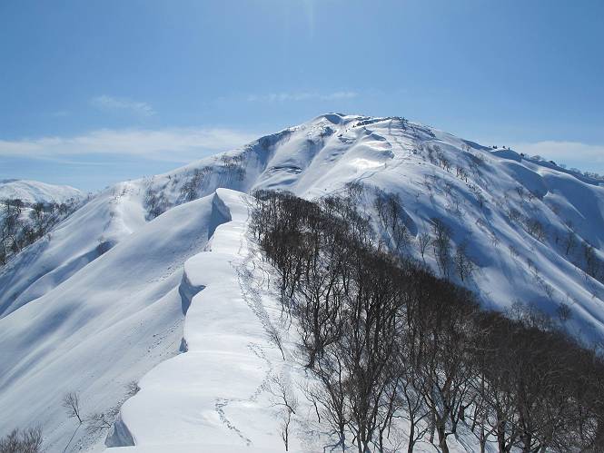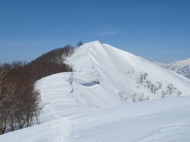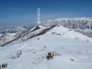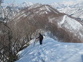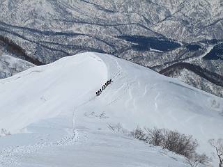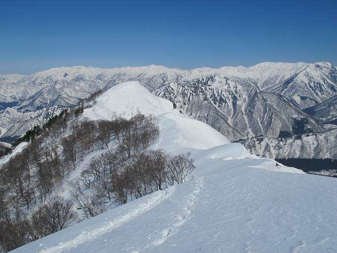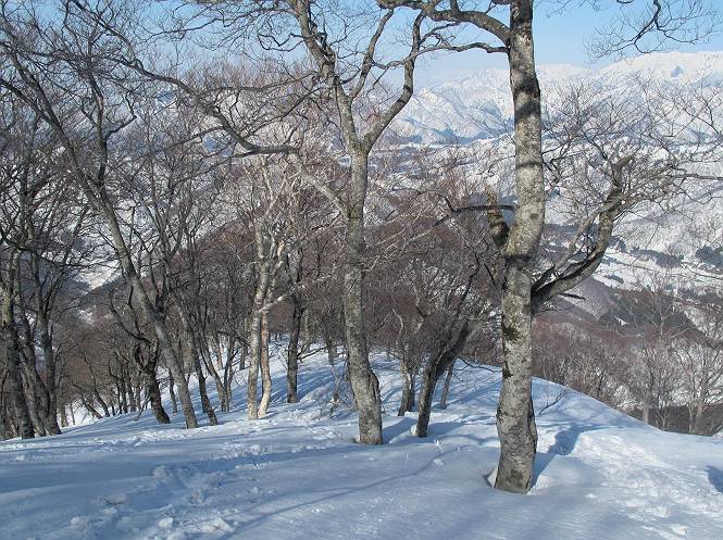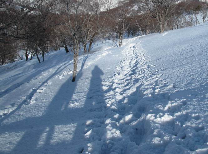 【往路、毛渡橋駐車点⇒棒立山⇒タカマタギ⇒日白山】 【帰り道、日白山⇒タカマタギ⇒棒立山⇒毛渡橋駐車点】 同じ道を辿る山行録は、つめて書けば3行で終わってしまう。しかし、tomoさんとコラボの山行は簡単に終わらない。時間の経過は、光の変化に風景、花(が咲いていれば)も表情を変える。道草のように思うかもしれないが、tomoさんは芸術性の追求かな、私にはまねごとみたいなもので、光景をレンズが追う。そして、折角撮った画像をパソコンの中で眠らせてしまうことはないだろう。手間暇かけて並べ、見て頂くということになる。これもネットを介して、あなた様とのコミュニケーションとなる。結果として、機会を探して歩くも良し、昔の道を思い浮かべるも良し、雰囲気だけでも共有して頂けたらHPを作る甲斐があるってこと、かな。つまらないことを挟みました、すみません。日白山の山頂を後に、雪景色を見ながら下る、タカマタギ13:06-13:21、陽が若干傾き、往路でモヤっぽかった景色はクッキリ、山座同定にも花が咲く。 タカマタギを目指して下る 二居方面に進む一行 ぽっかり開いた南斜面 トレースは下を巻いてますからご心配なく 日白山を振り返る 画像クリック拡大 棒立山も見えてきた、タカマタギの後は守門岳、棒立山の後は八海山 再び日白山を振り返る 画像クリック拡大 谷川連峰の最高峰、仙ノ倉山は静かに 崩壊始めた雪庇、後は巻機山 東谷山の向こうに苗場山、展望位置と思うが斜面が良く見える タカマタギに近づく タカマタギに近づく タカマタギ付近まで戻って万太郎山〜苗場山 画像クリック拡大 棒立山を目指して下降、タカマタギから北方向に派生する尾根の雪庇、末期だと思うが見事だ、延々と麓の方へ続いている。雪崩の跡も、今朝は気づかなかったが。タカマタギから離れるに従って、タカマタギの東斜面が光る、きれいなもんだ、はまってしまう、シルエットっぽいのだが味がある、どこやらのCMに近い、やめられない、とまらない、棒立山14:01着。 タカマタギ山頂、後ろは茂倉岳周辺 タカマタギからでっかいレンズで狙うtomoさん、佐武流山の山頂の人影かな? タカマタギから棒立山、背景は巻機山付近 棒立山斜面のクラック、こんなにあったかな? 棒立山を目指して・・・ 巻機山〜万太郎山、手前は棒立山 画像クリック拡大 タカマタギから北方向に派生する尾根の雪庇 タカマタギから北方向に派生する尾根の雪庇 延々と麓の方へ続いている 画像クリック拡大 雪崩の跡も 雪崩の跡、往路は気づかなかったが 【光るタカマタギを振り返りながら】 万太郎山〜タカマタギ 画像クリック拡大 タカマタギ〜柏崎方面 画像クリック拡大 棒立山をしばらく下ると、前橋から来たKさん一行に会い驚き、KさんはHP“山が一番”を運営する一方、最近県境歩きの著書も出しているとか。鉄塔15:20、林道15:28、終着駐車点15:55。 長い影、棒立山の北斜面 北斜面を急降下、往路難儀した跡が残っていた、背景は武能岳、茂倉岳 背に陽を受けて弾丸の如く下る、下る 往路の霧氷はうそのよう、静まり返っていた 前橋の一行と出会う お先に失礼 おっとっと、深い、深い 鉄塔が見えたぞ 下界も近い tomoさんが、「マンサクが・・・」、咲き初めですね 林道に出て杉林を抜ければ 道路に出て、毛渡橋の向こうに車 総所要時間は9時間54分の久々の長丁場であった。が、気分晴れ晴れ、帰路につく、tomoさん楽しい一日を有難う。例年ですと、4月上旬まで楽しめるとか。 【往路、毛渡橋駐車点⇒棒立山⇒タカマタギ⇒日白山】 参考: tomoさんの山行録 |