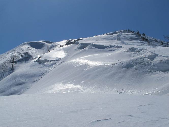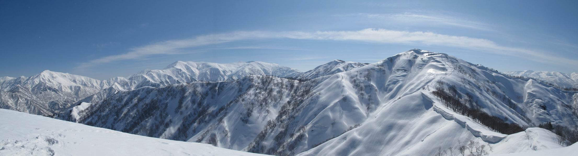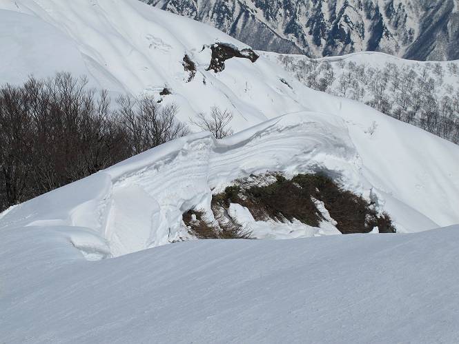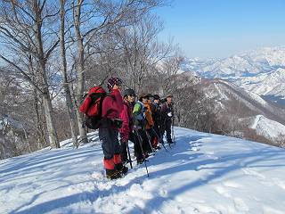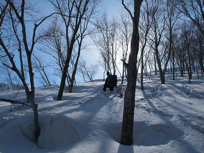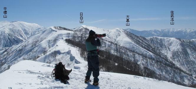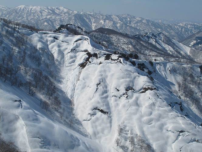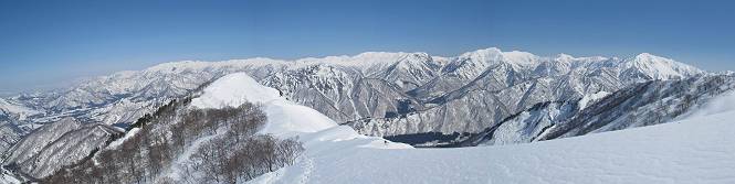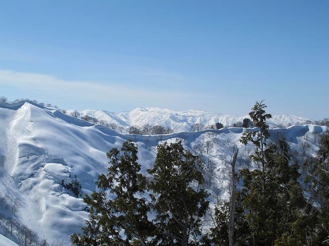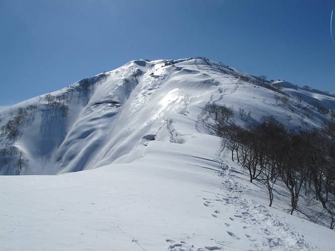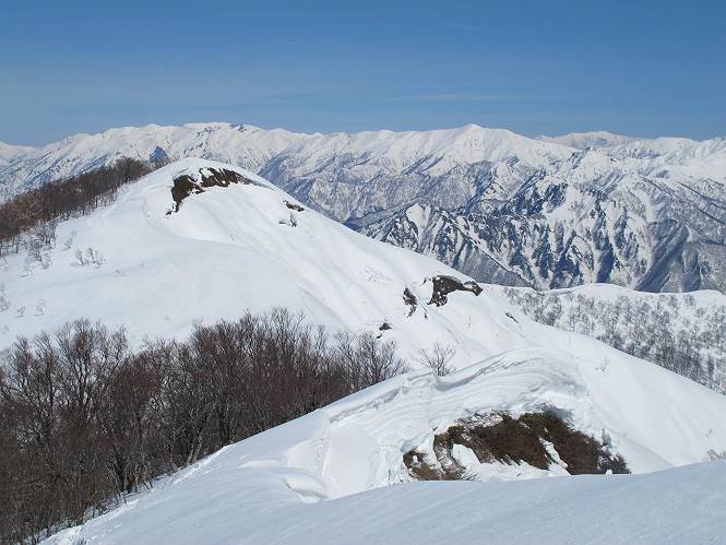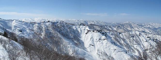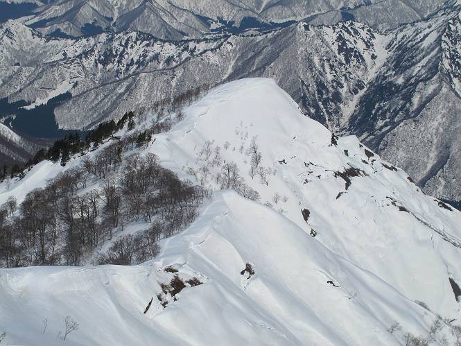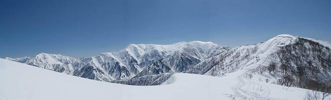 【往路、毛渡橋駐車点⇒棒立山⇒タカマタギ⇒日白山】 【帰り道、日白山⇒タカマタギ⇒棒立山⇒毛渡橋駐車点】 同じ道を辿る山行録は、つめて書けば3行で終わってしまう。しかし、tomoさんとコラボの山行は簡単に終わらない。時間の経過は、光の変化に風景、花(が咲いていれば)も表情を変える。道草のように思うかもしれないが、tomoさんは芸術性の追求かな、私にはまねごとみたいなもので、光景をレンズが追う。そして、折角撮った画像をパソコンの中で眠らせてしまうことはないだろう。手間暇かけて並べ、見て頂くということになる。これもネットを介して、あなた様とのコミュニケーションとなる。結果として、機会を探して歩くも良し、昔の道を思い浮かべるも良し、雰囲気だけでも共有して頂けたらHPを作る甲斐があるってこと、かな。つまらないことを挟みました、すみません。日白山の山頂を後に、雪景色を見ながら下る、タカマタギ13:06-13:21、陽が若干傾き、往路でモヤっぽかった景色はクッキリ、山座同定にも花が咲く。 タカマタギを目指して下る 二居方面に進む一行 ぽっかり開いた南斜面 トレースは下を巻いてますからご心配なく 日白山を振り返る 画像クリック拡大 棒立山も見えてきた、タカマタギの後は守門岳、棒立山の後は八海山 再び日白山を振り返る 画像クリック拡大 谷川連峰の最高峰、仙ノ倉山は静かに 崩壊始めた雪庇、後は巻機山 東谷山の向こうに苗場山、展望位置と思うが斜面が良く見える タカマタギに近づく タカマタギに近づく タカマタギ付近まで戻って万太郎山〜苗場山 画像クリック拡大 棒立山を目指して下降、タカマタギから北方向に派生する尾根の雪庇、末期だと思うが見事だ、延々と麓の方へ続いている。雪崩の跡も、今朝は気づかなかったが。タカマタギから離れるに従って、タカマタギの東斜面が光る、きれいなもんだ、はまってしまう、シルエットっぽいのだが味がある、どこやらのCMに近い、やめられない、とまらない、棒立山14:01着。 タカマタギ山頂、後ろは茂倉岳周辺 タカマタギからでっかいレンズで狙うtomoさん、佐武流山の山頂の人影かな? タカマタギから棒立山、背景は巻機山付近 棒立山斜面のクラック、こんなにあったかな? 棒立山を目指して・・・ 巻機山〜万太郎山、手前は棒立山 画像クリック拡大 タカマタギから北方向に派生する尾根の雪庇 タカマタギから北方向に派生する尾根の雪庇 延々と麓の方へ続いている 画像クリック拡大 雪崩の跡も 雪崩の跡、往路は気づかなかったが 【光るタカマタギを振り返りながら】 万太郎山〜タカマタギ 画像クリック拡大 タカマタギ〜柏崎方面 画像クリック拡大 棒立山をしばらく下ると、前橋から来たKさん一行に会い驚き、KさんはHP“山が一番”を運営する一方、最近県境歩きの著書も出しているとか。鉄塔15:20、林道15:28、終着駐車点15:55。 長い影、棒立山の北斜面 北斜面を急降下、往路難儀した跡が残っていた、背景は武能岳、茂倉岳 背に陽を受けて弾丸の如く下る、下る 往路の霧氷はうそのよう、静まり返っていた 前橋の一行と出会う お先に失礼 おっとっと、深い、深い 鉄塔が見えたぞ 下界も近い tomoさんが、「マンサクが・・・」、咲き初めですね 林道に出て杉林を抜ければ 道路に出て、毛渡橋の向こうに車 総所要時間は9時間54分の久々の長丁場であった。が、気分晴れ晴れ、帰路につく、tomoさん楽しい一日を有難う。例年ですと、4月上旬まで楽しめるとか。 【往路、毛渡橋駐車点⇒棒立山⇒タカマタギ⇒日白山】 参考: tomoさんの山行録 |