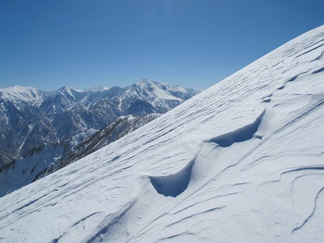 | 山行日 2013年3月17日 晴れ 2名 コース コース概略図はこちら 毛渡橋南詰(新潟県湯沢町土樽)→尾根取り付き→鉄塔→棒立山→タカマタギ→日白(ニッパク)山→タカマタギ →棒立山→尾根取り付き→毛渡橋南詰 【棒立山】へ 【タカマタギ】へ 【日白山】へ 【帰り道、日白山⇒タカマタギ⇒棒立山⇒毛渡橋駐車点】 朝7時頃だったかな、相互リンクしている奥利根山歩きのtomoさんから電話「明日、タカマタギへ行きましょう」、「お願いします」で念願の山行が決まった。関越トンネルを抜けると雪国だった、小説の引用みたいだが、谷川連峰の気象に与える影響は大きい、今さらながら感心する。湯沢ICで降りて県道へ、268,540,361,541号線と曲って、曲って、土樽方面に走る、道路は除雪してあり、案ずることはなかった。毛渡橋を渡って路肩の空きスペースに駐車して準備にかかると塩化カルシュウムの散布車が通っていった、6:01出発。見ると雪から流れ出した水が凍っているではないか、恐る恐る毛渡橋を渡り、薄い雲のかかった目指す棒立山を撮って、北詰から雪道(林道)に入った。関越道、上越線をくぐり、杉林の間を進み、尾根取り付きへ進む、6:25着。 毛渡橋 橋の上から棒立山を望む 関越道をくぐり、上越線をくぐる 杉森の間を進み、 【棒立山】へ ページTOPへ 【タカマタギ】へ 【日白山】へ タカマタギ山を目指す人たち、アイゼン装着、その人の好みで、ワカン、スノーシューもいれば、スパイク長靴もいる、どれも完璧なものはない。山間に入るや急登続き、鉄塔6:42通か、杉森を抜け、雑木林からブナ林に変化していく。目指す第一目標棒立山を左手に眺めながら、汗をかく、1040m地点で尾根に出る、7:56。 取り付き場所でアイゼン装着 急登ではじまり鉄塔通過 杉森を抜けて、雑木の尾根が続く、 棒立山を眺めながら高度を稼ぐ 昨日の雪が薄っすら積もり、霧氷っぽくなってきた 棒立山の霧氷が輝いている 気温は高いので到着までもつかな ブナ林の中は雪が深く、 時々深みにはまる tomoさんはワカンに変える まだ遠い棒立山の霧氷 霧氷がボツボツ、気にしつつも上に、上に ワッ、きれい、 まるで花が咲いたよう 標高1040m小ピーク到着 小ピークから棒立山 ここから少々下り、尾根伝いに山頂へ進む 鞍部との標高差370m 広がりの見えてきた山頂部 画像クリック拡大 霧氷も現れ、いそがしや、いそがしや 尾根道は勾配は急であるが、雪質がアイゼンと相性良く結構歩きやすかった 【ブナの道、霧氷を眺めながら棒立山山頂へ】 霧氷を楽しんだ後は、雪の急斜面が待ち受ける、トレースを頼りに一歩一歩、足元を確認しながら上って行く。勾配も雪質も一様ではない、変化はつきものだ、滑ったら大怪我となろう、棒立山9:19-9:42。 tomoさん、直下の急登 ワカンは結構足にキクようです 東側にルートをとってクッキリしてきた巻機山方面の山並を眺めながら直登しようとしたが・・・・ 危険を感じトレースへと進む 棒立山北斜面から巻機山方面の山並 画像クリック拡大 棒立山の最後の最後はきつかった、ここで、やれやれで気を抜くのは早い、ぽっかり穴のあいた山頂、足元に注意。巻機山、谷川連峰、苗場山と一回り、白いパノラマはダイナミックだ。この雪景色に大勢の人達が集まってくるのだろう、何故かこの景色が汗した体を緊張させる。 棒立山山頂から トマノ耳〜苗場山 画像クリック拡大 同、飯士山〜エビス大黒ノ頭 画像クリック拡大 同、八海山方面 同、巻機山方面 同、大源太山方面 同、武能岳方面 同、茂倉岳方面 同、万太郎山方面 同、仙ノ倉山、平標山方面 同、これから向かうタカマタギ 同、苗場山方面 次々と現れ、タカマタギへ向かって行く、もう先客はタカマタギに到着しているのでは。ここからタカマタギまでは、稜線散歩ってところでしょう、起伏も小さいし、雪も締まっているし、30mほど下って120mほど登返すだけ、雪庇を抜かない限り危険性はほとんどないだろう。 【タカマタギ】へ ページTOPへ 【棒立山】へ 【日白山】へ 稜線に点々としている人影を追って、いや、ついて行く。何と美しい雪景色なんだろう、つい立ち止まって、カメラを、そして脳裏に焼き付ける。 タカマタギ、苗場山を見ながら、まず少々下る 真っ白なタカマタギの雄大さが広がってくる 適当に間隔をおいて向かう登山者 tomoさんは、霧氷とタカマタギを撮りながら 振り向いて棒立山の南斜面 雪庇の間から仙ノ倉山、平標山 同、万太郎山 棒立山とタカマタギの手前の小ピーク(肩?)の間から谷川岳 画像クリック拡大 霧氷も痩せてきたがまだまだ・・・ 山頂手前の小ピークを巻いて・・・ 最後の登りにかかる 振り向けば棒立山の背後に巻機山 おお、素晴しい景色、南斜面には深いクラックが見える あと標高差、50mはあるまい おお、もうちょいだ 風紋がキレイ、つられてシャッター切った1枚、後に万太郎山 「もう、帰っちゃうの、もっとゆっくりしていきなよ」、棒立山を眼下に笑っていたが、下りは真