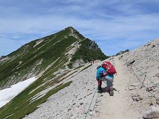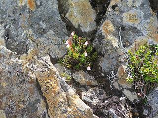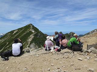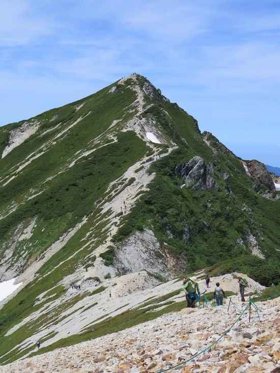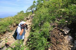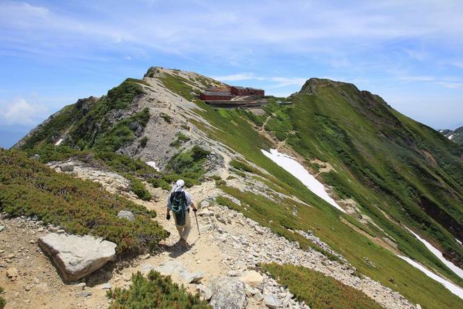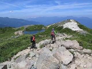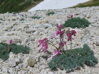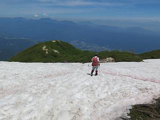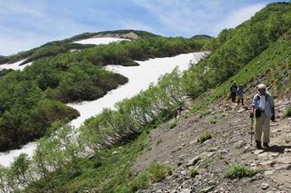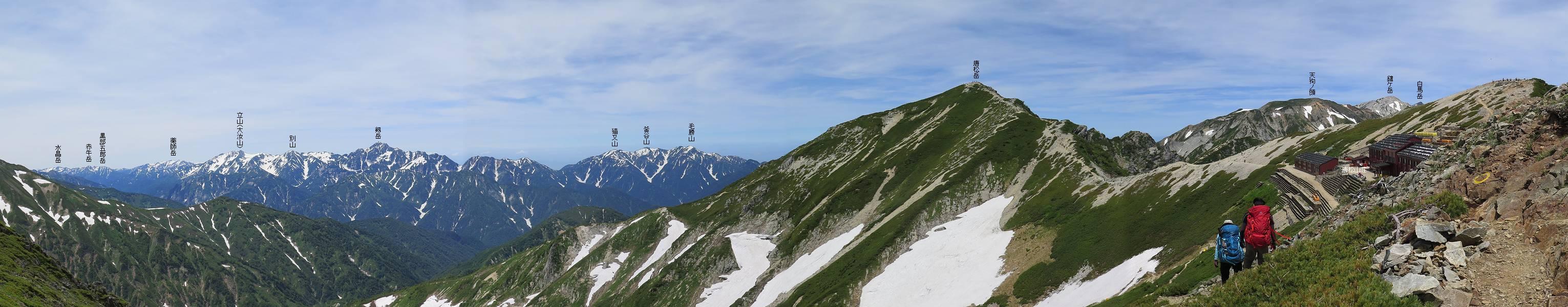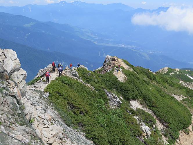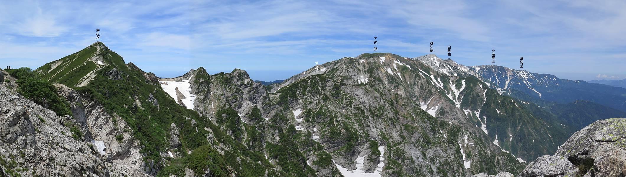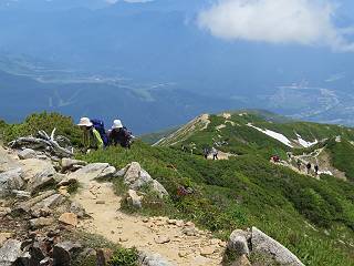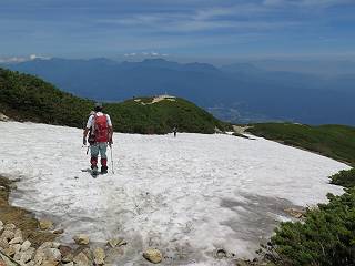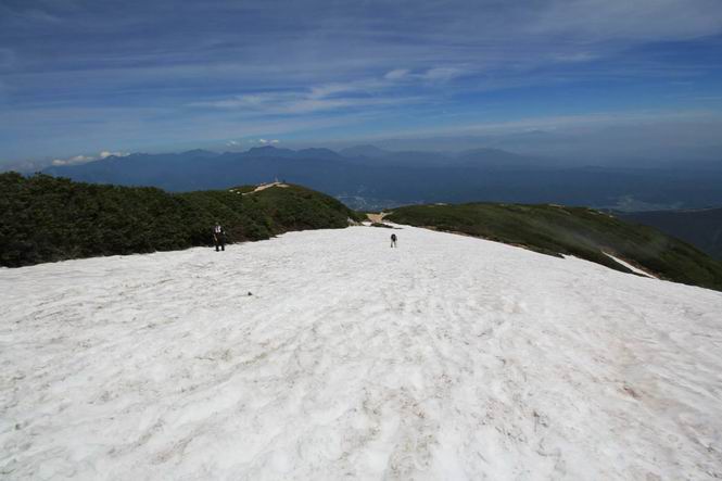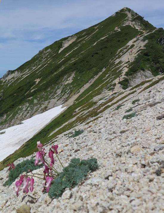 | 唐松岳⇒黒菱 黒菱⇒唐松岳 唐松岳で出逢った花 山頂から少し戻り、五龍岳方向に進むと、コマクサが点々と咲き始めていた。唐松岳頂上山荘前を通り、次の小ピークまで進む、tomoさんの足なら五龍岳をピストンし、日没までに十分下山できるだろう。しかし、私のこともあり、単独では・・・・・。八方尾根の分岐点へ戻り、山荘の東側小ピークに出た、11:16。八方尾根には点々とハイカーの姿、その数知れず、山頂部のガレた登山道、待たされるのは仕方ないこと。ハイマツ帯から雪渓を下り、丸山ケルンの南側を巻き、扇雪渓の道標に出る、12:14。 唐松岳山頂を後に、五龍岳方向に進みます 唐松岳頂上山荘付近のコマクサ 唐松岳をバックにコマクサ 五龍岳寄りの小ピークへ進む ![]() 小ピーク付近から水晶岳〜白馬岳 画像クリック拡大 クサリ場の始まるところで折り返す 岩場伝いに歩き、小ピークを踏んで登山道に降りました 戻って八方尾根分岐 山荘の東側のピーク 見納めの唐松岳 ![]() 唐松岳〜乗鞍岳 画像クリック拡大 下り準備OK、八方尾根 行き交うハイカー 団体さんかな、お休み中 チングルマの群生地で・・・ 丸山ケルン付近の雪渓を快適に下る 右上の写真を撮っていたら上から狙われてました もう一つ下ると、 扇雪渓の道標 ここから疎林に入る、往路オオサクラソウとシラネアオイを楽しんだ所だ。またもつかまってしまった、薮に入り、枝をかき分け満開のシラネアオイに見入る。この間、上りの方、20人以上通ったが、気づいてないようだ。ダケカンバの森を抜け、眼下に八方池を望む、13:15八方池分岐点着。池の南側から逆さ白馬三山を撮ろうとしたが、漣にその姿は見えなかった。 灌木帯に入り、キヌガサソウ、シラネアオイをまた・・・ ダケカンバの美林を抜け、回り込めば 八方池を眼下に、 、 ちょっと進めば、八方池へ 白馬三山と八方池、私が米粒位に移ってます、どこでしょう? ![]() 白馬三山と八方池 画像クリック拡大 池から登り返して稜線へ、13:51八方山、14:17黒菱平、作業道を下って、14:29駐車場に戻る。総所要時間は、10時間20分、ちなみにコースタイムは9時間ほど、白馬三山日帰りが、唐松岳に化けてしまった山行でした。 軽く登り返して八方山 下って、下って・・・ 黒菱平を抜け 作業道を下れば、駐車場 歩いてみれば、花と眺望、満喫でき、疲労もあまり感じなかった。tomoさんには折角上越の山から北アルプスに、大きくハンドルを切ったのに、申し訳ないことをしてしまった。 ※当ページ内で使用した、私の写っているものはtomoさん提供です。 黒菱⇒唐松岳 唐松岳で出逢った花 |