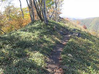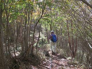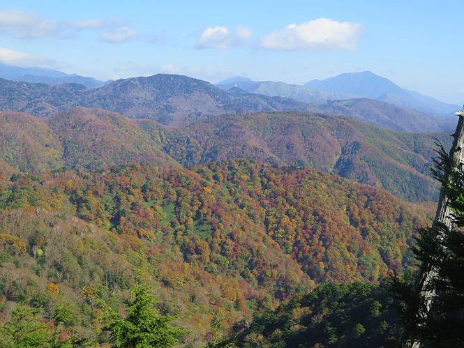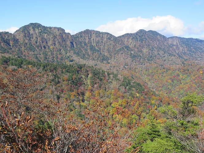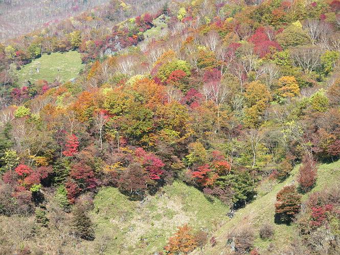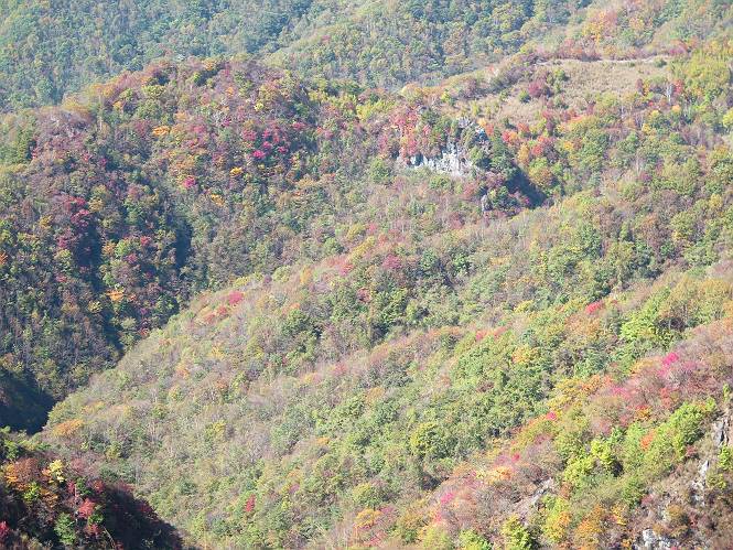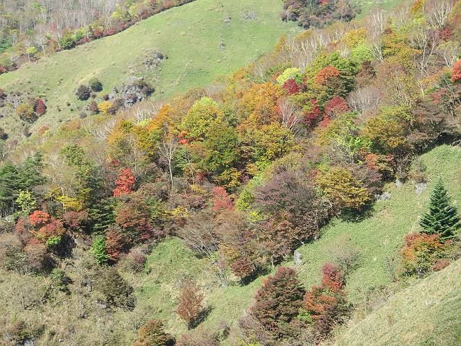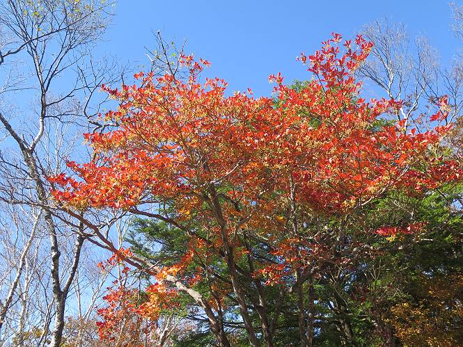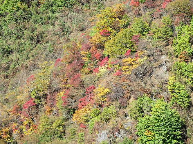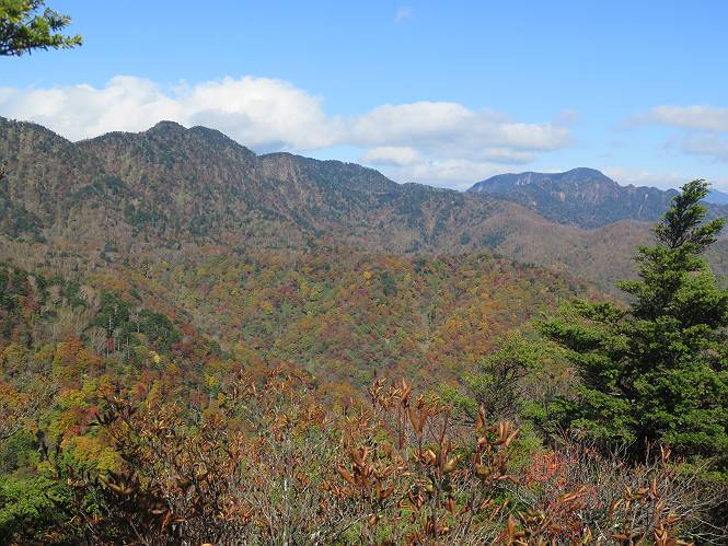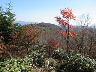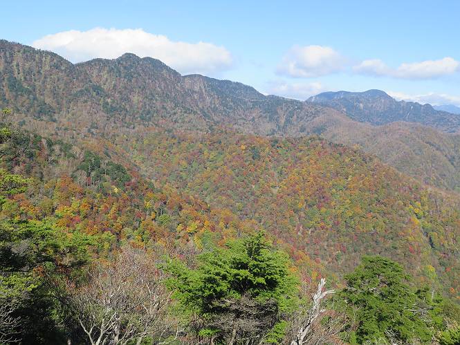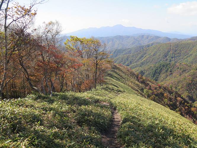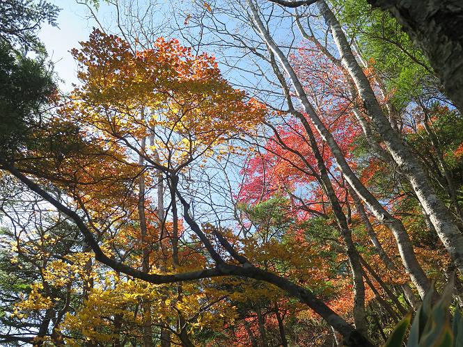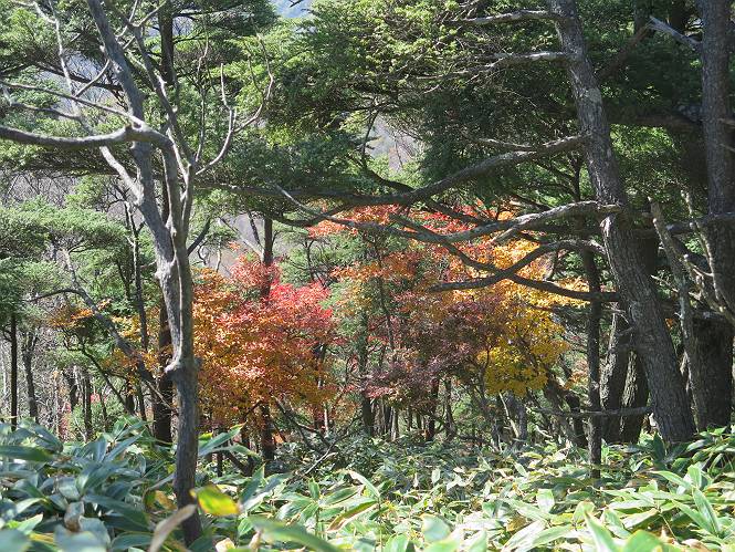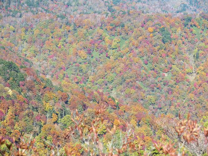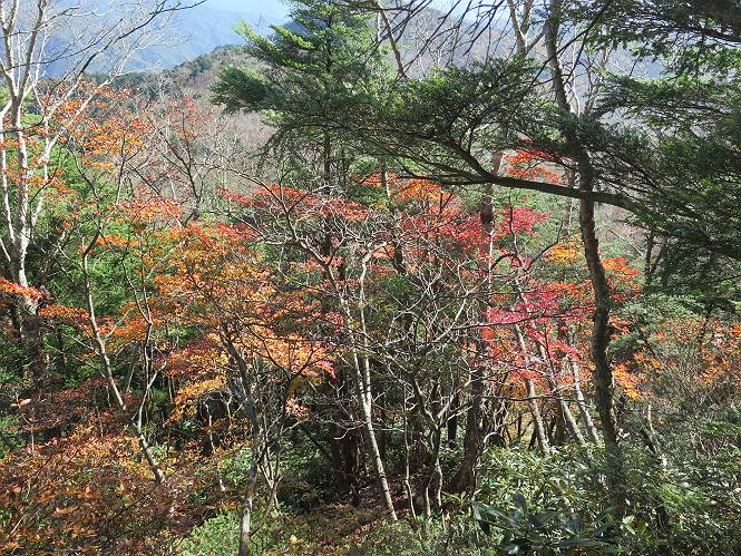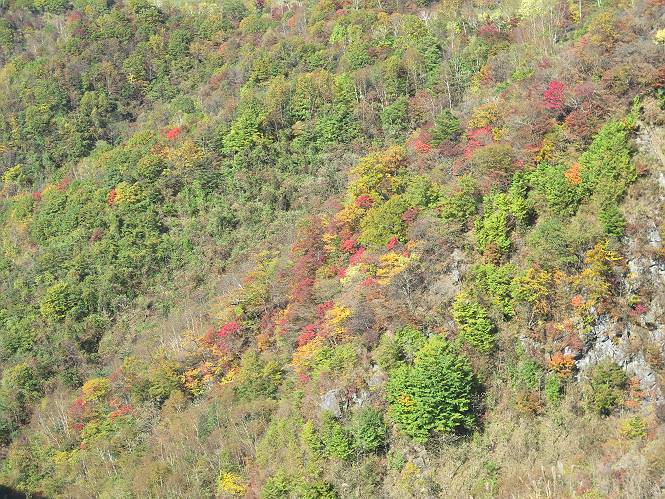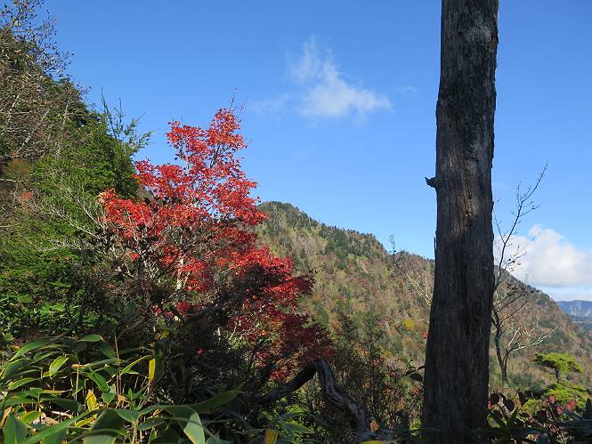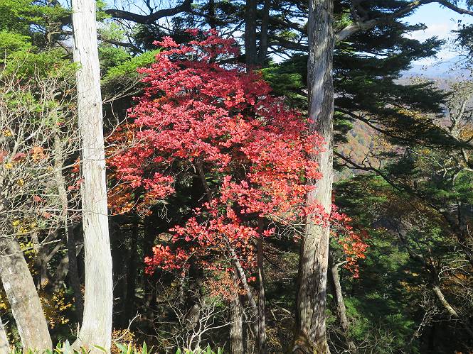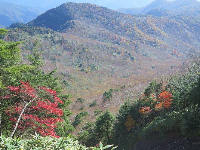 つづき TOPページに戻る 山頂を後に、コメツガの樹林帯を急降下する、上りは足元ばかり気をつかい見落とした紅葉が輝きを増して見える。急降下の最後の所で3番目の方とすれ違う。 ちょっと藪に入って小丸山を撮る、綺麗だ 樹間から左下方に男体山 ツツジ系の紅葉、サラサドウダンかな? 3番目のハイカー 急坂から抜けて、小丸山方向 紅葉を見ながら緩やかに下る 鞍部に出て、軽くアップダウンすると 避難小屋に出る また、谷方向を覘いて、 小丸山山頂へ、深い餅ケ瀬川を覘くハイカーが一人 袈裟丸連峰〜皇海山 画像クリック拡大 袈裟丸連峰、左から前袈裟丸山、後袈裟丸山、中袈裟丸山、奥袈裟丸山、袈裟丸山(最高点) 奥袈裟丸山、袈裟丸山(最高点)、皇海山 後袈裟丸山、中袈裟丸山、奥袈裟丸山、袈裟丸山(最高点) 奥袈裟丸山、袈裟丸山(最高点)、皇海山、奥右に鋸山 餅ケ瀬川筋の紅葉 小丸山で小休止、10:27-10:34、谷を眺めてた若い男性、初めて来られたのか、ビューポイントを問われた、行けたかなあ? ここからは、一気に下り、雨量観測所を越え、11:11賽ノ河原、旧登山道合流点まで、ここでミズナラの黄葉を撮った。条件が良ければ、真っ赤の紅葉するときもあれば、黄葉もある、茶色くなって落ちる場合もある。雑木林から出ると、弓の手の絶景が待っている、秋の陽を一杯に浴び、袈裟丸山を背景に、派生する無数の尾根と谷、南に赤城山構える雄大な眺めだ。コーナーで回り込むと、先に下った男性、ここで休憩していたとか、11:51折場登山口駐車場着。 賽ノ河原付近で 旧登山道の合流点付近 同、ミズナラの黄葉 弓の手の眺望 画像クリック拡大 画像クリック拡大 画像クリック拡大 画像クリック拡大 二人、上って行った、これで今日は6人 コーナーへ 画像クリック拡大 コーナーをまわれば、間もなく折場登山口の駐車樹 総所要時間は、4時間45分、お天気にも恵まれ、あまり期待もしていなかった紅葉、意外や意外、ゆっくり楽しめた。 TOPページに戻る |