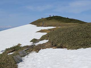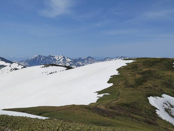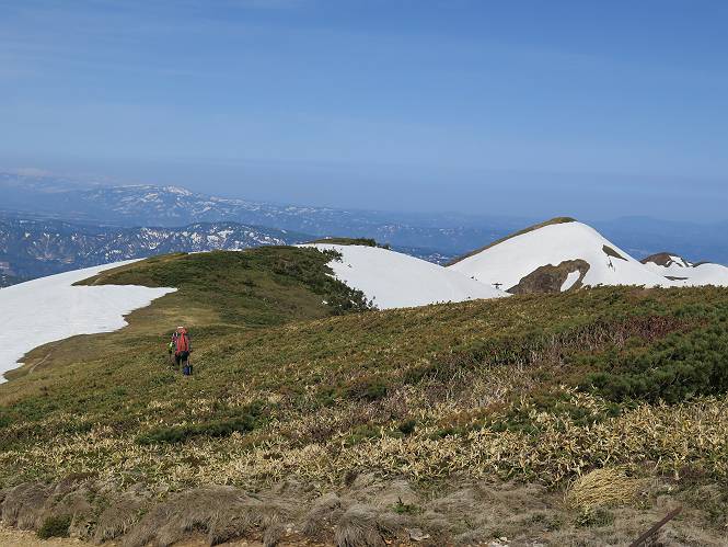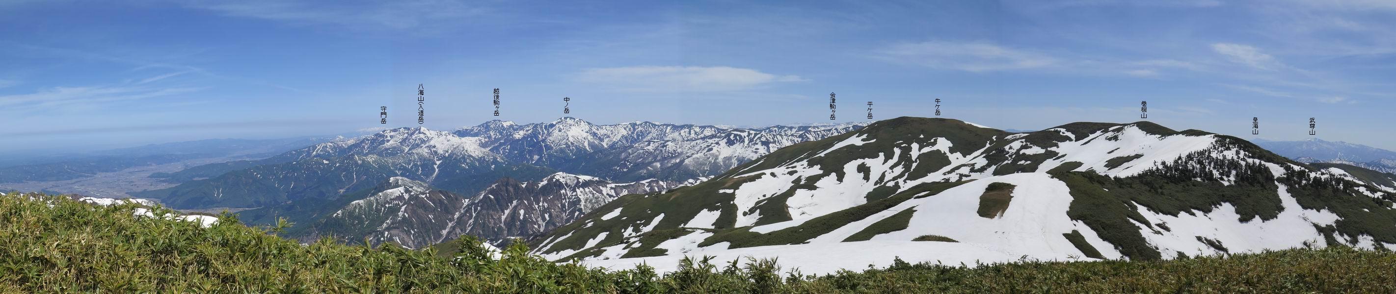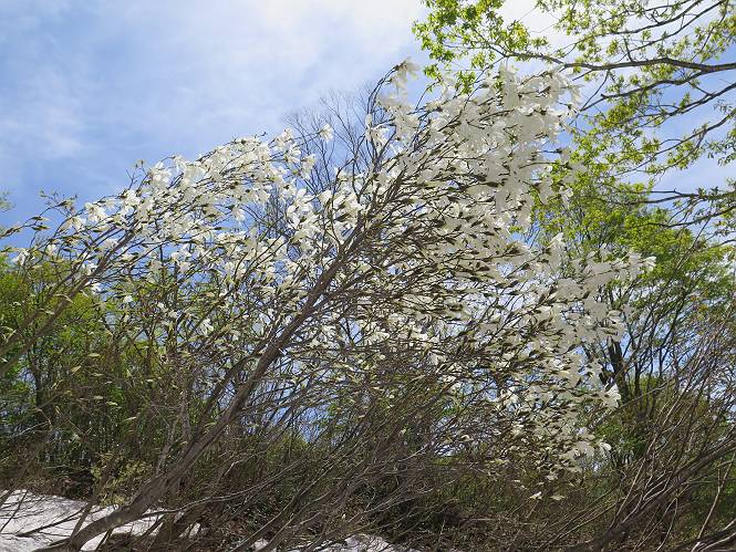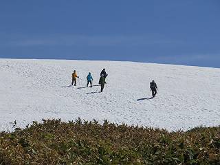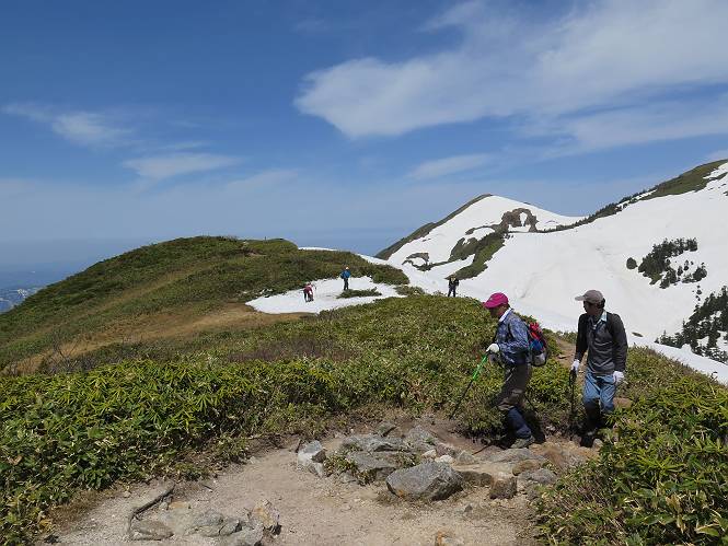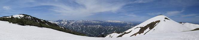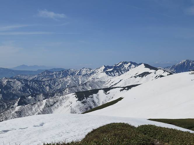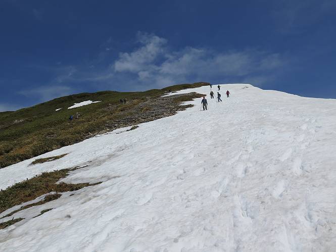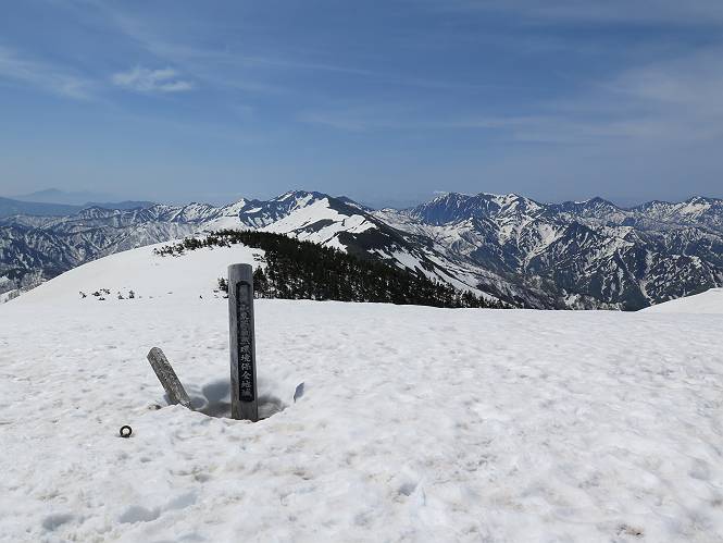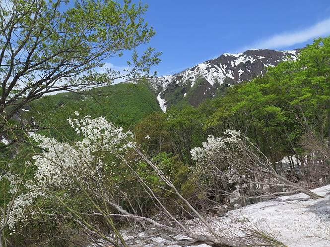 【後編:御機屋⇔牛ケ岳、御機屋⇔割引岳、御機屋⇒桜坂P】 TOPページへ 夏道がほとんど出ている緩やかな尾根道を南方向に進むと最高点付近に石積があり、棒が立っている、巻機山山頂到着である、8:46、一望して牛ケ岳目指して進む。 夏道がほとんど出ている、緩やかな尾根を南進 巻機山山頂、最高点近くに石積あり 巻機山山頂から割引岳 巻機山山頂からの眺望 画像クリック拡大 八海山〜谷川岳〜苗場山 割引岳から巻機山、牛ケ岳の尾根筋は低い笹に被われた高層湿原で、点々と池塘があり、木道から眺めながら歩ける。その夏道も一部雪が残る程度である。緩やかにアップダウンする道を、上越の山並を堪能しながら歩く、ポツンと笹道に三角点がある、牛ケ岳山頂9:08-9:40。眺望を楽しみながら先端を往復、たった一輪、ヒメイチゲの花を見つけた、感動。 牛ケ岳へ向かう、すっかり雪の消えた池塘あり 奥が牛ケ岳 低い笹の間に夏道がほとんど見えている 登山道から燧ケ岳 至仏山、小至仏山、笠ケ岳、奥に日光白根山と錫ケ岳 武尊山、左奥に皇海山 朝日岳、左奥に赤城山 牛ケ岳直下に5人のGr 登山道から巻機山&割引岳 画像クリック拡大 30mほどの残雪を渡りきるまで待っていてくれた直下に見えたGr 間もなく牛ケ岳山頂着 牛ケ岳山頂 画像クリック拡大 八海山〜巻機山 牛ケ岳山頂 画像クリック拡大 八海山〜万太郎山 牛ケ岳山頂 画像クリック拡大 皇海山〜割引岳 妙高山(左)&火打山 苗場山方面 苗場山 谷川岳方面 谷川岳、一ノ倉岳、茂倉岳 左奥に赤城山と朝日岳方面 武尊山方面 至仏山、奥に日光白根山 燧ケ岳 中央奥に会津駒ヶ岳、右に平ケ岳 越後三山、左から八海山、越後駒ヶ岳、中ノ岳 八海山と奥に守門岳 山頂先端で見つけたたった一輪のヒメイチゲ 牛ケ岳を後に、残雪を踏んで、9:54朝日岳分岐点、ここから朝日岳への長いヤブ尾根、期間限定、まだ歩いている人がいるようだ。10:00巻機山、大へん賑わっていたが牛ケ岳に向かいそうな人はいなかった、緩やかに下って、10:09御機屋 帰路は残雪を踏んで・・・ 巻機山に向かって・・・ 朝日岳方面分岐点、ここから長いヤブ尾根の向こうに朝日岳 巻機山山頂、見入る朝日岳&谷川岳(?) 残雪を踏んで 御機屋へ戻る、贅沢な昼寝をする女性あり ここからトレースを辿って割引岳へ向かう。ちょっと進むと戻ってくるハイカーあり、「もう、誰もいない」ようだ。中間の小ピークを越え、登り返すと、山頂直下の雪は複雑に崩壊していたが、もう雪面も晩期で危険は感じなかった、割引岳10:28-10:36。素晴らしい眺望を独り占めし、10:54御機屋に戻る。 ここからトレースを辿って割引岳を往復する 二人戻ってくるハイカーあり 中間の小ピークから御機屋 同、割引岳 ![]() 画像クリック拡大 巻機山と割引岳の間に烏帽子岳〜火打山 直下のトレース 割引岳山頂、一等三角点あり 割引岳山頂の眺望 画像クリック拡大 八海山〜武尊山 八海山、奥は守門岳 越後駒ヶ岳、中ノ岳 割引岳山頂の眺望 画像クリック拡大 巻機山〜苗場山 誰もいない割引岳山頂を後に 御機屋に戻る 巻機山御機屋を後に、向かう力の入る人たちを見ながらスイスイと下る、11:03避難小屋、軽く登り返して、11:11前巻機山。居合わせたオッチャン二人に山名を問われ、ここから抜きつ抜かれつ。11:20八合目、ちょっと夏道を歩き、残雪の急斜面に出る。 避難小屋から、 前巻機山へ 前巻機山を下るオッチャンたち、行き交う上り&下りの人 ゾロゾロ繋がって・・・ 八合目で夏道を少々 ここから急斜面を下る 一気に下り、わずか3,4分でブナの樹林帯へ、テントを右手に見て、間もなく夏道に出て、11:50五合目、大源太山を眺め、またブナ林へ。しかし、ここからのルートは勘所、トレースだらけ、チョコチョコ見えてる夏道、覆いかぶさる木々に阻まれる。怪しい箇所も何度か、12:34二合目、12:40井戸尾根入口、12:43桜坂駐車場着。 オッチャン二人もついてくる あっという間に樹林帯へ ブナの樹林帯を縫って下ると テントには人が・・・ 五合目で夏道から大源太山を仰ぐ・・・ 目印を確認しながら、・・・ トレースだらけで??? 時々夏道を もう大分下って、タムシバが満開 オオカメノキの白い花も新緑のヤブで目立つ 真っ白なタムシバ、ちょっと降りてみよう まだ起きかけた状態で咲いています 花数の多いこと 青空に映えますね、よく見ると1/3ほどしか咲いてないんですね グシャグシャ、ツルツルの夏道を歩き 二合目着、オッチャンたち早いな、着いていた 間もなく井戸尾根入口 駐車場には20台ほど 総所要時間は、7時間55分、ちょっと五合目からの下りは難儀したが、あとは快調に歩けた。この時期の素晴らしい眺望に大満足の一日だった。 TOPページへ |