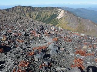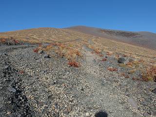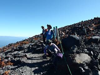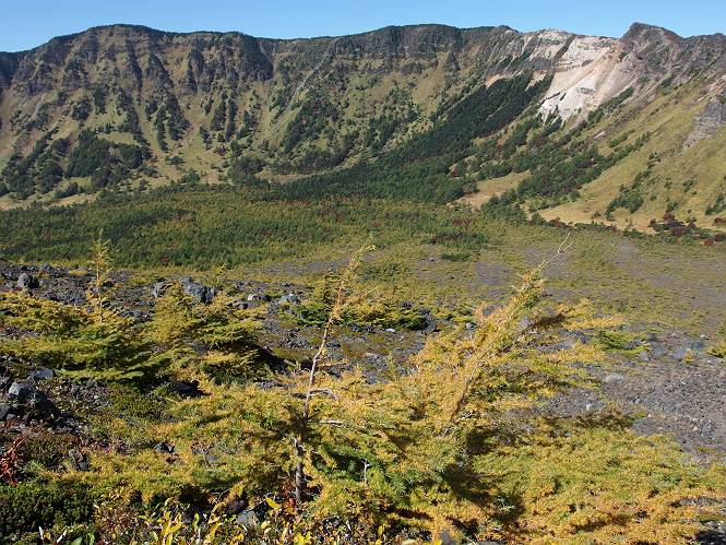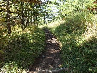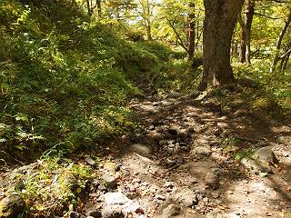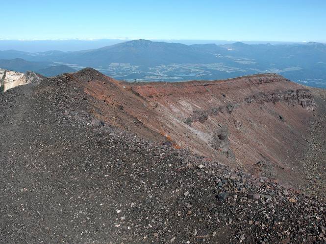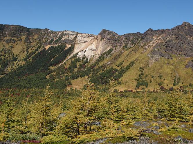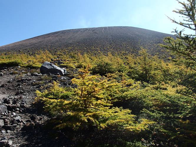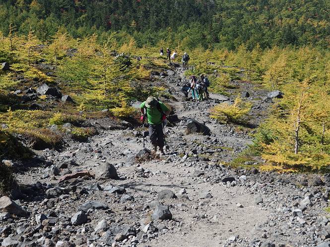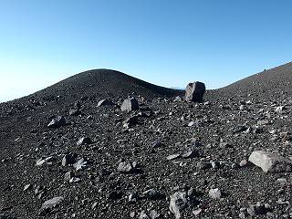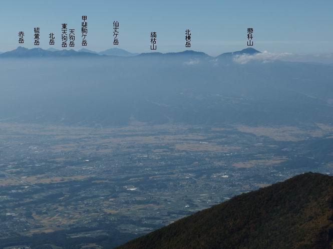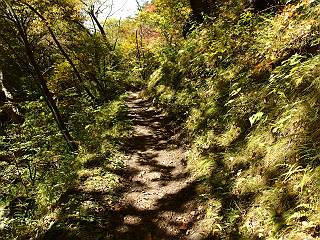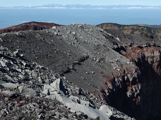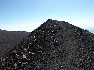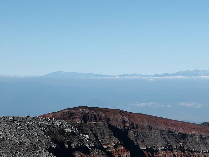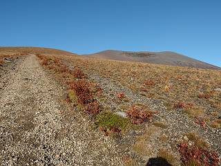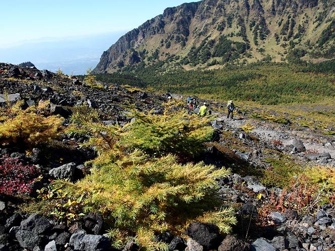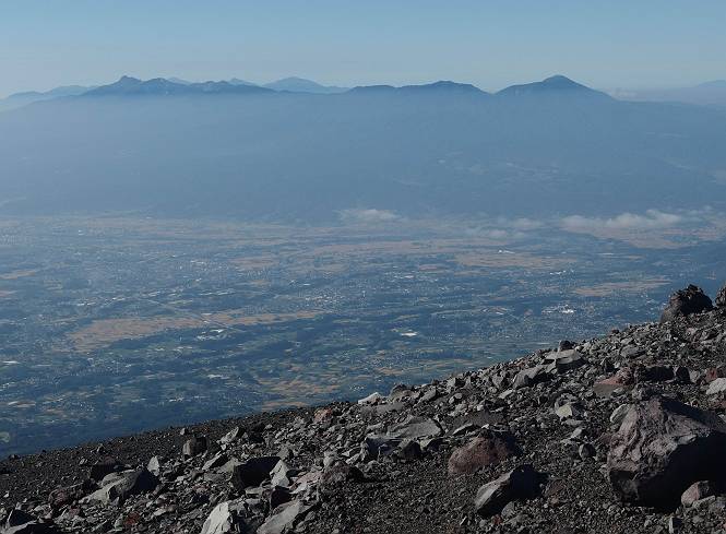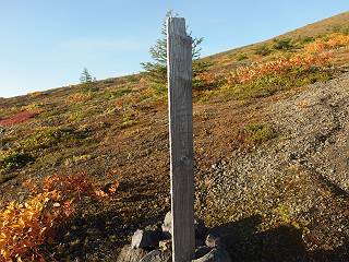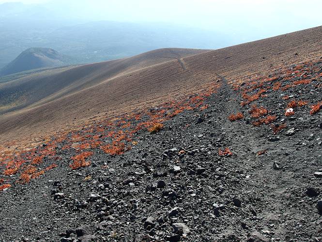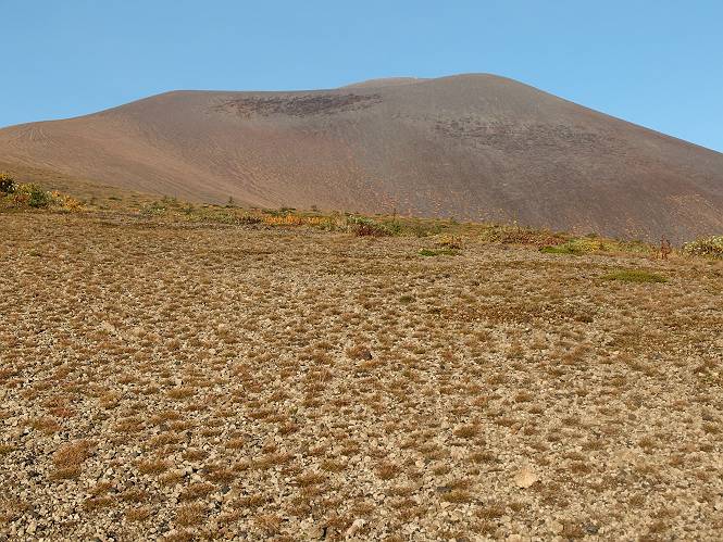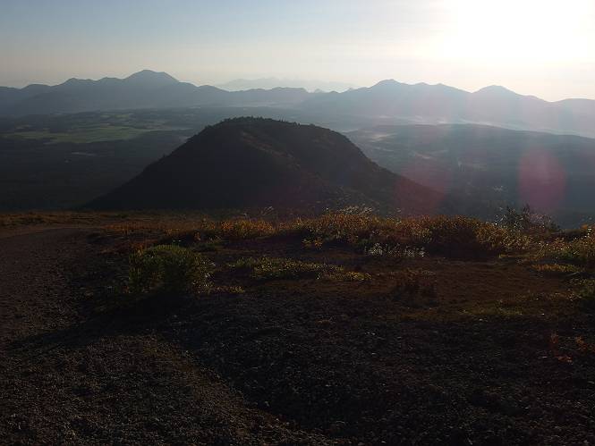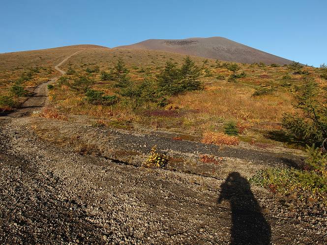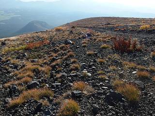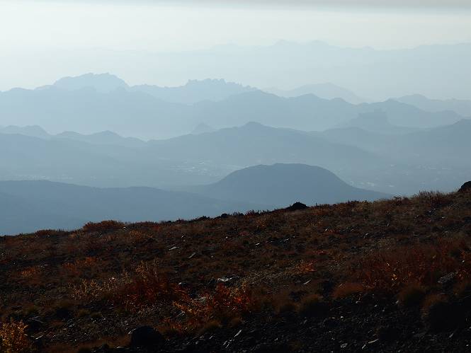 第一日目へ 第2日目へ 第3日目へ 第4日目へ 第5日目へ 第六日目 中軽井沢(沓掛)→A山→小諸駅 9/28(日) 晴れ 概略図はこちら 2:56、“中軽井沢”交差点を出発、峰の茶屋に向かう。陽が昇る前に峰の茶屋まで着きたい、あとは今日のコースを余裕で歩けるはずだ。“中軽井沢”と峰の茶屋の標高差が、460m、距離は10kmちょっと、5時30分着を予定している。本日までの間に4日間あったので、足はすっかり戻っている感じ。半分道中を過ぎると、勾配を増しカーブが連続する。日曜日、天気のいいようで、車の数が多い、トラックが多いのには驚いた、嬬恋の野菜でも直接店舗に運んでいるのかな? 辺りが薄明るくなり、A山の輪郭が見てくると、そろそろ峰の茶屋到着です、5:16-5:29山靴に替えて砂礫侵入防止にスパッツをつける。 沓掛、“中軽井沢”交差点を出発 R146を鬼押出し方向に北進する 軽井沢町万山望、峰の茶屋まであと1/3かな 登坂車線はここまで、どこを歩けばいいのかな、カーブで車が突っ走って行くんですよ 薄明るくなってきました、A山の輪郭が 峰の茶屋はもうすぐ ちょっと下降ぎみ(?)に峰の茶屋到着です 峰の茶屋休憩ポイントで山靴&スパッツ 噴火警戒レベル1、ここからは自己責任で! 念のため状況を把握、昨日御嶽山が噴火したので気になるところ。『・・・山は爆発的な噴火をする活火山です、自己責任で!』、了解しました、ということで入らせてもらいます。小浅間山を巻きながら雑木林の間を進む、紅葉もツタウルシが真っ赤だった、5:56小浅間山への道を右に分け、左に入る。ロープが半分あいていたので、ちょっと安心、潅木の間の坂道を上る。ここから山頂直下まで、砂礫に悩まなくてはならない歩きにくい道なのだ。 ツタウルシ、ヤマサクラの紅葉が進む道、小浅間山方面に進む 朝日を枝間から、日の出です 小浅間山への道を分け、A山へ向かいます 小浅間山のシルエット、山頂は右奥 潅木の間を抜け砂礫の道へ 樹林帯を抜けた所で15分ほど小休止、朝食をとる。すると、後方から鈴の音とともに男性が追いついてきた。その方も距離をおいて休憩、挨拶だけして先に進む。勾配がキツクなり、山頂部が隠れる、振り返って、小さくなっていく小浅間山、遠のいていく浅間隠山、鼻曲山を眺め一息入れながら、どうにも仕方ない砂礫の道を1歩1歩前進する。いつの間にか後方にいた男性は見えなくなってしまった、時々振りかって見るのだが、姿はない。 樹林帯から抜け、静かなA山 小浅間山を振り返る 砂礫の急坂を進む、 オンタデの紅葉は晩期 峰の茶屋から2.5km、昔の道標かな 急坂で山頂部が見え隠れ 東前掛山の分岐点でまた小休止、7:10-7:18、分岐点といっても道標があるわけでない、±50m位の漠然とした範囲である。ここまで来れば、半分というところかな、あと1時間かな。ここから右に反れながら上って行く、辿ってきた道が一望できる位置にある。しかし、まだまだキツイ場所がある、また山頂部が隠れてしまった、急斜面なのだ。やっと抜け、不毛の斜面に出る、振り返れば南東方向に東前掛山が山らしく、やはりピークなんだ、って感じ。その先で前掛山に通じているような轍に出て、左に曲って山頂直下に出る。 分岐点付近、左が東前掛山、右奥が山頂 歩いて来た道を振り返る 妙義山方面 日光白根山遠望、手前は浅間隠山 四阿山方面の展望 山頂方面、大分近づいてきました これから上は草がないようです、小浅間山方面を振り返る 山頂方向 東前掛山 轍を詰め、間もなくA山山頂2568m、峰の茶屋との標高差は約1160m、8:11到着。山頂は快晴、弱い2,3m/sec風が吹いている。火口の噴煙は高いところで4,5mあるかな、ほぼ真っ直ぐ上っている。ここからは匂いも無く、遠望する眺望は素晴しい。昨日噴火した御嶽山が前掛山の左の方に見える、左に長い煙をなびかせている。火口の南を通って西方へ歩く。 もう少しで山頂到着です この辺が最高点2568mでしょう 画像クリック拡大 昨日噴火した御嶽山遠望 画像クリック拡大 A山最高点付近から西方向の展望 画像クリック拡大 A山山頂からの展望、火口壁の直ぐ後に前掛山と黒斑山、遠方に御嶽山、乗鞍岳、北アルプス A山山頂からの展望、北方向に四阿山、奥に頚城山塊 A山山頂からの展望、火口壁の後に、東籠ノ登山&西籠ノ登山、その後に烏帽子岳&湯ノ丸山、遠方に北アルプス A山山頂からの展望、西方向で前掛山&黒斑山、遠方に北アルプス A山山頂からの展望、前掛山、後に黒斑山、遠方に御嶽山、乗鞍岳、北アルプス A山山頂からの展望、前掛山、遠方に乗鞍岳、北アルプス穂高岳付近 A山山頂からの展望、前掛山 A山山頂からの展望、南方向に八ヶ岳、後に南アルイプス、八ヶ岳の真ん中は仙丈ケ岳 A山山頂からの展望、秩父連峰西部、富士山が金峰山の背後に薄く見えてました 何度か山頂を踏んでいるが、これだけ見えたの初めて、富士山は薄っすら金峰山の奥に、残念ながら上越、日光方面は見えない。南西位置まで歩くとキツイ臭いが鼻を