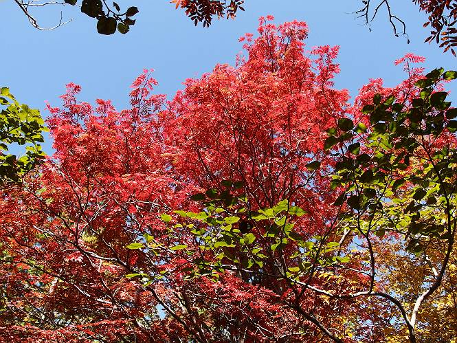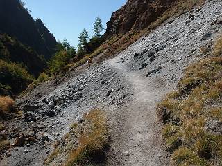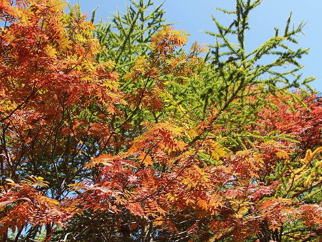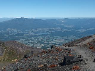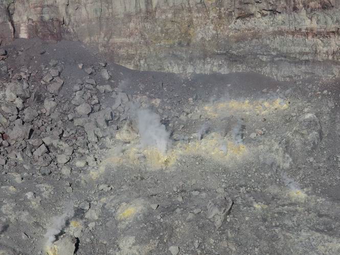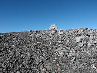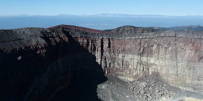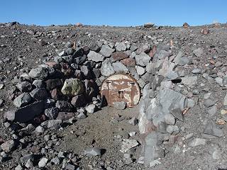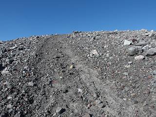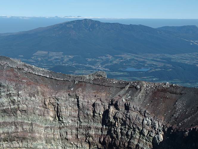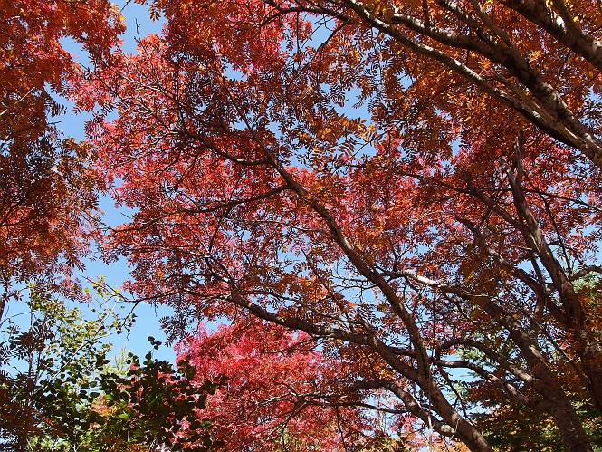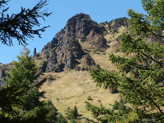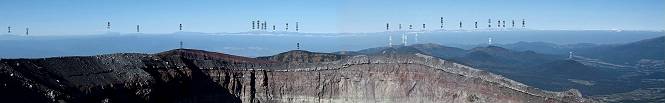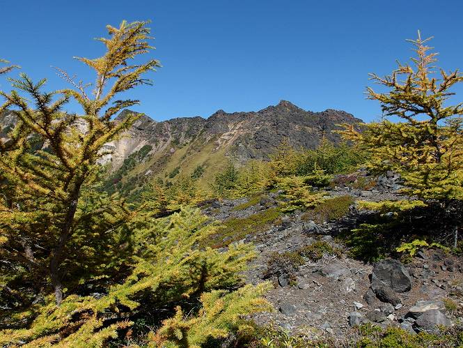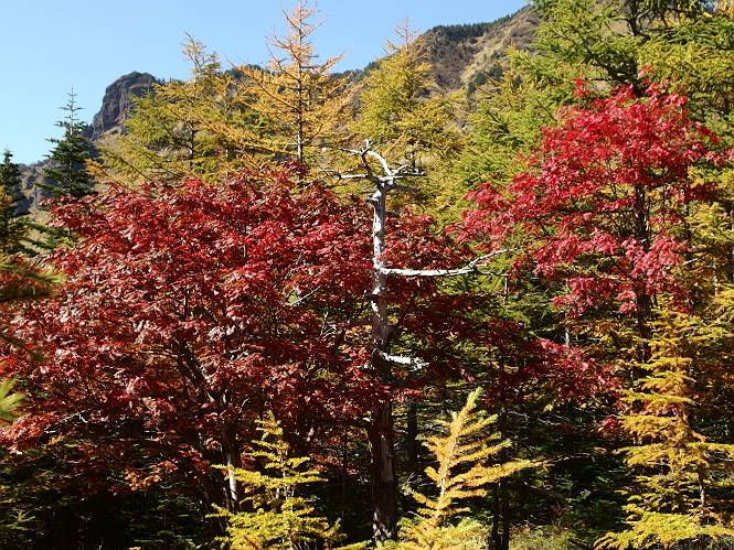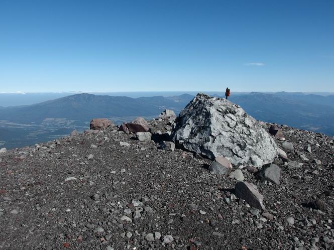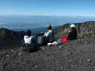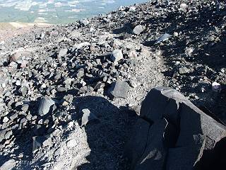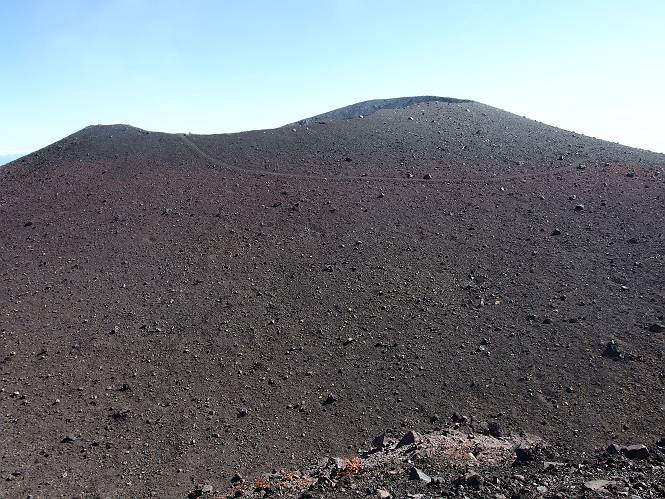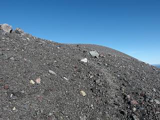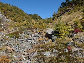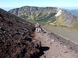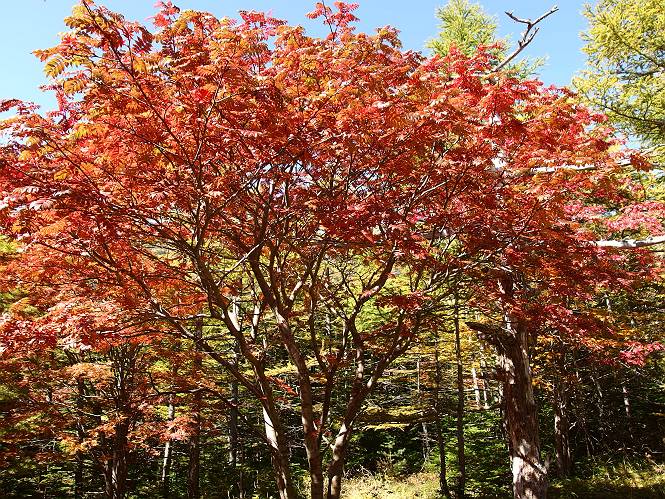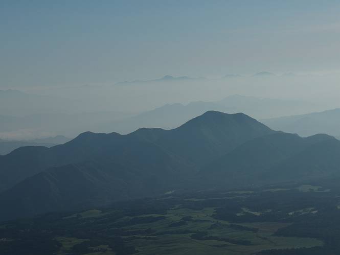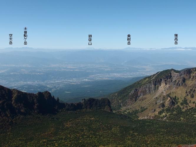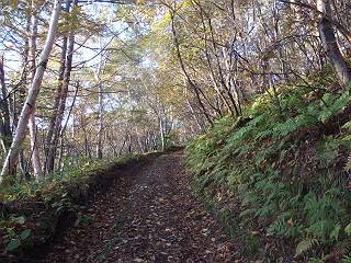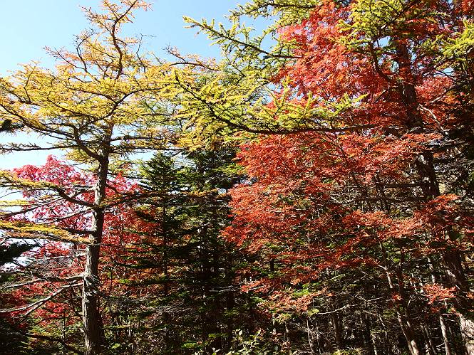 第一日目へ 第2日目へ 第3日目へ 第4日目へ 第5日目へ 第六日目 中軽井沢(沓掛)→A山→小諸駅 9/28(日) 晴れ 概略図はこちら 2:56、“中軽井沢”交差点を出発、峰の茶屋に向かう。陽が昇る前に峰の茶屋まで着きたい、あとは今日のコースを余裕で歩けるはずだ。“中軽井沢”と峰の茶屋の標高差が、460m、距離は10kmちょっと、5時30分着を予定している。本日までの間に4日間あったので、足はすっかり戻っている感じ。半分道中を過ぎると、勾配を増しカーブが連続する。日曜日、天気のいいようで、車の数が多い、トラックが多いのには驚いた、嬬恋の野菜でも直接店舗に運んでいるのかな? 辺りが薄明るくなり、A山の輪郭が見てくると、そろそろ峰の茶屋到着です、5:16-5:29山靴に替えて砂礫侵入防止にスパッツをつける。 沓掛、“中軽井沢”交差点を出発 R146を鬼押出し方向に北進する 軽井沢町万山望、峰の茶屋まであと1/3かな 登坂車線はここまで、どこを歩けばいいのかな、カーブで車が突っ走って行くんですよ 薄明るくなってきました、A山の輪郭が 峰の茶屋はもうすぐ ちょっと下降ぎみ(?)に峰の茶屋到着です 峰の茶屋休憩ポイントで山靴&スパッツ 噴火警戒レベル1、ここからは自己責任で! 念のため状況を把握、昨日御嶽山が噴火したので気になるところ。『・・・山は爆発的な噴火をする活火山です、自己責任で!』、了解しました、ということで入らせてもらいます。小浅間山を巻きながら雑木林の間を進む、紅葉もツタウルシが真っ赤だった、5:56小浅間山への道を右に分け、左に入る。ロープが半分あいていたので、ちょっと安心、潅木の間の坂道を上る。ここから山頂直下まで、砂礫に悩まなくてはならない歩きにくい道なのだ。 ツタウルシ、ヤマサクラの紅葉が進む道、小浅間山方面に進む 朝日を枝間から、日の出です 小浅間山への道を分け、A山へ向かいます 小浅間山のシルエット、山頂は右奥 潅木の間を抜け砂礫の道へ 樹林帯を抜けた所で15分ほど小休止、朝食をとる。すると、後方から鈴の音とともに男性が追いついてきた。その方も距離をおいて休憩、挨拶だけして先に進む。勾配がキツクなり、山頂部が隠れる、振り返って、小さくなっていく小浅間山、遠のいていく浅間隠山、鼻曲山を眺め一息入れながら、どうにも仕方ない砂礫の道を1歩1歩前進する。いつの間にか後方にいた男性は見えなくなってしまった、時々振りかって見るのだが、姿はない。 樹林帯から抜け、静かなA山 小浅間山を振り返る 砂礫の急坂を進む、 オンタデの紅葉は晩期 峰の茶屋から2.5km、昔の道標かな 急坂で山頂部が見え隠れ 東前掛山の分岐点でまた小休止、7:10-7:18、分岐点といっても道標があるわけでない、±50m位の漠然とした範囲である。ここまで来れば、半分というところかな、あと1時間かな。ここから右に反れながら上って行く、辿ってきた道が一望できる位置にある。しかし、まだまだキツイ場所がある、また山頂部が隠れてしまった、急斜面なのだ。やっと抜け、不毛の斜面に出る、振り返れば南東方向に東前掛山が山らしく、やはりピークなんだ、って感じ。その先で前掛山に通じているような轍に出て、左に曲って山頂直下に出る。 分岐点付近、左が東前掛山、右奥が山頂 歩いて来た道を振り返る 妙義山方面 日光白根山遠望、手前は浅間隠山 四阿山方面の展望 山頂方面、大分近づいてきました これから上は草がないようです、小浅間山方面を振り返る 山頂方向 東前掛山 轍を詰め、間もなくA山山頂2568m、峰の茶屋との標高差は約1160m、8:11到着。山頂は快晴、弱い2,3m/sec風が吹いている。火口の噴煙は高いところで4,5mあるかな、ほぼ真っ直ぐ上っている。ここからは匂いも無く、遠望する眺望は素晴しい。昨日噴火した御嶽山が前掛山の左の方に見える、左に長い煙をなびかせている。火口の南を通って西方へ歩く。 もう少しで山頂到着です この辺が最高点2568mでしょう 画像クリック拡大 昨日噴火した御嶽山遠望 画像クリック拡大 A山最高点付近から西方向の展望 画像クリック拡大 A山山頂からの展望、火口壁の直ぐ後に前掛山と黒斑山、遠方に御嶽山、乗鞍岳、北アルプス A山山頂からの展望、北方向に四阿山、奥に頚城山塊 A山山頂からの展望、火口壁の後に、東籠ノ登山&西籠ノ登山、その後に烏帽子岳&湯ノ丸山、遠方に北アルプス A山山頂からの展望、西方向で前掛山&黒斑山、遠方に北アルプス A山山頂からの展望、前掛山、後に黒斑山、遠方に御嶽山、乗鞍岳、北アルプス A山山頂からの展望、前掛山、遠方に乗鞍岳、北アルプス穂高岳付近 A山山頂からの展望、前掛山 A山山頂からの展望、南方向に八ヶ岳、後に南アルイプス、八ヶ岳の真ん中は仙丈ケ岳 A山山頂からの展望、秩父連峰西部、富士山が金峰山の背後に薄く見えてました 何度か山頂を踏んでいるが、これだけ見えたの初めて、富士山は薄っすら金峰山の奥に、残念ながら上越、日光方面は見えない。南西位置まで歩くとキツイ臭いが鼻を