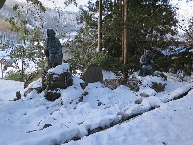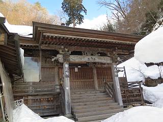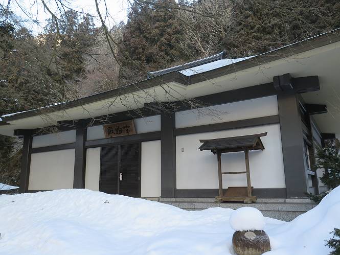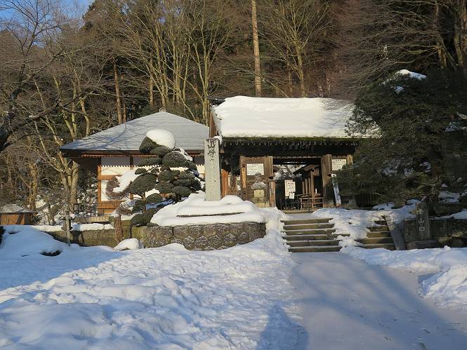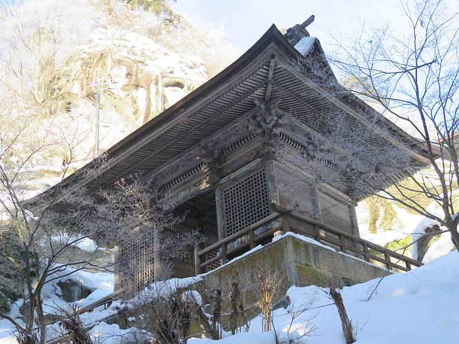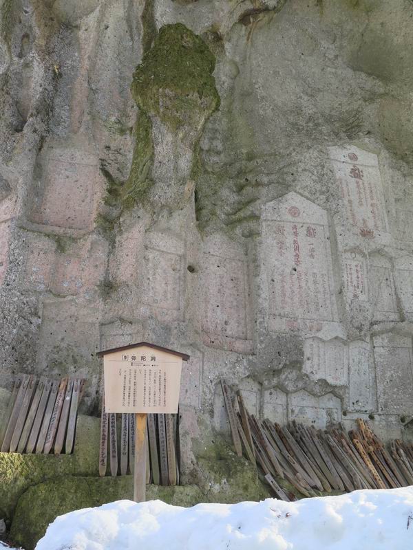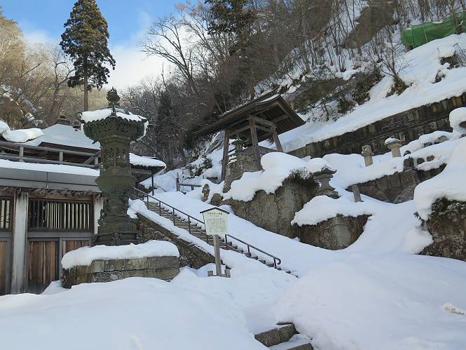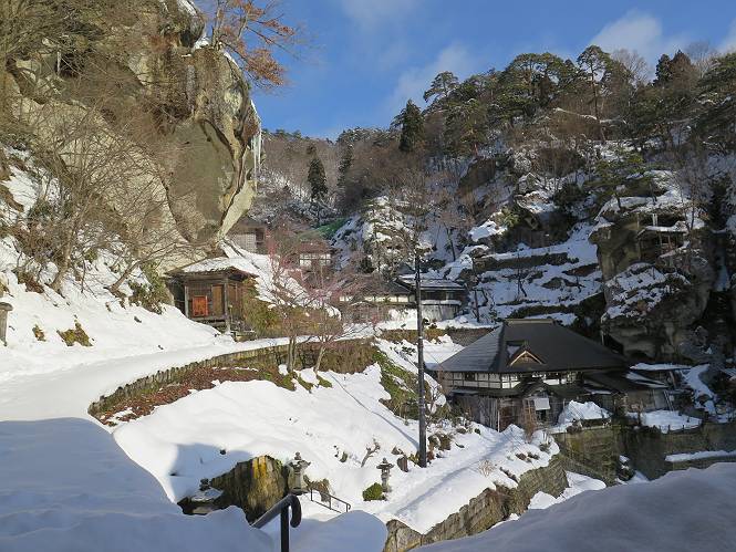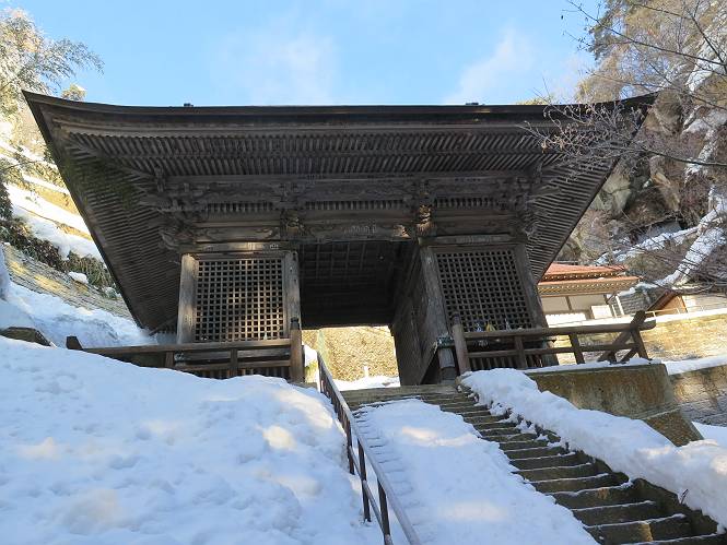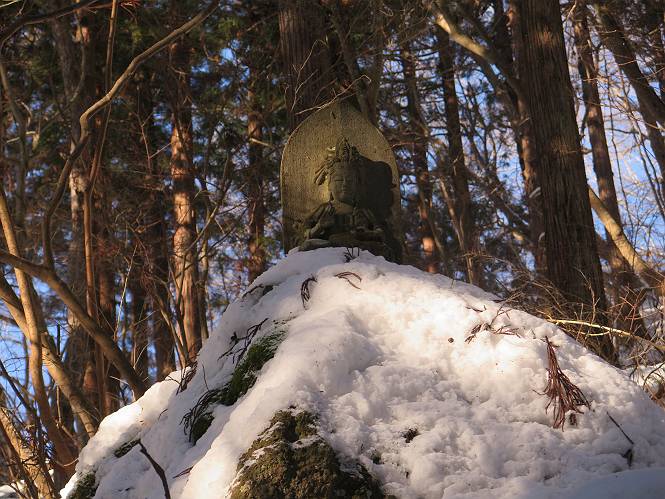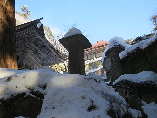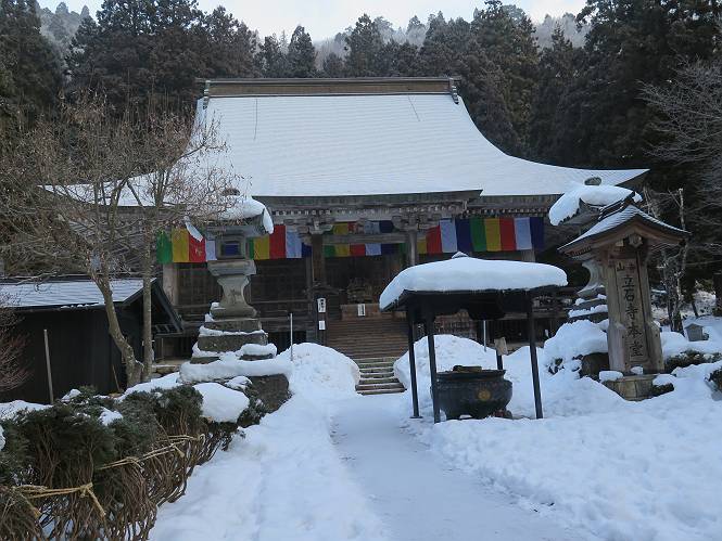 | 7日目:天童温泉→山寺 ルート図はこちら 8.4km、曇りのち晴れ TOPページへ戻る 1日目:二本松宿→福島宿 2日目:福島宿→白石宿 3日目:白石宿→岩沼宿 4日目:岩沼宿→仙台宿 5日目:仙台→作並温泉 6日目:作並温泉→(作並街道、関山街道)→天童温泉 最終日、7日目、いよいよ山寺だ。立石寺の開くのが8:00のようだ、7:30に登山口着とすると、逆算して5:30出発となる。半分送ってしまった軽さで勢いついたのか、歩道で尻もちをついてしまった。簡易スパイクをつけたりして、5:32道の駅出発、5:37津山小角で右折、道なりに進んで6:28山寺街道に入る、道は歩道も車道も凍結状態、交通量が少ないのと簡易スパイクが効いて歩きにくくはない、出発時に雪がチラついていたが止んで、東の空は少し赤く染まっている。7:06県道19号線に合流、こちらも山寺街道、“奥の細道”の角柱、立石寺に近づいている、気温は−5℃、無風、寒さは感じない。山寺の中心部をみながら脚に力が入る、7:26の分岐、左に入って門前を観光、7:40立石寺登山口着。 宿を出て直ぐ、薄っすら積もった歩道の雪にスッテンコロリ、簡易スパイクをつけて道の駅天童を出発 津山小の角を右折、道なりに進む 干布小入口を通過 干布の交差点で左へ、山寺街道(県道111号線)に入る 道はツルツル、テカテカ 大きな枝垂桜と石碑、ゆとりのエリアかな サクランボ畑を左右に南東方向に道なり 山寺に入って県道19号線に合流、山寺街道を東方向に進む 立石寺に近づいてきました、−5℃ですが寒さはあまり感じません 見えているのは山寺の中心部かな ちょっと右を見てます 立石寺は左に 立石寺の下山口 門前の街と駅に通じる橋です 日枝神社の入口、登山口からも回り込める 青空も見える、今日は晴れてくれるのかな? 明け方にかけて降った雪は周辺の山裾を白っぽく染めていた。階段を上がり、正面に根本中堂、前後左右建屋、石碑を見ながら読みながら、撮りながら進む、そして、芭蕉と曾良の銅像&“閑さや・・・”の句碑、念仏堂を見ると、8:00を回っていた、陽も差してきた。 立石寺の登山口 階段を上がると 根本中堂、本堂とも書いてあります 正面にズッシリと布袋様、体を撫でて願い事をお祈りするとか 中堂の外観 進むと左手に御神木のイチョウ、 先ほど下から眺めた日枝神社への階段 日枝神社 日枝神社 日枝神社の前にある亀の甲石 右手に御神神輿殿、 その左に宝物殿 左に芭蕉と曾良の銅像 有名な、“閑さや・・・”の句碑 と、芭蕉 念仏堂 念仏堂の右隣りにある白い仏 巡拝料を投函して、凍った階段を進む、無積雪の立石寺とは違い、足元を気にする。姥堂の傍で4本爪の軽アイゼンに変えて、足元の安全を図る。素晴らしい景色に陶酔の心地、階段を一歩一歩、歴史を肌で感じつつ、仁王門をくぐり、奥の院へと進む。 山門、 「開北霊窟」の額がある、ここで巡拝料¥300、8:00-16:00 無人、帰りは有人だったようです まず、正面階段を上ります 右斜面に石碑などなど 進みます 先方に見えていた石碑 わかりませんが、味がありますね、歴史かな・・・・・、伝わってきますよ 階段を上がって右手に姥堂、説明もありますが・・・、 ここで簡易スパイクを軽アイゼン(4本爪)に変える オッカネェッ! 姥堂の奥にある石碑 右は雪がかいてあり、歩行可能ですが、左は危険 両脇に並ぶ石碑 良い顔してるね 石碑の間を上がって行きます 御手掛岩だそうです 登山口から270段、奥の院まで730段と書いてあります 静寂、差し込む陽が何とも言えないですね、温かみかなあ? 凝灰岩の崖と着雪 凝灰岩の崖と着雪 凝灰岩の崖と着雪 石碑の間を行く 凝灰岩にはいろいろ刻まれているのですが、・・・ 説明書きもありました、長くなるので・・・ これは仏像が刻まれているようです 据えられた仏像 正面の岩にも、板碑型の供養碑などがいっぱい彫られてます せみ塚、芭蕉の句を書いた短冊を埋めて石の塚としたようです まだまだ、階段は続きます 弥陀洞と書いてあります 周辺には石碑が沢山 すれ違った方、滑ったようです、気をつけないと危ないですよ 仁王門が左上に 仁王門 仁王門 仁王門 岩場にはツララが 奥の院は雪囲いがあり、チラッとしか見えなかった、ちょっと戻って五大堂へと進む。ここも開山堂は雪囲いの中、五大堂で展望する。立石寺と見渡す雪の山寺の街、夢にまで見たその光景、いつまでも見入ってしまった。 この上が奥の院です 奥の院、雪囲いがありまして 奥の院 奥の院正面の額 「霊鷲道場」の額 雪囲いのある左側の建物、大仏殿 下りながら前方上を見てます 左上が納経堂、中央が開山堂、右奥が五大堂です 開山堂が雪をかぶった木で見えにくいですが、きれいでした ちょっと下から開山堂に向かいます、 正面が開山堂です ここも雪除けがありまして、左が納経堂、右が開山堂です 手前右の石碑 開山堂の正面です 納経堂です 開山堂付近から眺める立石寺です 開山堂の脇を上って、 間から開山堂を見てます もうちょっと上って 五大堂、宝珠