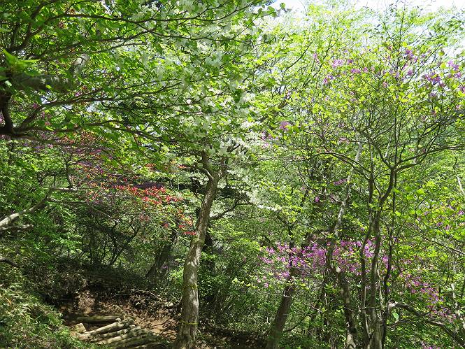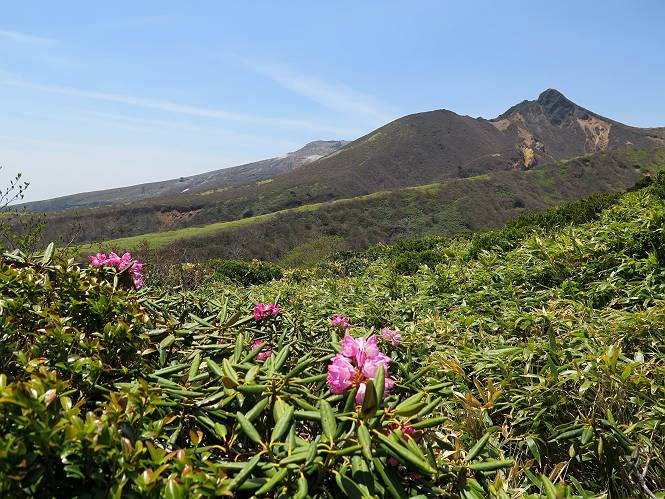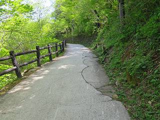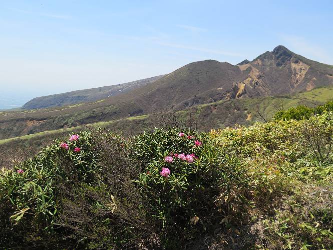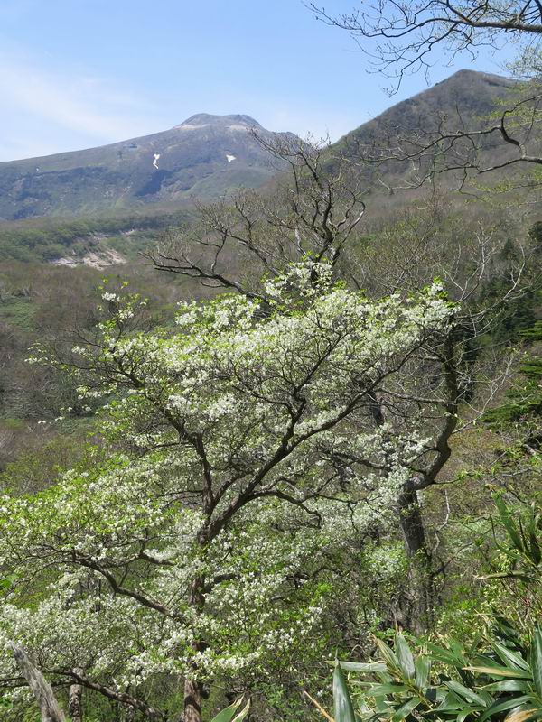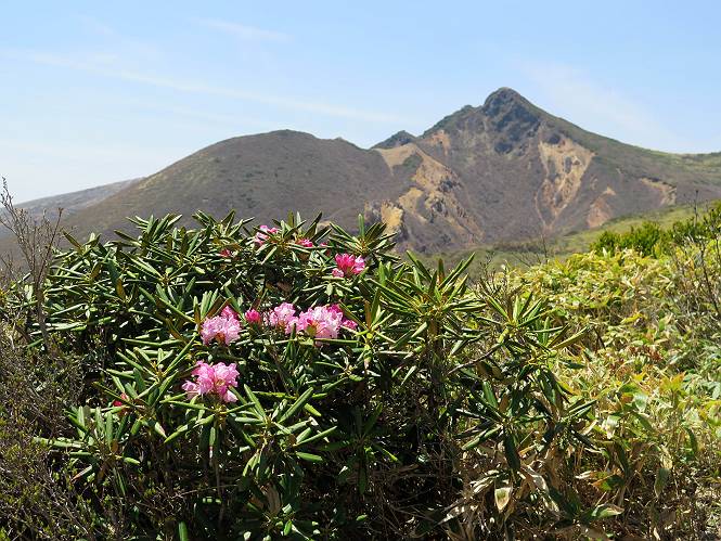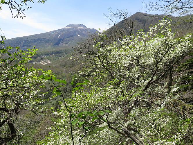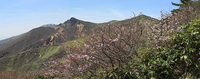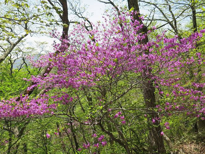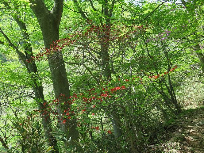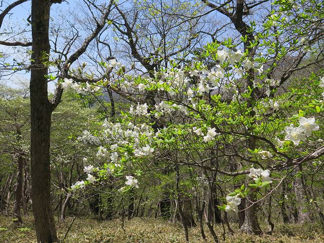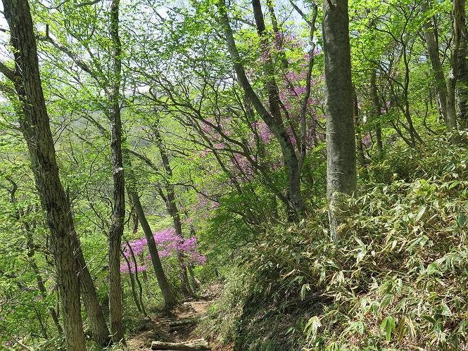 【後編:三本槍岳⇒北温泉⇒大丸温泉P】 【前編:大丸温泉⇒飯盛温泉跡⇒三本槍岳】 下って、10:46北温泉分岐、緩やかに上って、中の大倉尾根に出る。ミネザクラを見ながら少し進み、11:00赤面山への道を分ける。ここからは長い一直線の尾根下り、花を見ながら、那須連峰を眺めながら、砂利篭(蛇篭:鉄線を用いた篭を作り、砕石を詰め込んだもの、河川の護岸工事等に用いる)に足をとられないように進む。11:44、ゴンドラ分岐点、ここから中の大倉尾根から外れ、尾根下の遊歩道を進む。 三本槍岳を後に、 山頂部を下ると 左手に、1880mのピークとその中腹〜上の方に通じる登山道が見える、中の大倉尾根はここから派生している 鞍部から少々登り返し、 北温泉分岐点(標高点1856m) ここから少し上がって、朝日岳を右手に見ながら、 中の大倉尾根の下りとなる 比較的暖かいのか、ミネザクラが登山道沿いに点々と咲いていた 赤面山分岐点から赤面山、この辺からしばらく蛇篭の坂道 ![]() 分岐点付近から、ミネザクラと朝日岳 画像クリック拡大 同、ミネザクラと朝日岳 足場の悪い坂道を下ると、アズマシャクナゲが点々と、 アズマシャクナゲと朝日岳 アズマシャクナゲと朝日岳 アズマシャクナゲと朝日岳 勾配が緩やかになって、北温泉まで3.8kmの道標 脇に那須連山の案内板 ![]() 付近の眺望 画像クリック拡大 左から茶臼岳、鬼面山、朝日岳、清水平 鬼面山と朝日岳、中の大倉尾根と鬼面山の間に毘沙門沢(余笹川源流)が流れている 間もなく樹林帯に入る ここまで下ると芽吹きが始まっている ブナの根元にオオカメノキが咲く ゴンドラ分岐点、ここから中の大倉尾根から外れ、 尾根下の遊歩道を進む ここでも期待していたシロヤシオは急斜面の林中に、道沿いはこれからだ。15分ばかり進んで、下のゴンドラ分岐点を過ぎると、シロヤシオが開花していた。下るにつれて、ミツバツツジ、ヤマツツジも加わり、色濃くなる緑の中で共演していた、12:38北温泉、12:45北湯駐車場、路上歩きを3kmほど、13:13出発点の大丸駐車場着。 緑が徐々に濃さを増し、シロヤシオの花が樹林帯に目立ってくる 遊歩道に面した場所はこれから開花 下のゴンドラ分岐 休憩する散策者 その先で、突然シロヤシオの大木、背景に茶臼岳 高度が下がり、道沿いにシロヤシオが出現する 緩やかな道は突き当たって、 右手に曲がり、急坂となる ミツバツツジが点々と 緑に映えるミツバツツジ ヤマツツジ、シロヤシオ、ミツバツツジの共演 この辺のヤマツツジは蕾が多い 緑の中で際立つ赤 板橋を渡り、 余笹川を渡って、 段をちょっと上がれば 北湯駐車場へ通じる道 3kmほど歩き、 脇道を抜ければ出発点の駐車場 総所要時間は、8時間13分、早すぎた花見ハイクだった、あと1週間先になるのだろうか。那須連峰を縦走しながらもう一度歩きたいが、今年は? 参考: 2012/6/2 黒尾谷岳・南月山・日の出平・三本槍岳 【前編:大丸温泉⇒飯盛温泉跡⇒三本槍岳】 |