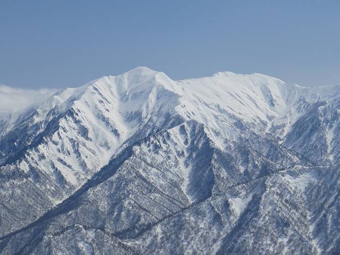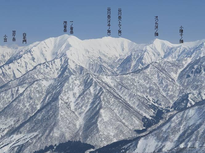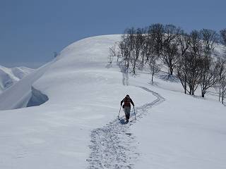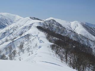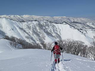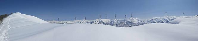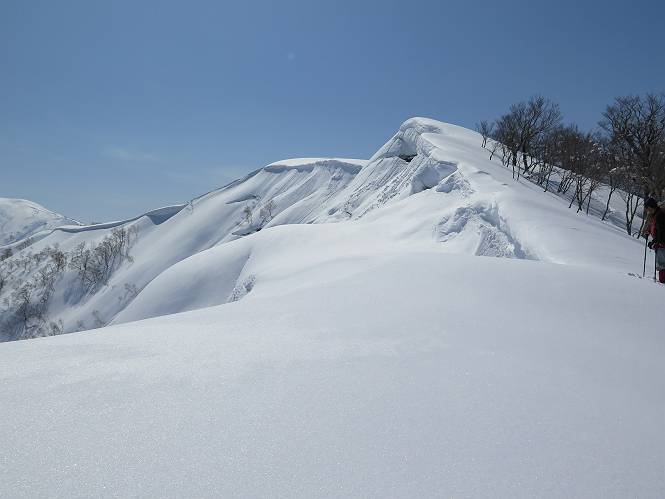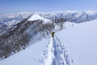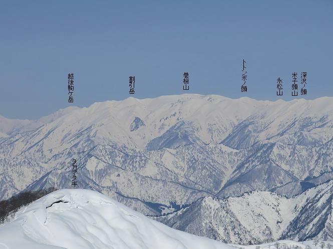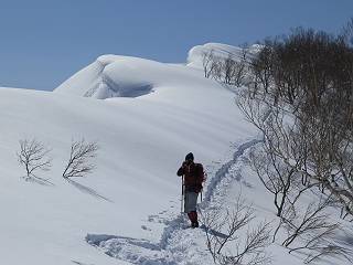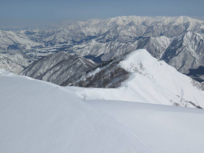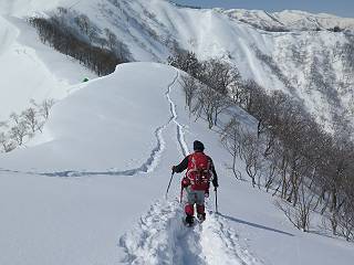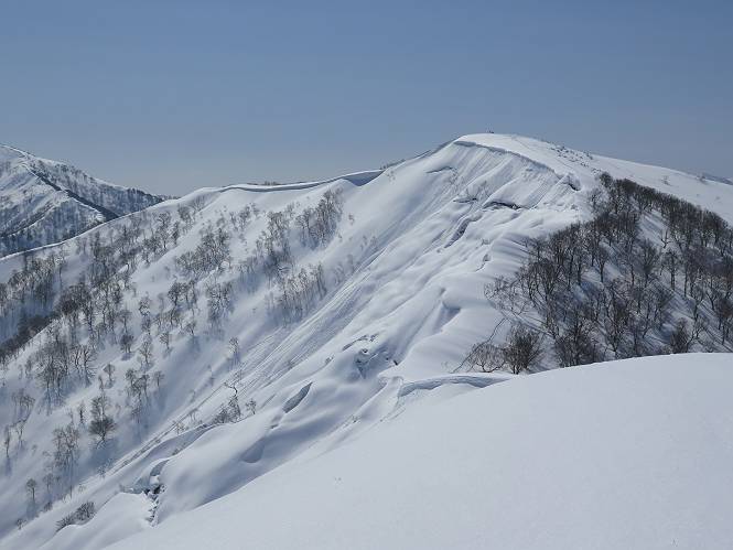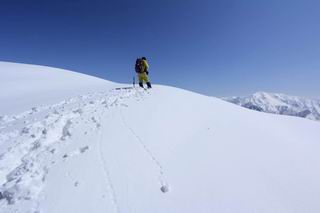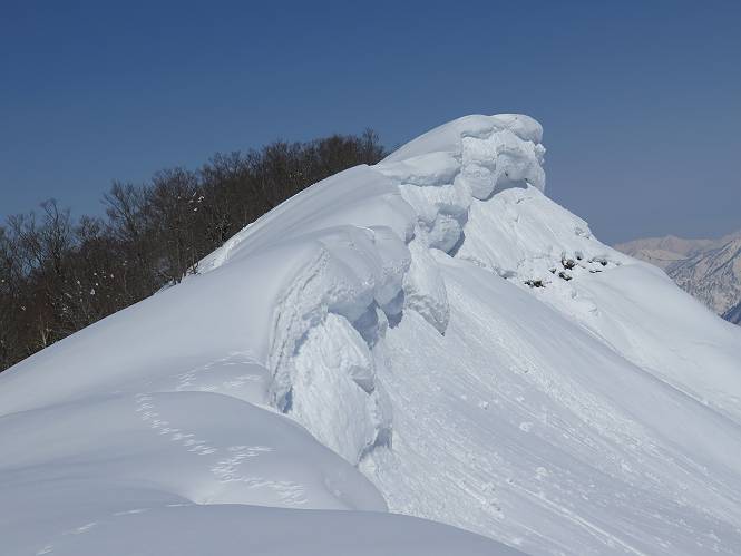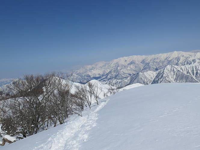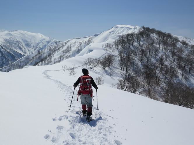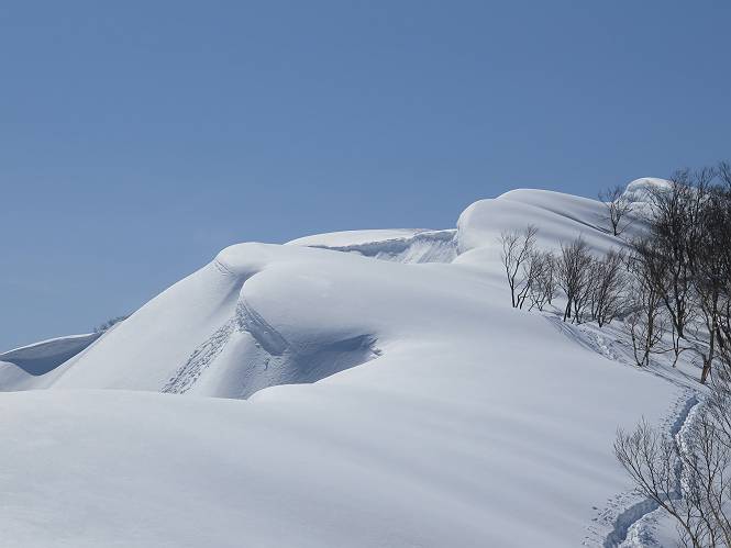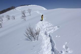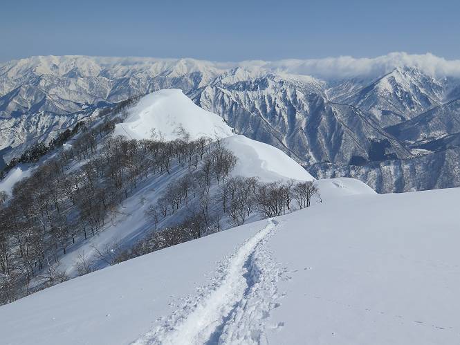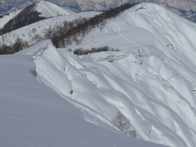 【2.棒立山⇒日白山】 【1.土樽⇒棒立山】 【3.日白山⇒二居】 棒立山を下り、尾根に張られたテントの横を通って、雑木林をかすめる。解け落ちる霧氷が首筋に、汗ばんだ体には、気持ちいい、ってところ。雑木から抜け、振り向くと良くもここまできたものよ、遙か下方に街並みが。雪の壁(ちょっと大げさかな)を上れば、タカマタギの手前のピーク、ちょっと早めの昼食をとる。tomoさんの担ぎ上げてきたお湯とそば、馳走になっちゃって、絶景を眺めながら頂いた、オイシイー、10:56-11:34。群馬県側の雲もとれ、山頂がほとんど顔を出す、皆そろってこんにちは。 棒立山を下って、小ピ^クを2つ、3つ越える、360度絶景コースである おやっ、どうしたのだろう 1.5m?、深い穴だ、スッポリ入ったら大変だ 小さいピークを越え 尾根上に張られたテントの横を通って進む 樹林帯をかすめて進む、気温が上がり霧氷がボタボタ落ちる タカマタギから派生する枝尾根の雪庇 画像クリック拡大 振り向けば、八海山と巻機山、棒立山 巻機山、棒立山 棒立山を背景に奮闘する私ですが、・・・・・ タカマタギの一つ手前のピーク直下 タカマタギ、一つ手前のピーク着、絶景をオカズに、ここで昼食 休憩ポイントから八海山〜日白山 画像クリック拡大 同、万太郎山〜苗場山 画像クリック拡大 同、左回りで、苗場山 苗場山アップ 中央奥に佐武流山、手前右は東谷山 手前中央は東谷山 左がタカマタギ、その右が日白山 右手前がタカマタギ、奥の右が平標山、左が仙ノ倉山 万太郎山 オジカ沢ノ頭、右奥が俎(マナイタ)ー 茂倉岳、右が谷川岳(左がオキノ耳、右がトマノ耳) 手前の山頂に雲のかかった武能岳、奥が朝日岳 手前左よりが大源太山、左の一番奥が平ケ岳 中央奥に巻機山、左奥に八海山 八海山を拡大 同ピークで、 お腹もいっぱい、いざタカマギへ! 下りにかかると、アイゼンの雪落としに悩む、高下駄ほどに成長し、そして滑る、仕方なくピッケルでフレームを叩く。落ちても一時、繰り返しの作業だ。外してしまえ!、軽くなった、ピッケルでカバーしながら歩けばいい。tomoさんが、雪庇の上から「come on」、素晴らしい雪庇にカメラは踊る。 休憩したピークからタカマタギへ この間の雪庇は見どころ 雪庇の間から白い山並みを 画像クリック拡大 雪庇の間から白い山並みを 画像クリック拡大 気温の上昇でアイゼンはダンゴ状に、危険を感じ外す 歩きだすと、tomoさんが“絶景”、と雪庇の上から呼ぶ ヨーシ、何が見えるかな? これはスゴイ、波が凍ったような形だ これは見事だ、本日、見た中で一番迫力があるかな 雪庇の間から白い山並みを 画像クリック拡大 こんな光景がタカマタギとの間に連続する 雪庇の間から白い山並みを 画像クリック拡大 雪庇の間から白い山並みを 画像クリック拡大 この辺の新雪は40cmほどありそう 見るものは見て、全部タダよ ラスト登坂でタカマタギへ タカマタギ山頂からの眺望、巻機山〜日白山 画像クリック拡大 タカマタギ山頂からの眺望、平標山〜苗場山、東谷山 画像クリック拡大 右回りで、八海山、巻機山方面 万太郎山、仙ノ倉山方面 仙ノ倉山、平標山方面 日白山 日白山、山頂に4,5人いるぞ 連なる雪庇を楽しみながら、直下の急斜面を上がれば、タカマタギの山頂である、12:23。ここも素晴らしいポイントであるが、先ほど休憩したポイントはタカマタギがピークとして見えるので、良いかな? 日白山の山頂には4,5人の人影、本日の最高峰、ここまで来れば日白山は目と鼻の先、もう、後から来る人もなさそうだし、快適な雪尾根ハイクを楽しもう。 日白山を目に前に、早く山頂を踏みたい気持ちもあるが、時間はあるし、折角の好天なのだからゆっくり楽しみたい。偶然とは言え、山の神から頂いた、本日の眺望、脳裏に焼き付けて、写真も沢山撮って行こう。多分、tomoさんも同じようなことを考えていることでしょう。情報は共有できても、生の景色をみないと記憶が消えてしまう、悔しいかな歳には勝てない。だから、五感を働かせて、あれも、これもいろんな形で取り込んで帰り、明日の糧にしている。 雪庇歩きのモデル、好天、安全・・・・、このルートの半分以上がこんな感じで歩けます。 雪庇の間から山並みを見つめ、山座同定 画像クリック拡大 トレースは雪庇先端から大分離れてますね、どうしてこんな形に? 雪庇崩壊のメカニズムは? 上の雪庇を反対方向から見てます 日白山直下を行く 直下の眺望 画像クリック拡大 やっとこ、山頂に着きました まず、平標山に伸びる尾根に見入る私 ゆっくり遊びながら山頂を踏む、12:54-13:23。二人にとって、1年ぶりの日白山山頂です。まず、平標一ノ肩、までのルートを目で追ってしまいました。新雪ですっかり化粧され、きれいですね。途中のピークまでトレースがありますが、その先は? この尾根から、二居に伸びるシュプールが斜面に描かれています。斜面をキャンバスに見立て、木々とシュプール、&人影、って、ダイナミッ
