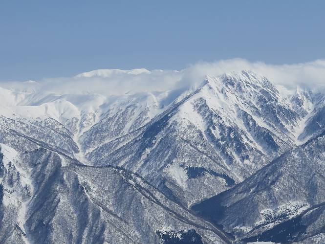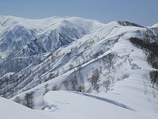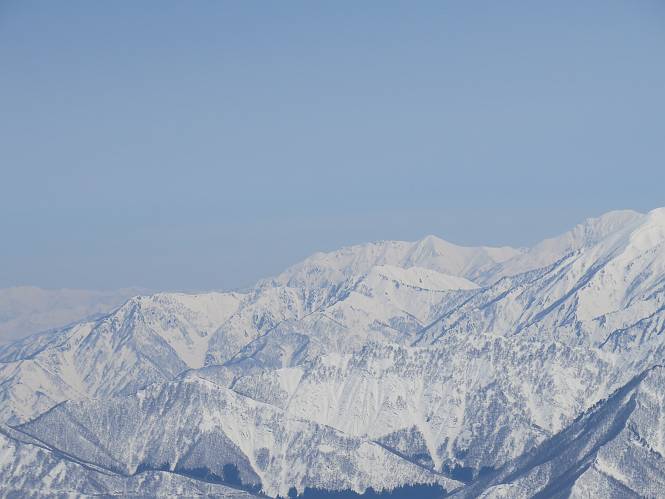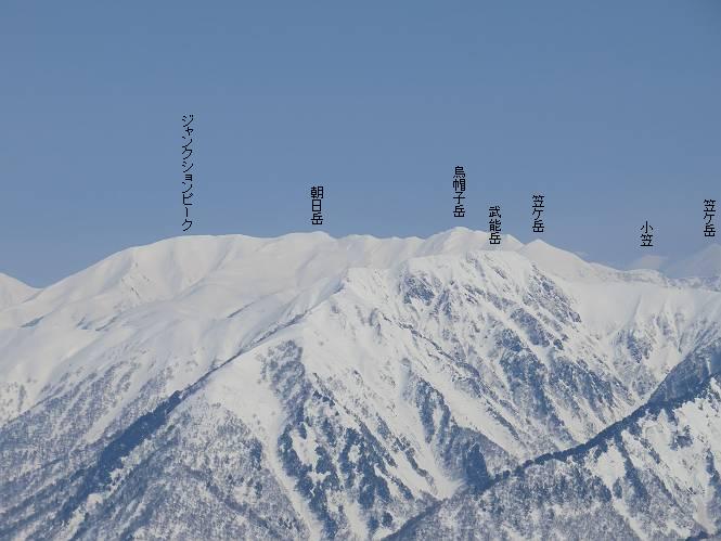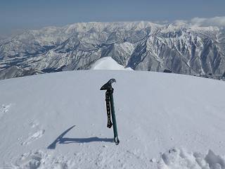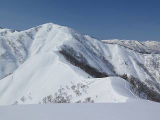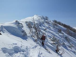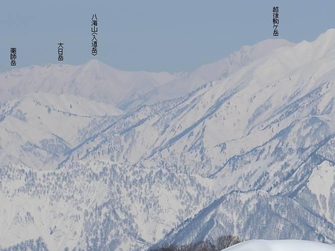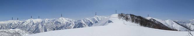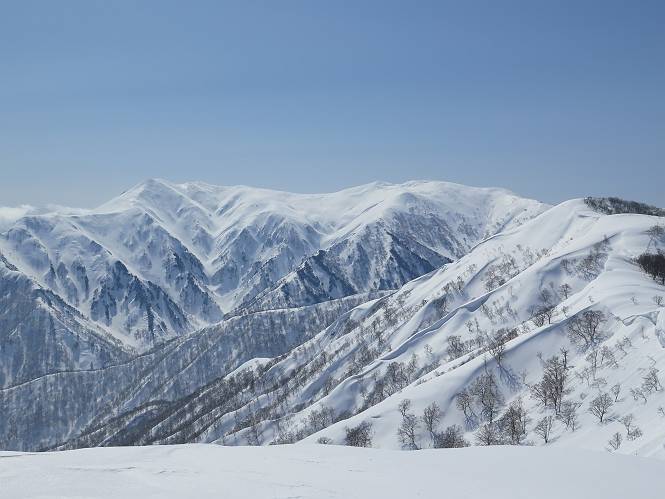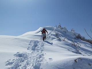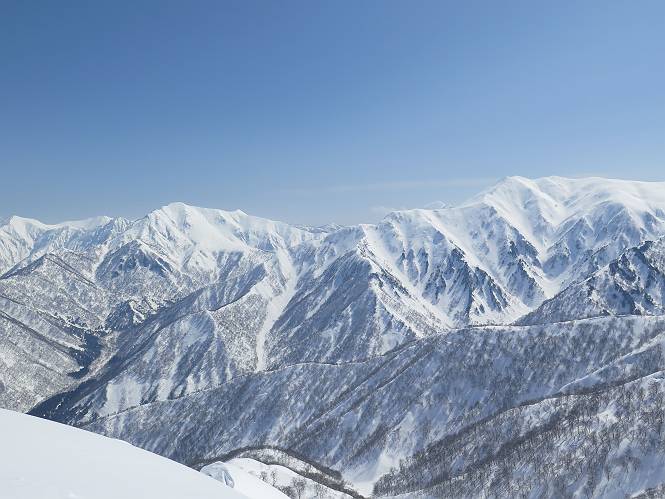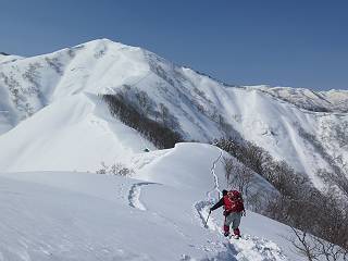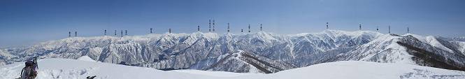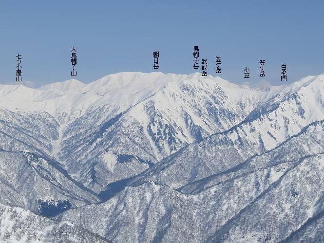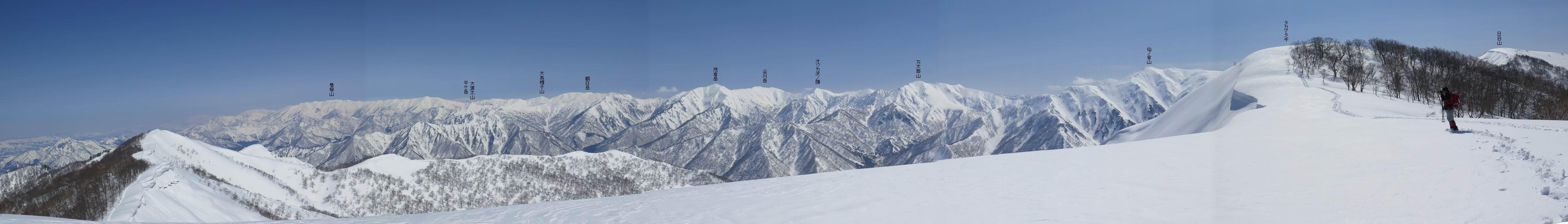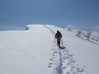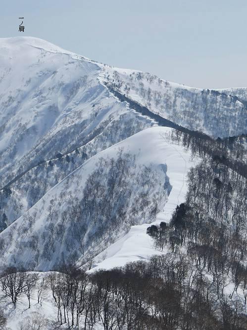 【2.棒立山⇒日白山】 【1.土樽⇒棒立山】 【3.日白山⇒二居】 棒立山を下り、尾根に張られたテントの横を通って、雑木林をかすめる。解け落ちる霧氷が首筋に、汗ばんだ体には、気持ちいい、ってところ。雑木から抜け、振り向くと良くもここまできたものよ、遙か下方に街並みが。雪の壁(ちょっと大げさかな)を上れば、タカマタギの手前のピーク、ちょっと早めの昼食をとる。tomoさんの担ぎ上げてきたお湯とそば、馳走になっちゃって、絶景を眺めながら頂いた、オイシイー、10:56-11:34。群馬県側の雲もとれ、山頂がほとんど顔を出す、皆そろってこんにちは。 棒立山を下って、小ピ^クを2つ、3つ越える、360度絶景コースである おやっ、どうしたのだろう 1.5m?、深い穴だ、スッポリ入ったら大変だ 小さいピークを越え 尾根上に張られたテントの横を通って進む 樹林帯をかすめて進む、気温が上がり霧氷がボタボタ落ちる タカマタギから派生する枝尾根の雪庇 画像クリック拡大 振り向けば、八海山と巻機山、棒立山 巻機山、棒立山 棒立山を背景に奮闘する私ですが、・・・・・ タカマタギの一つ手前のピーク直下 タカマタギ、一つ手前のピーク着、絶景をオカズに、ここで昼食 休憩ポイントから八海山〜日白山 画像クリック拡大 同、万太郎山〜苗場山 画像クリック拡大 同、左回りで、苗場山 苗場山アップ 中央奥に佐武流山、手前右は東谷山 手前中央は東谷山 左がタカマタギ、その右が日白山 右手前がタカマタギ、奥の右が平標山、左が仙ノ倉山 万太郎山 オジカ沢ノ頭、右奥が俎(マナイタ)ー 茂倉岳、右が谷川岳(左がオキノ耳、右がトマノ耳) 手前の山頂に雲のかかった武能岳、奥が朝日岳 手前左よりが大源太山、左の一番奥が平ケ岳 中央奥に巻機山、左奥に八海山 八海山を拡大 同ピークで、 お腹もいっぱい、いざタカマギへ! 下りにかかると、アイゼンの雪落としに悩む、高下駄ほどに成長し、そして滑る、仕方なくピッケルでフレームを叩く。落ちても一時、繰り返しの作業だ。外してしまえ!、軽くなった、ピッケルでカバーしながら歩けばいい。tomoさんが、雪庇の上から「come on」、素晴らしい雪庇にカメラは踊る。 休憩したピークからタカマタギへ この間の雪庇は見どころ 雪庇の間から白い山並みを 画像クリック拡大 雪庇の間から白い山並みを 画像クリック拡大 気温の上昇でアイゼンはダンゴ状に、危険を感じ外す 歩きだすと、tomoさんが“絶景”、と雪庇の上から呼ぶ ヨーシ、何が見えるかな? これはスゴイ、波が凍ったような形だ これは見事だ、本日、見た中で一番迫力があるかな 雪庇の間から白い山並みを 画像クリック拡大 こんな光景がタカマタギとの間に連続する 雪庇の間から白い山並みを 画像クリック拡大 雪庇の間から白い山並みを 画像クリック拡大 この辺の新雪は40cmほどありそう 見るものは見て、全部タダよ ラスト登坂でタカマタギへ タカマタギ山頂からの眺望、巻機山〜日白山 画像クリック拡大 タカマタギ山頂からの眺望、平標山〜苗場山、東谷山 画像クリック拡大 右回りで、八海山、巻機山方面 万太郎山、仙ノ倉山方面 仙ノ倉山、平標山方面 日白山 日白山、山頂に4,5人いるぞ 連なる雪庇を楽しみながら、直下の急斜面を上がれば、タカマタギの山頂である、12:23。ここも素晴らしいポイントであるが、先ほど休憩したポイントはタカマタギがピークとして見えるので、良いかな? 日白山の山頂には4,5人の人影、本日の最高峰、ここまで来れば日白山は目と鼻の先、もう、後から来る人もなさそうだし、快適な雪尾根ハイクを楽しもう。 日白山を目に前に、早く山頂を踏みたい気持ちもあるが、時間はあるし、折角の好天なのだからゆっくり楽しみたい。偶然とは言え、山の神から頂いた、本日の眺望、脳裏に焼き付けて、写真も沢山撮って行こう。多分、tomoさんも同じようなことを考えていることでしょう。情報は共有できても、生の景色をみないと記憶が消えてしまう、悔しいかな歳には勝てない。だから、五感を働かせて、あれも、これもいろんな形で取り込んで帰り、明日の糧にしている。 雪庇歩きのモデル、好天、安全・・・・、このルートの半分以上がこんな感じで歩けます。 雪庇の間から山並みを見つめ、山座同定 画像クリック拡大 トレースは雪庇先端から大分離れてますね、どうしてこんな形に? 雪庇崩壊のメカニズムは? 上の雪庇を反対方向から見てます 日白山直下を行く 直下の眺望 画像クリック拡大 やっとこ、山頂に着きました まず、平標山に伸びる尾根に見入る私 ゆっくり遊びながら山頂を踏む、12:54-13:23。二人にとって、1年ぶりの日白山山頂です。まず、平標一ノ肩、までのルートを目で追ってしまいました。新雪ですっかり化粧され、きれいですね。途中のピークまでトレースがありますが、その先は? この尾根から、二居に伸びるシュプールが斜面に描かれています。斜面をキャンバスに見立て、木々とシュプール、&人影、って、ダイナミッ
