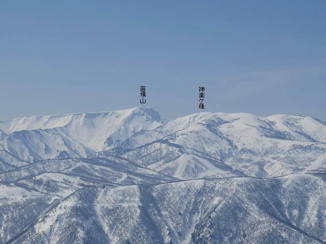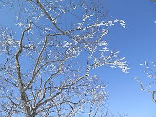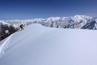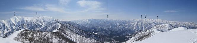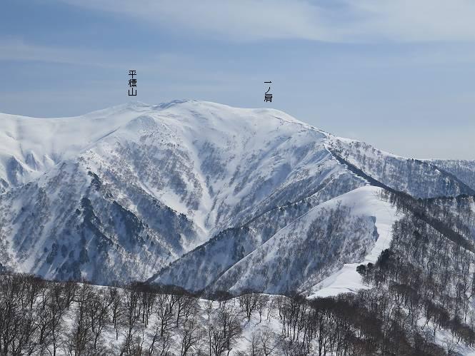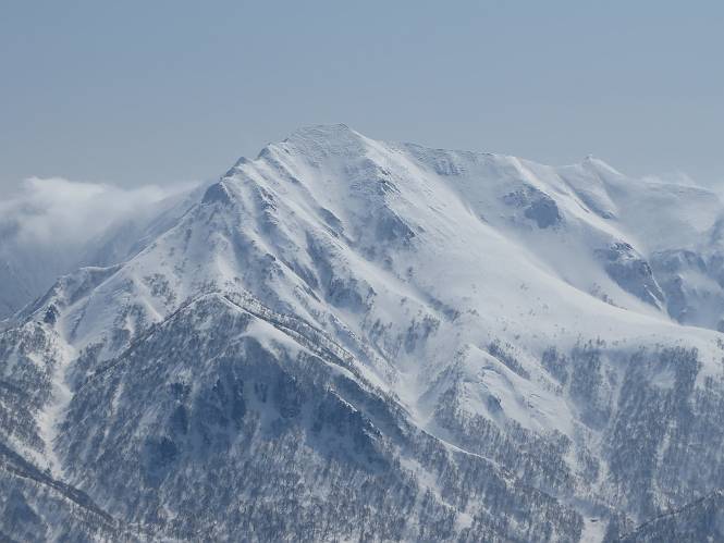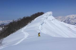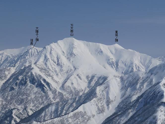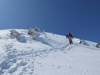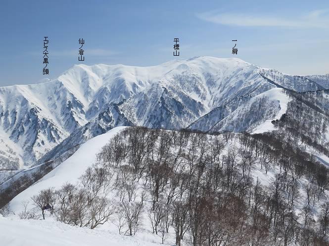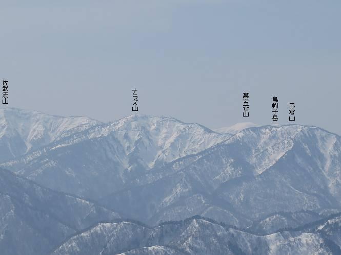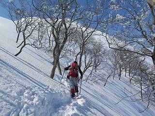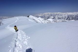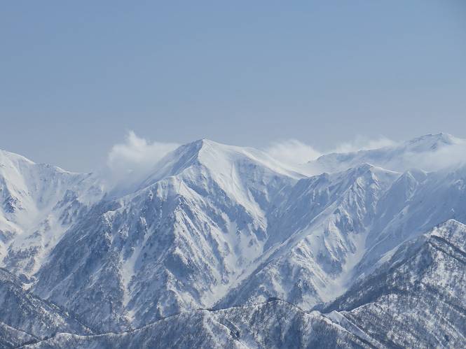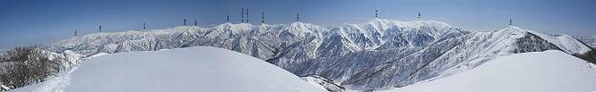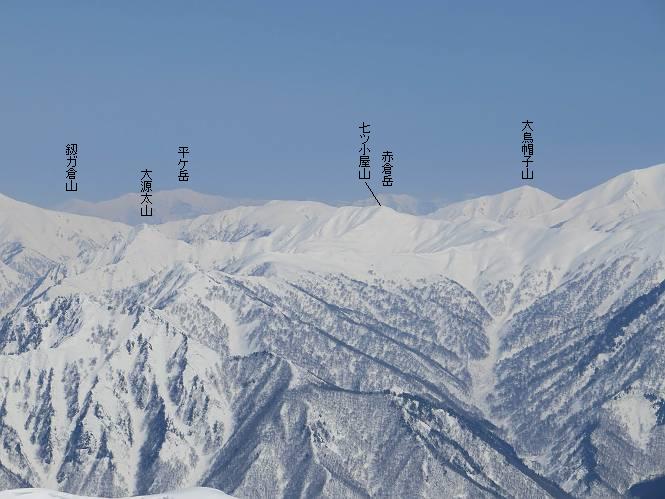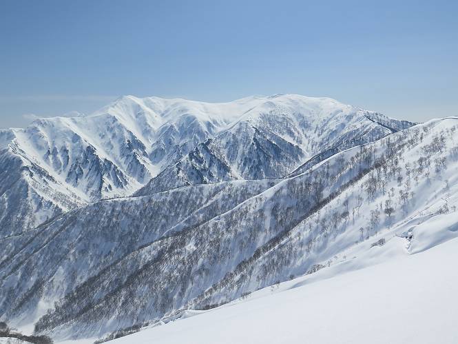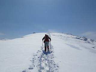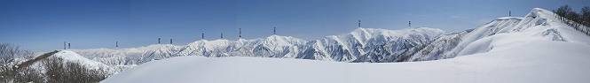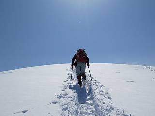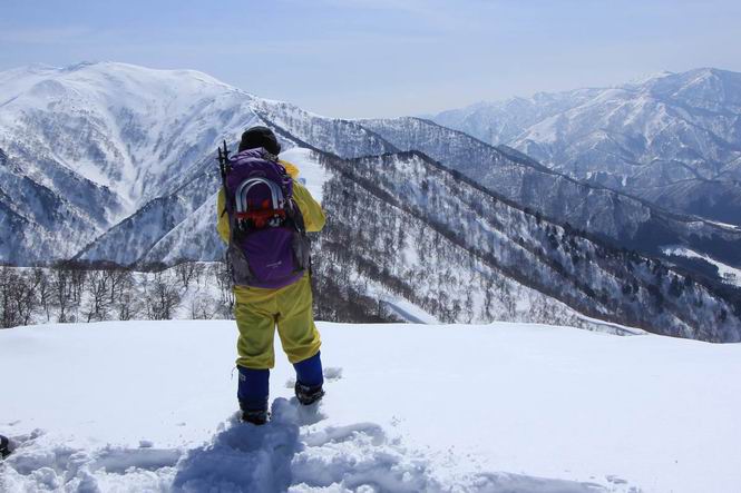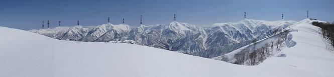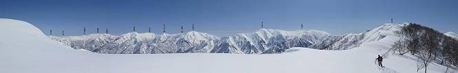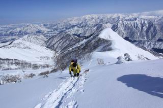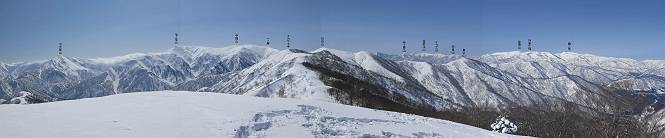 【2.棒立山⇒日白山】 【1.土樽⇒棒立山】 【3.日白山⇒二居】 棒立山を下り、尾根に張られたテントの横を通って、雑木林をかすめる。解け落ちる霧氷が首筋に、汗ばんだ体には、気持ちいい、ってところ。雑木から抜け、振り向くと良くもここまできたものよ、遙か下方に街並みが。雪の壁(ちょっと大げさかな)を上れば、タカマタギの手前のピーク、ちょっと早めの昼食をとる。tomoさんの担ぎ上げてきたお湯とそば、馳走になっちゃって、絶景を眺めながら頂いた、オイシイー、10:56-11:34。群馬県側の雲もとれ、山頂がほとんど顔を出す、皆そろってこんにちは。 棒立山を下って、小ピ^クを2つ、3つ越える、360度絶景コースである おやっ、どうしたのだろう 1.5m?、深い穴だ、スッポリ入ったら大変だ 小さいピークを越え 尾根上に張られたテントの横を通って進む 樹林帯をかすめて進む、気温が上がり霧氷がボタボタ落ちる タカマタギから派生する枝尾根の雪庇 画像クリック拡大 振り向けば、八海山と巻機山、棒立山 巻機山、棒立山 棒立山を背景に奮闘する私ですが、・・・・・ タカマタギの一つ手前のピーク直下 タカマタギ、一つ手前のピーク着、絶景をオカズに、ここで昼食 休憩ポイントから八海山〜日白山 画像クリック拡大 同、万太郎山〜苗場山 画像クリック拡大 同、左回りで、苗場山 苗場山アップ 中央奥に佐武流山、手前右は東谷山 手前中央は東谷山 左がタカマタギ、その右が日白山 右手前がタカマタギ、奥の右が平標山、左が仙ノ倉山 万太郎山 オジカ沢ノ頭、右奥が俎(マナイタ)ー 茂倉岳、右が谷川岳(左がオキノ耳、右がトマノ耳) 手前の山頂に雲のかかった武能岳、奥が朝日岳 手前左よりが大源太山、左の一番奥が平ケ岳 中央奥に巻機山、左奥に八海山 八海山を拡大 同ピークで、 お腹もいっぱい、いざタカマギへ! 下りにかかると、アイゼンの雪落としに悩む、高下駄ほどに成長し、そして滑る、仕方なくピッケルでフレームを叩く。落ちても一時、繰り返しの作業だ。外してしまえ!、軽くなった、ピッケルでカバーしながら歩けばいい。tomoさんが、雪庇の上から「come on」、素晴らしい雪庇にカメラは踊る。 休憩したピークからタカマタギへ この間の雪庇は見どころ 雪庇の間から白い山並みを 画像クリック拡大 雪庇の間から白い山並みを 画像クリック拡大 気温の上昇でアイゼンはダンゴ状に、危険を感じ外す 歩きだすと、tomoさんが“絶景”、と雪庇の上から呼ぶ ヨーシ、何が見えるかな? これはスゴイ、波が凍ったような形だ これは見事だ、本日、見た中で一番迫力があるかな 雪庇の間から白い山並みを 画像クリック拡大 こんな光景がタカマタギとの間に連続する 雪庇の間から白い山並みを 画像クリック拡大 雪庇の間から白い山並みを 画像クリック拡大 この辺の新雪は40cmほどありそう 見るものは見て、全部タダよ ラスト登坂でタカマタギへ タカマタギ山頂からの眺望、巻機山〜日白山 画像クリック拡大 タカマタギ山頂からの眺望、平標山〜苗場山、東谷山 画像クリック拡大 右回りで、八海山、巻機山方面 万太郎山、仙ノ倉山方面 仙ノ倉山、平標山方面 日白山 日白山、山頂に4,5人いるぞ 連なる雪庇を楽しみながら、直下の急斜面を上がれば、タカマタギの山頂である、12:23。ここも素晴らしいポイントであるが、先ほど休憩したポイントはタカマタギがピークとして見えるので、良いかな? 日白山の山頂には4,5人の人影、本日の最高峰、ここまで来れば日白山は目と鼻の先、もう、後から来る人もなさそうだし、快適な雪尾根ハイクを楽しもう。 日白山を目に前に、早く山頂を踏みたい気持ちもあるが、時間はあるし、折角の好天なのだからゆっくり楽しみたい。偶然とは言え、山の神から頂いた、本日の眺望、脳裏に焼き付けて、写真も沢山撮って行こう。多分、tomoさんも同じようなことを考えていることでしょう。情報は共有できても、生の景色をみないと記憶が消えてしまう、悔しいかな歳には勝てない。だから、五感を働かせて、あれも、これもいろんな形で取り込んで帰り、明日の糧にしている。 雪庇歩きのモデル、好天、安全・・・・、このルートの半分以上がこんな感じで歩けます。 雪庇の間から山並みを見つめ、山座同定 画像クリック拡大 トレースは雪庇先端から大分離れてますね、どうしてこんな形に? 雪庇崩壊のメカニズムは? 上の雪庇を反対方向から見てます 日白山直下を行く 直下の眺望 画像クリック拡大 やっとこ、山頂に着きました まず、平標山に伸びる尾根に見入る私 ゆっくり遊びながら山頂を踏む、12:54-13:23。二人にとって、1年ぶりの日白山山頂です。まず、平標一ノ肩、までのルートを目で追ってしまいました。新雪ですっかり化粧され、きれいですね。途中のピークまでトレースがありますが、その先は? この尾根から、二居に伸びるシュプールが斜面に描かれています。斜面をキャンバスに見立て、木々とシュプール、&人影、って、ダイナミッ