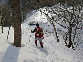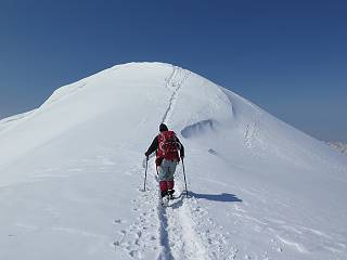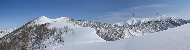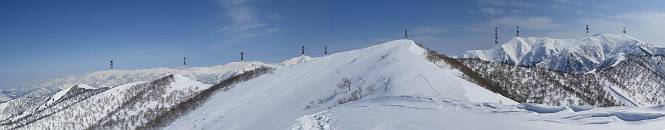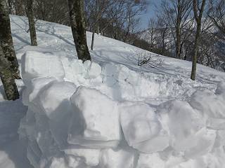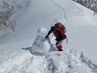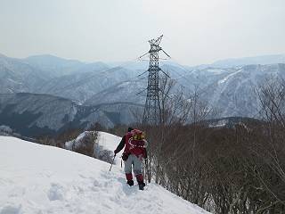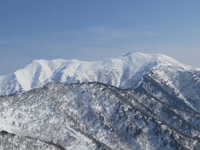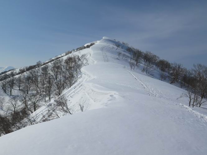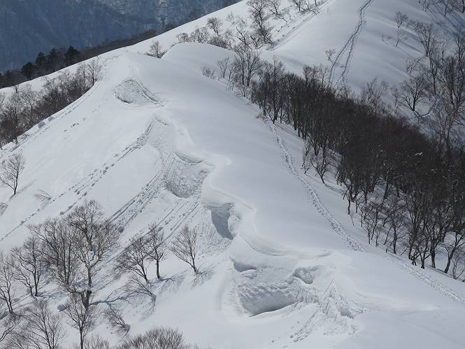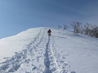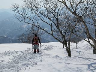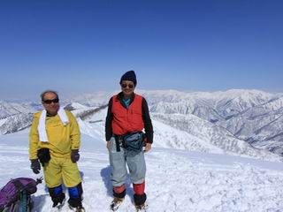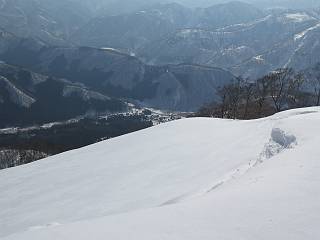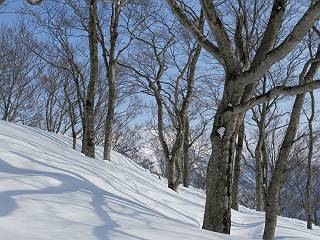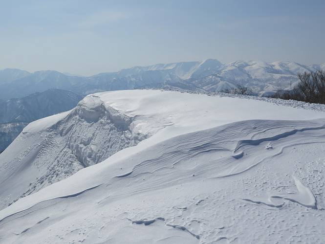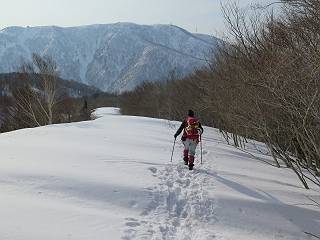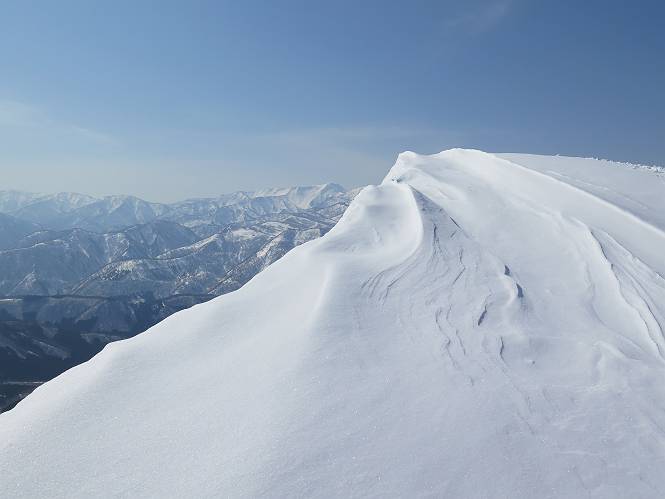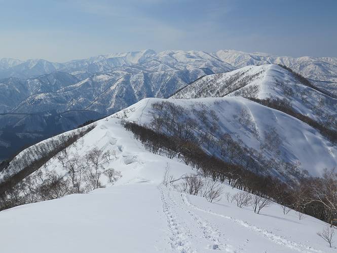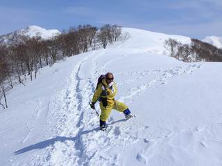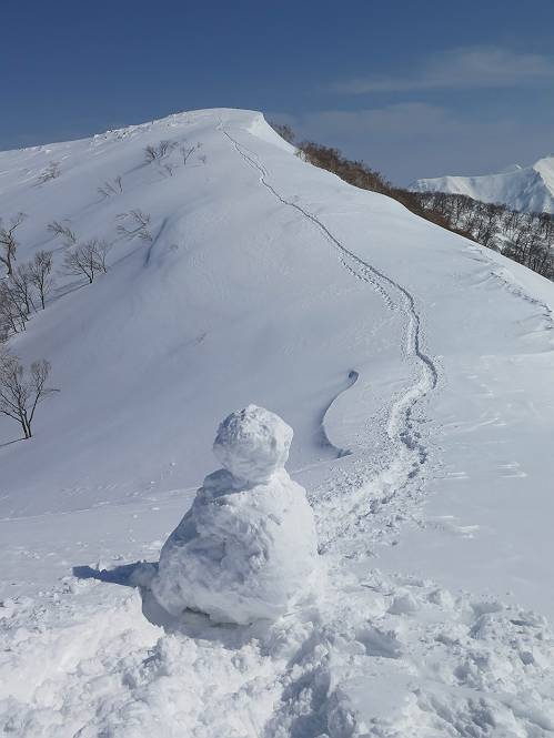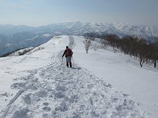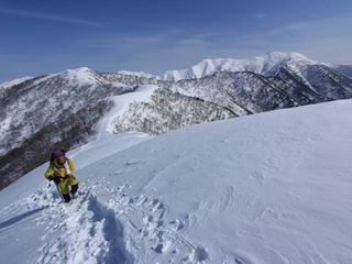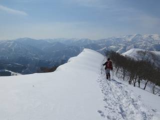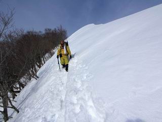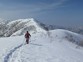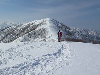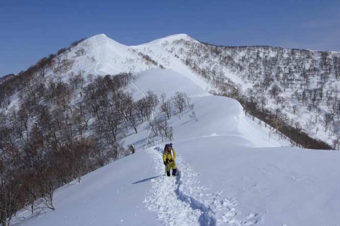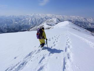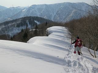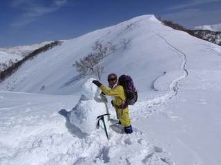【3.日白山⇒二居】 【1.土樽⇒棒立山】 【2.棒立山⇒日白山】 日白山の眺望と別れ、西方向に下る、中間に一山あって、最後のピーク東谷山へと通じる。苗場山を正面に、振り返っては平標山・仙ノ倉山の山塊、広々した雪原は、本コース最高の遊び場だ。雪ダルマを転がし、ピッケルの先に雪を丸め喉を癒す、楽しいね、14:22東谷山着。 居合わせたスキーヤーにシャッターをお願いして・・ 日白山を西方向に下る 次の小ピークの下に雪塊を発見 共同作業で一回り大きくして tomoさんが頭を作って出来上がり 雪ダルマ様と、早速、日白山をバックに記念写真を どうですかな、日白山とのバランス 小ピークを下って、また上って・・・、苗場山を背景に雪庇 日白山を振り返って 画像クリック拡大 苗場山を背景に、中間に一つ、その向こうが東谷山 雪庇崩落の初期かな、小さな雪塊がコロコロと・・・ 雄大な景色を眺めながらの下り そして登り返して ピークで、日白山を振り返る 画像クリック拡大 広々した雪原を歩いて・・・ 中間のピークから東谷山 東谷山山頂へ、大きく登り返す 水がきれた、ピッケルを軸にスノーキャンディ もう少しだ 東谷山山頂へ到着です 東谷山山頂から日白山方面の眺望 画像クリック拡大 同、平標山&仙ノ倉山 同、西側、苗場山を望む 起伏の緩い雪原が続きます、ここから何十人のトレースが・・・ 山頂部西側から振り返って 画像クリック拡大 ここから最後の下り、急斜面もあり、滑り落ちたら大変だ、15:18鉄塔脇通過、少々緩やかになって、樹林帯と雪庇を行き来しながら下る、15:33二居峠着。峠から杉森の中、ツボ足状態の緩い坂、誰がつけたかトレースも適当、15:53二居峠入口へ。 ちょっと下ると 二居の集落が目に入る 二居集落アップ 平標山&仙ノ倉山 鉄塔を樹間に、ブナの森を下る 雪面に描かれた影絵も長く・・・ 雪囲い、幕営の跡でしょう 長い雪庇に沿って下る 雪壁のトラバースですね 鉄塔脇を通過、二居峠はもう近い 勾配が小さくなって・・・・雑木も終わる 東屋のある二居峠へ 二居集落を枝間に 杉森を下り 二居峠の入口に 集落を通り抜ければ 駐車場、お疲れ様でした ここから二居集落に入り、雪の道から舗装道路へ、大型バスが旅館の前に、○×ハイキング・・、と書かれていた、日白山かな? 16:00駐車スペースに着いて、コースを修了した。総所要時間は、9時間22分、お天気に恵まれ、新雪の後の山行、霧氷も見たし、真っ白な山並、言うことなし、春山に憧れる気持ち、わかるなあ。tomoさん、有難う、またね。タカマタギで頂いたそば、美味しかったよ。 【1.土樽⇒棒立山】 【2.棒立山⇒日白山】 当山行録の中で使用した私の写っている画像は、全てtomoさん提供です。 |